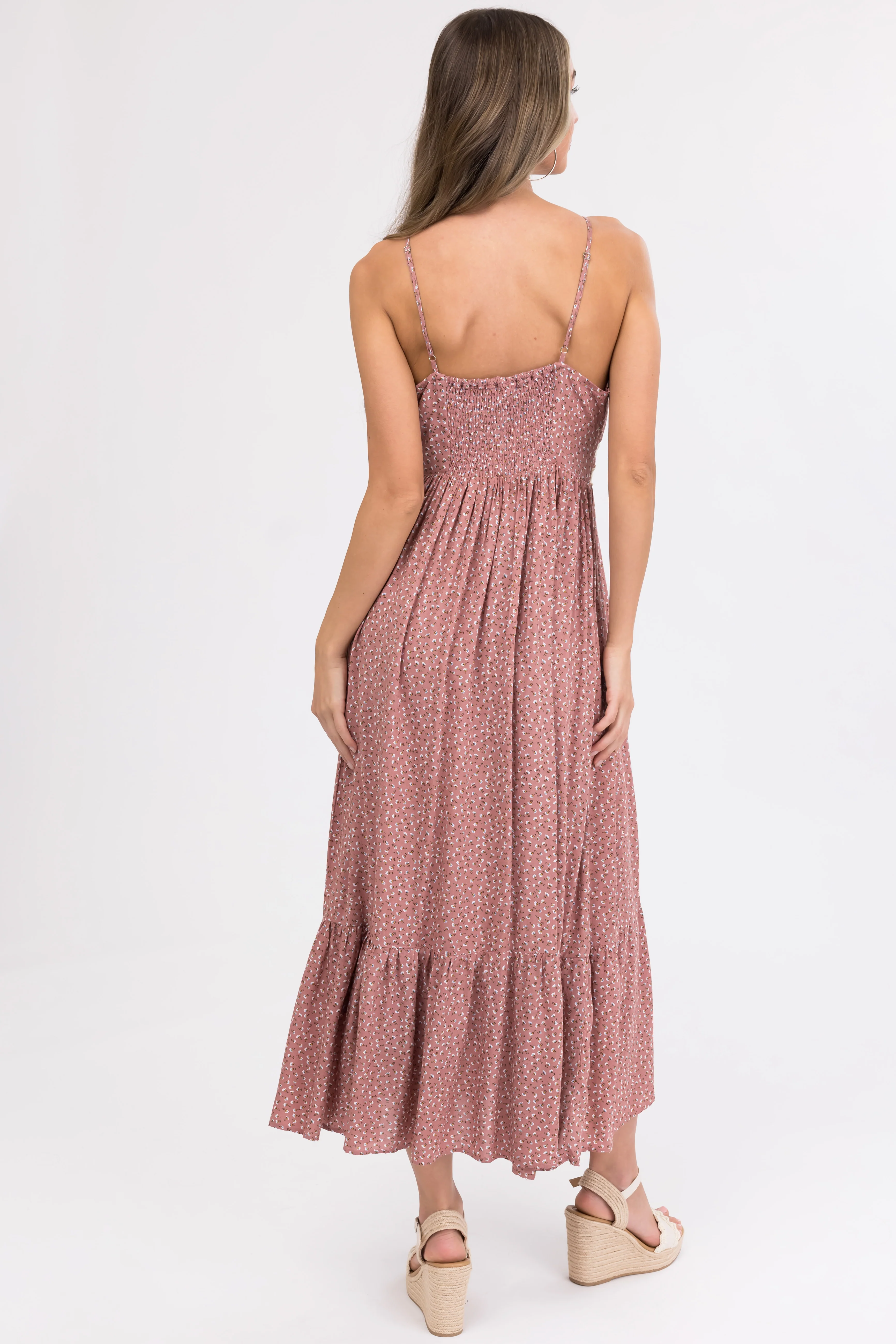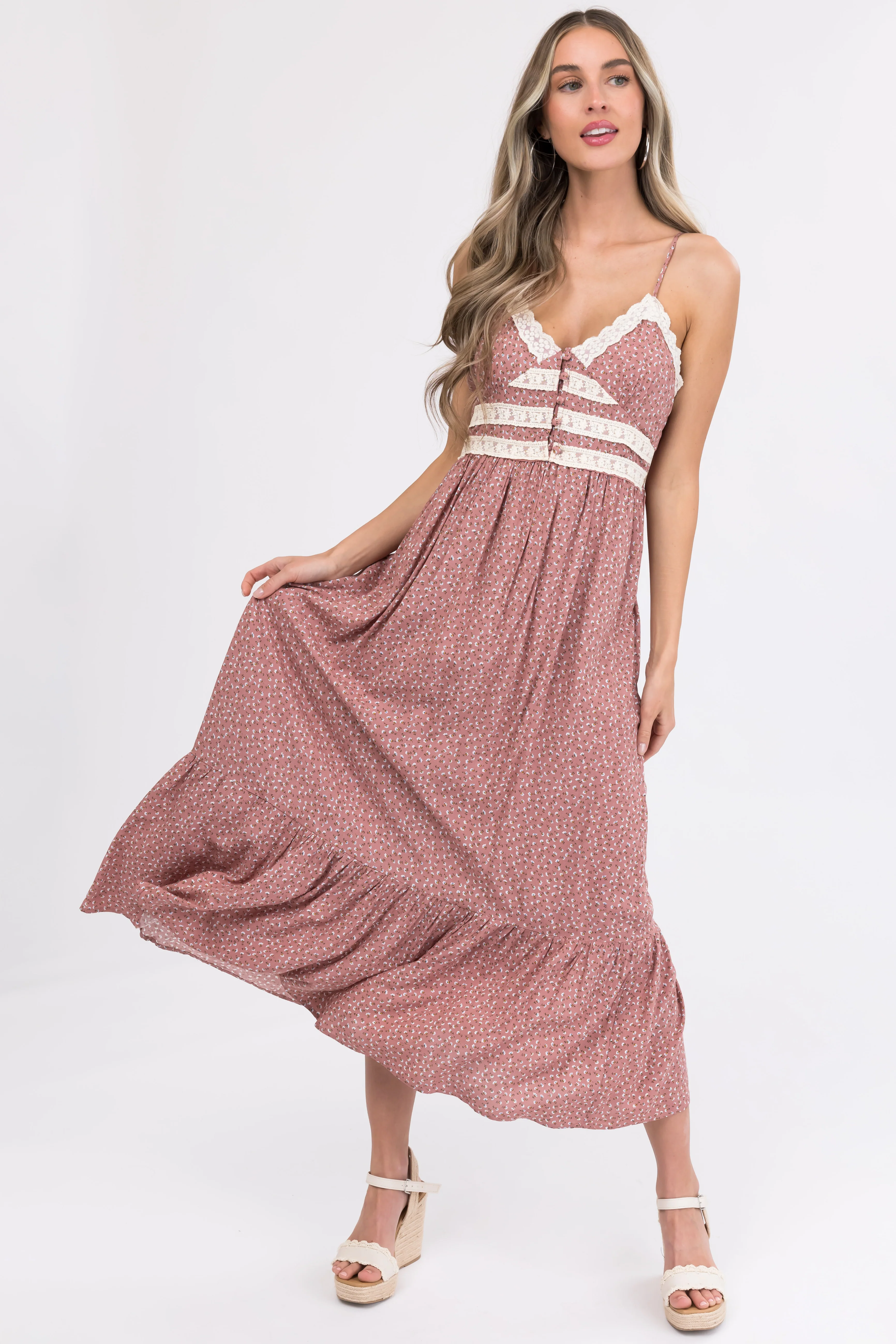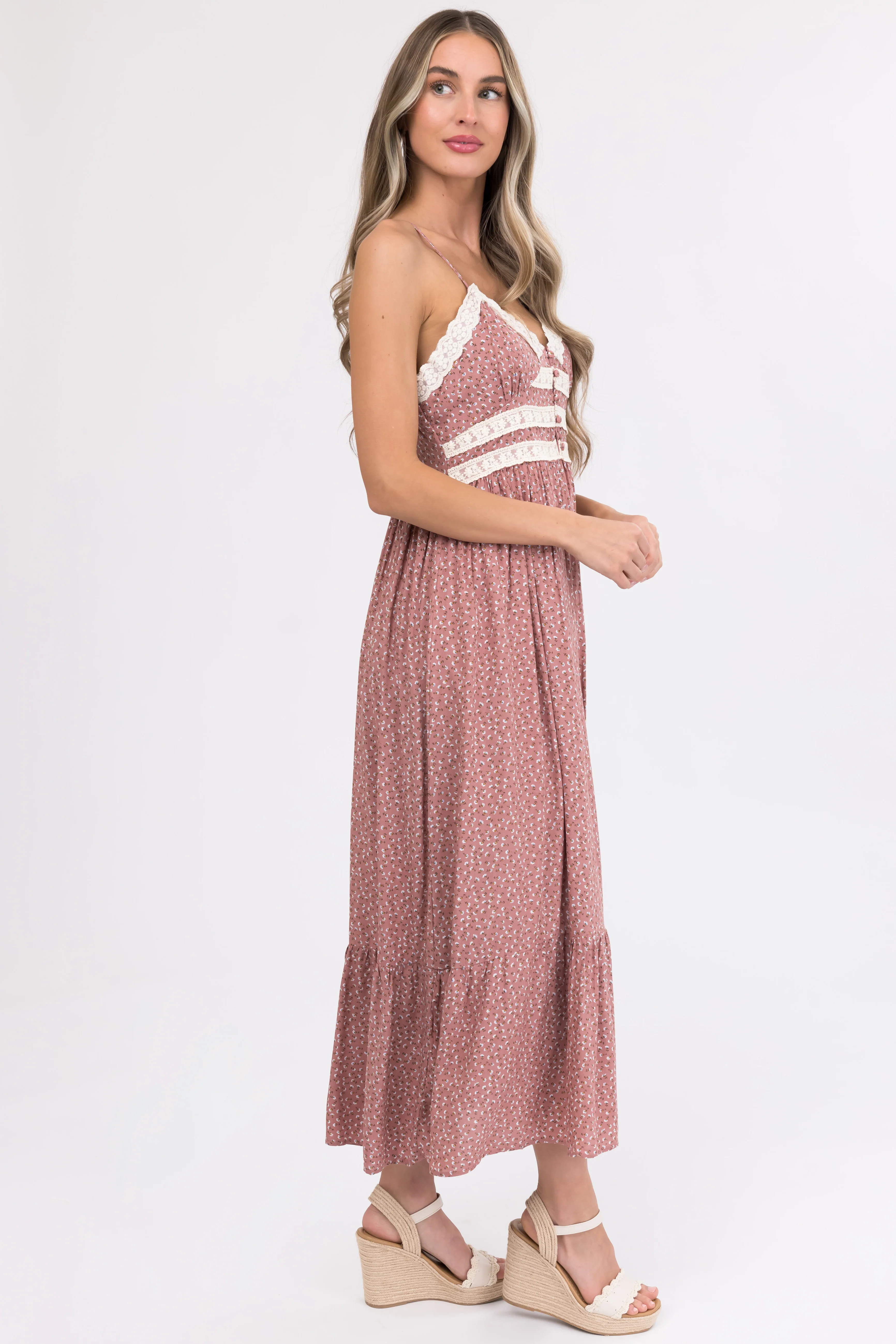 Dusty Rose Lace Trim Floral Maxi Dress