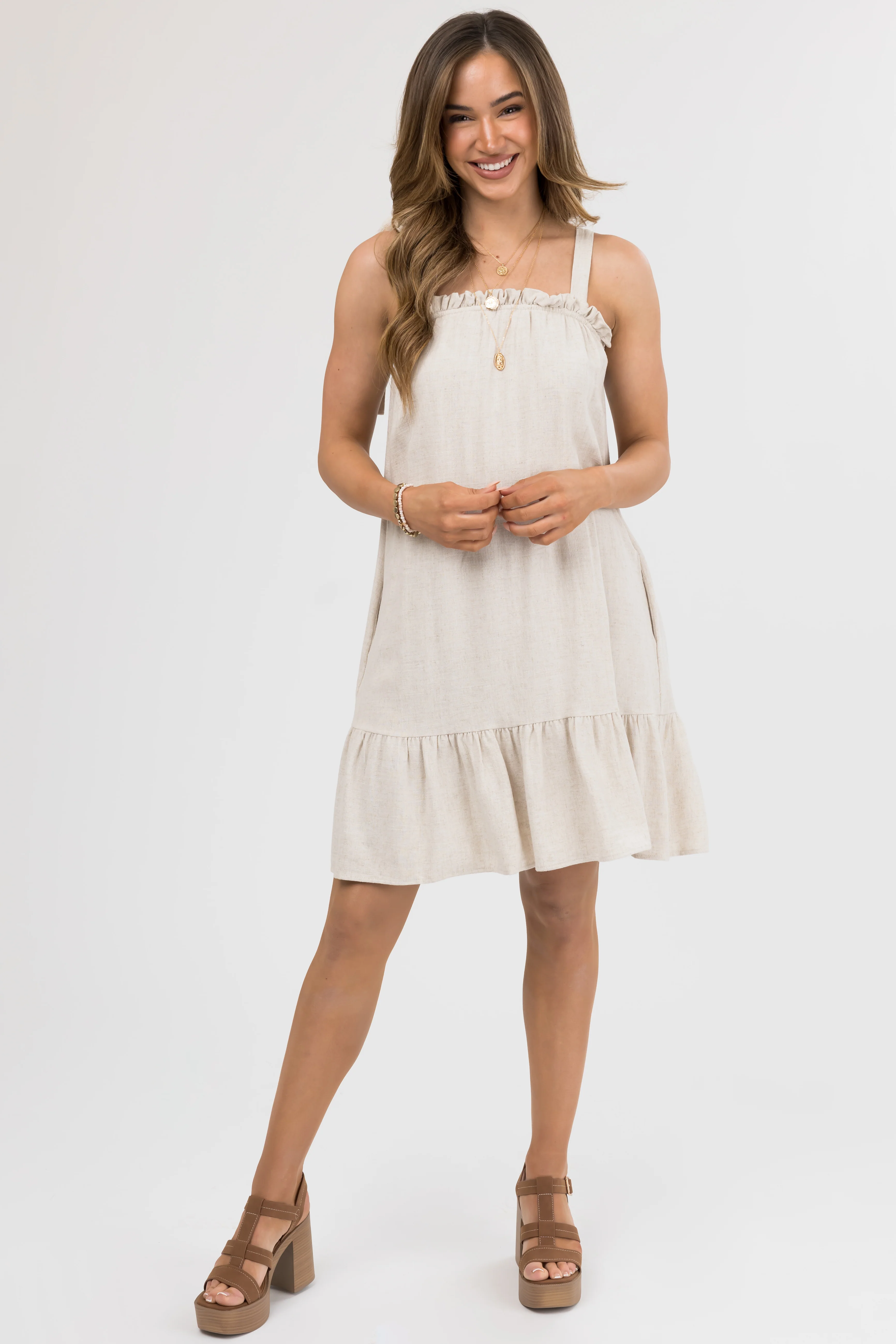 Sand Sleeveless Tie Strap Ruffle Mini Dress