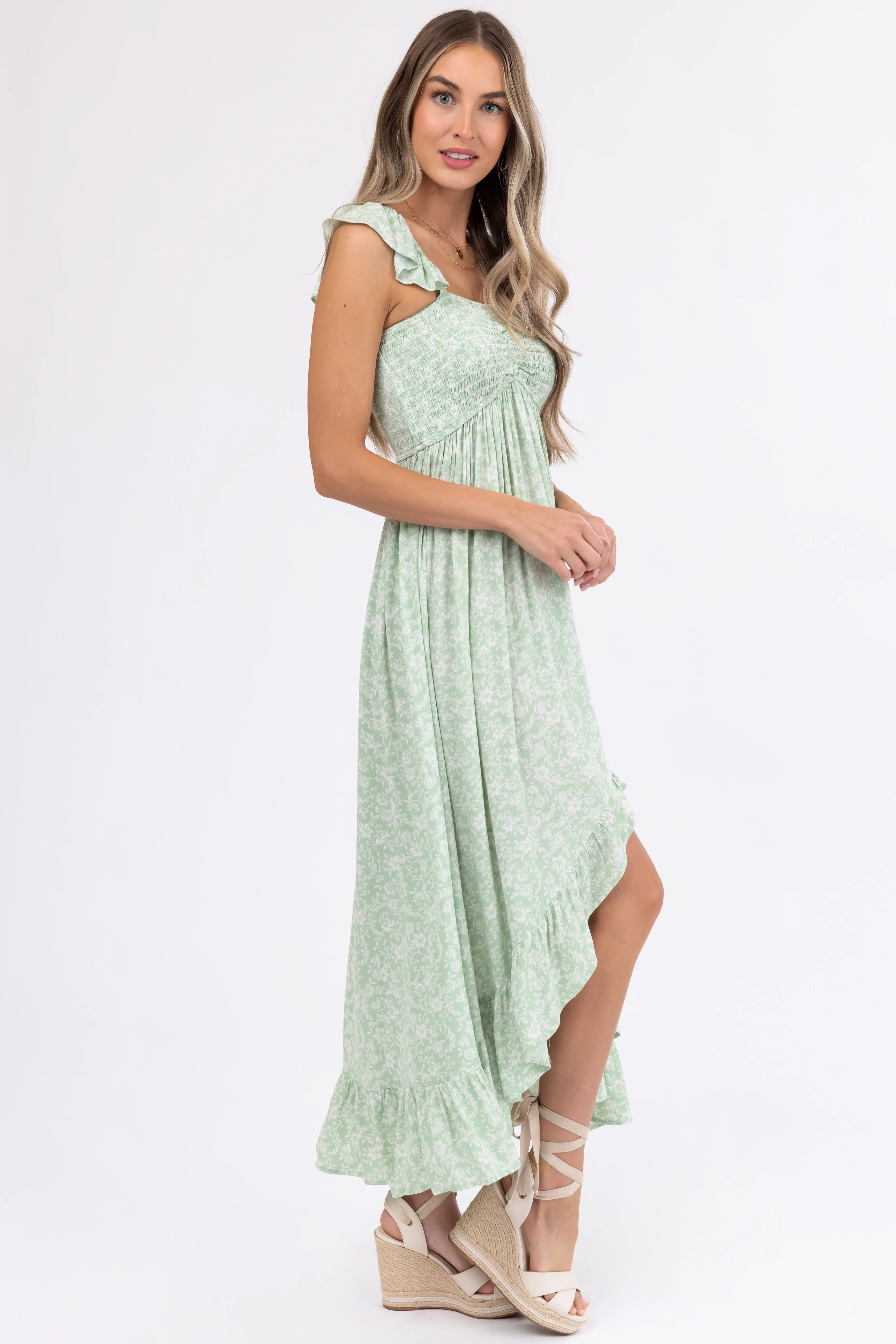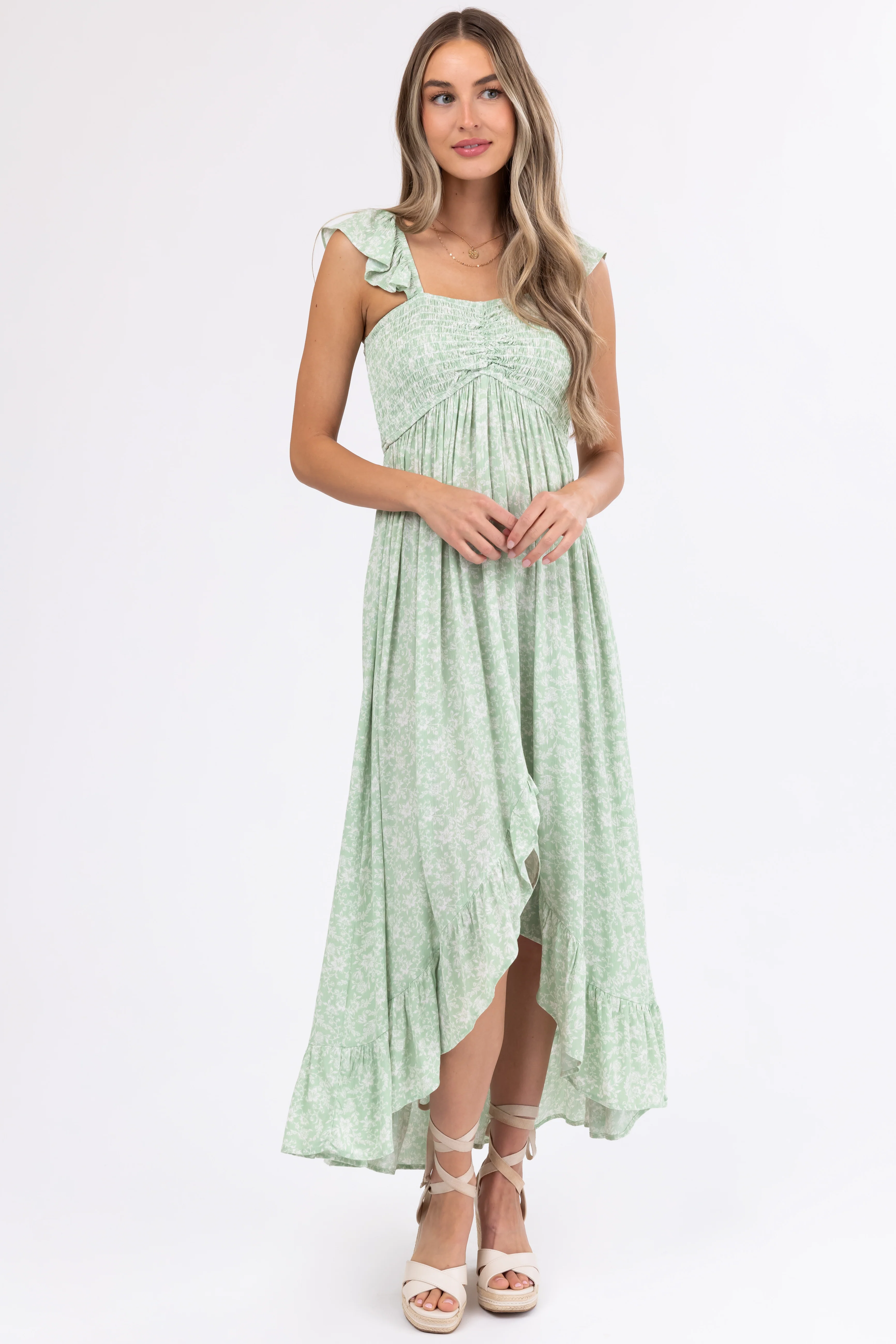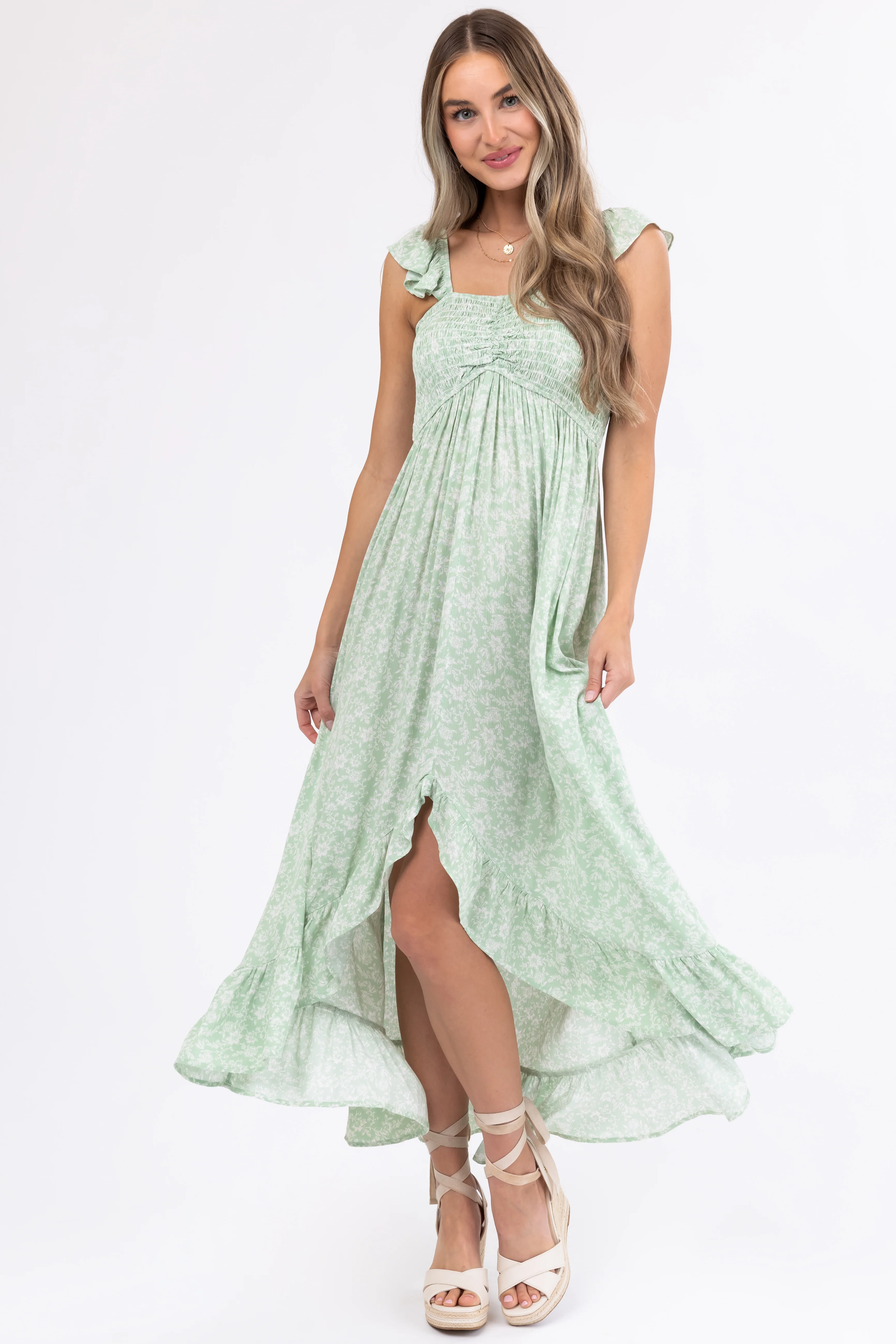 Sage Floral Print High Low Maxi Dress