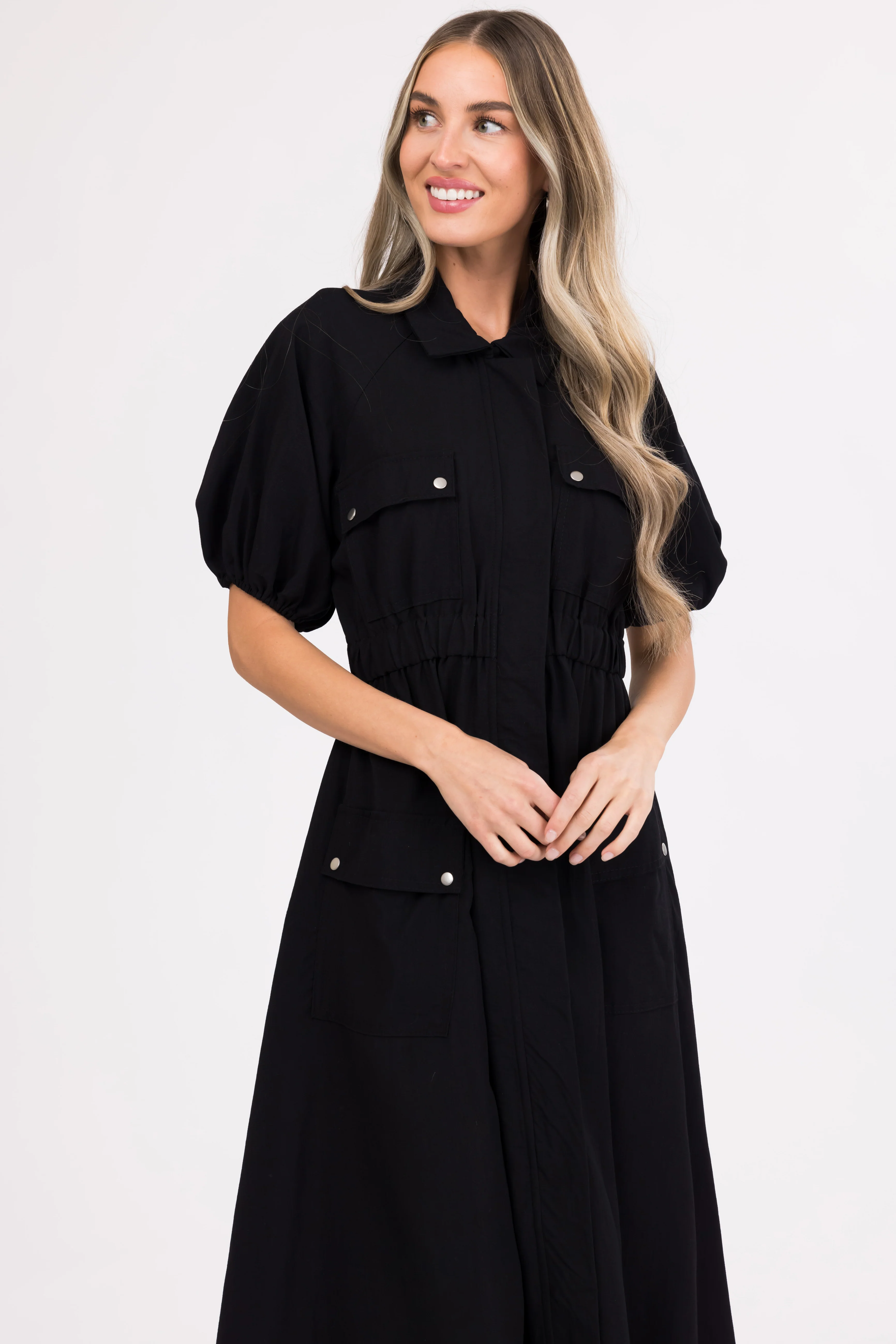 Black Zipper Front Maxi Shirt Dress