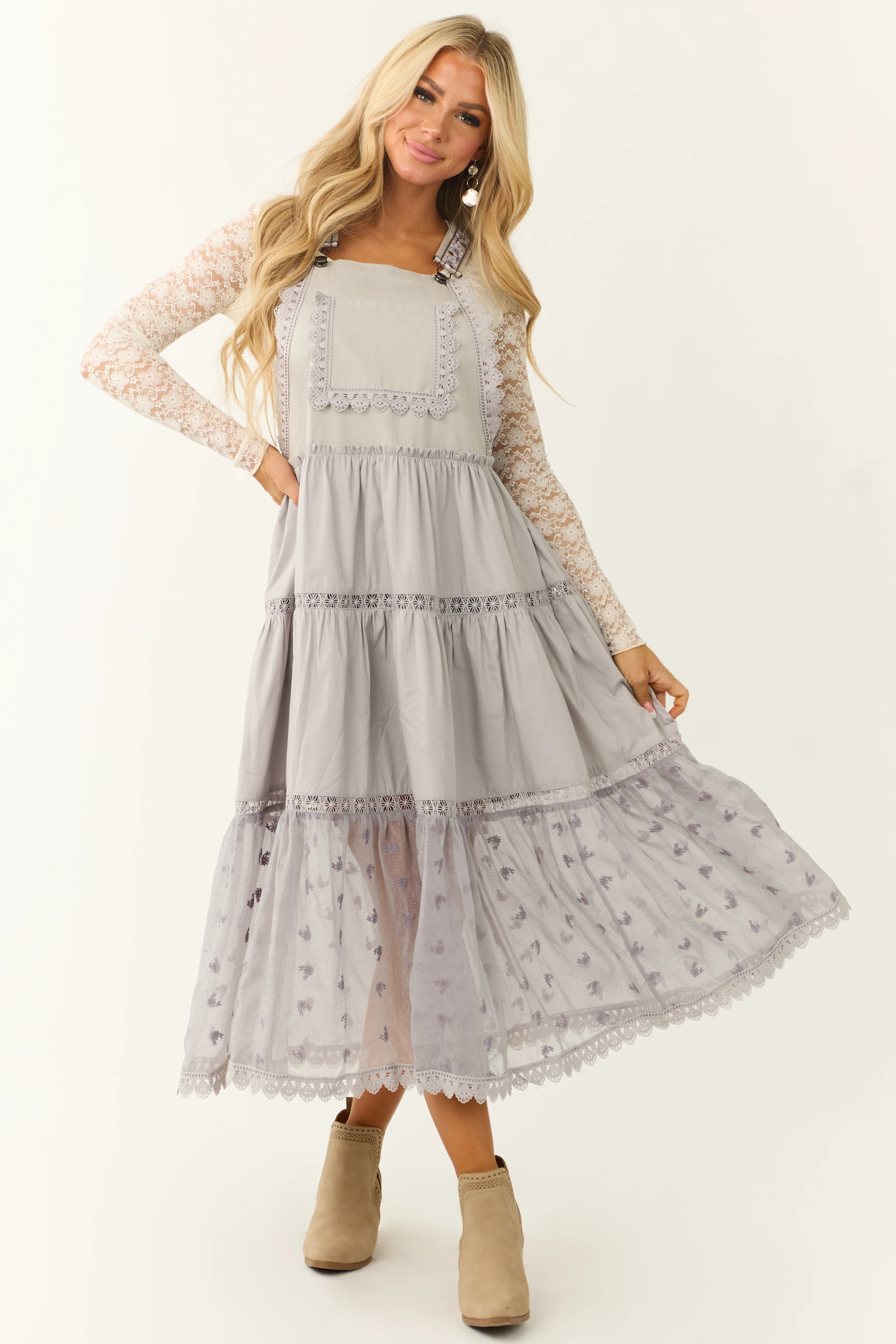 Heather Grey Lace Tiered Overalls Maxi Dress