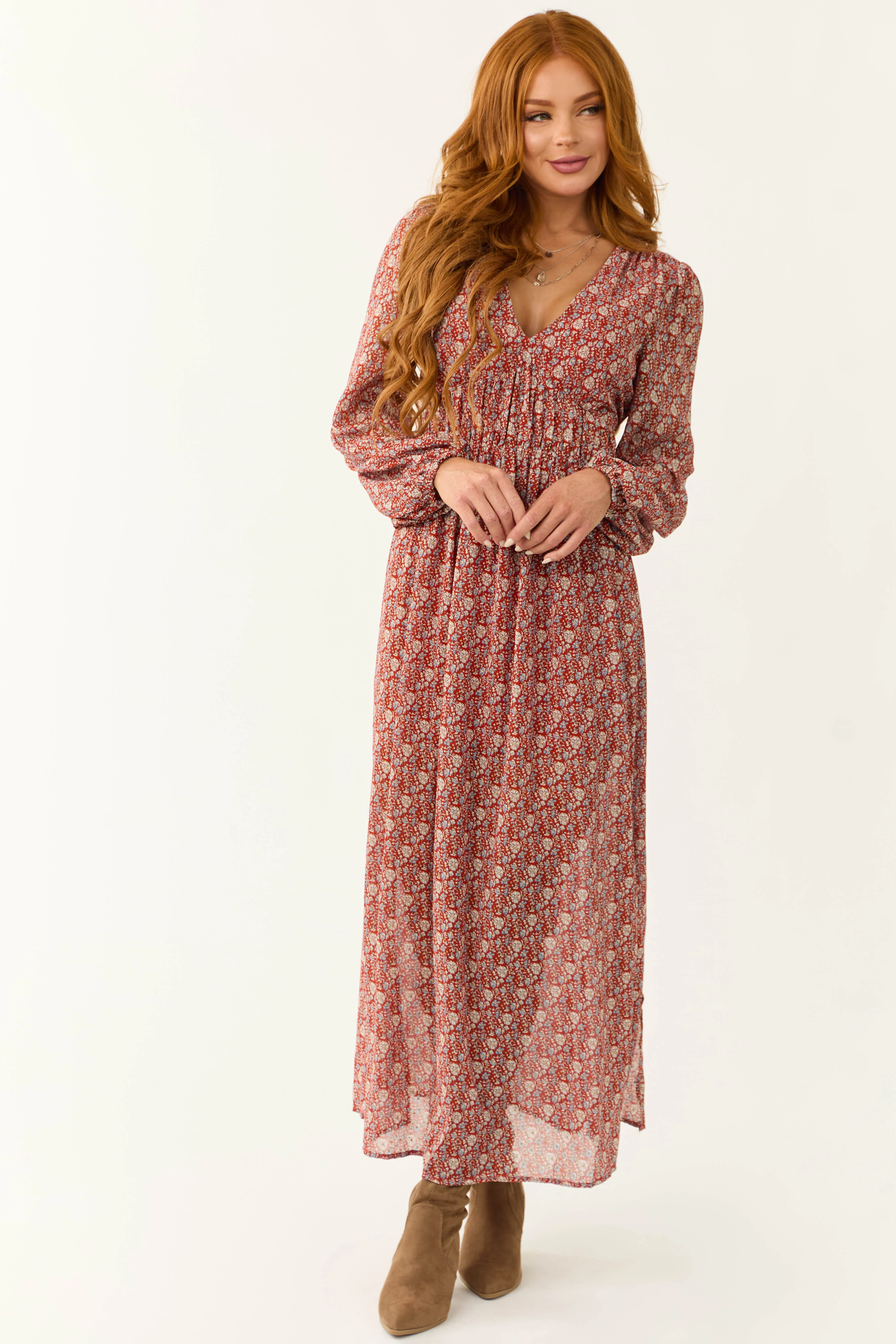 Burgundy Ditsy Floral Print Maxi Dress