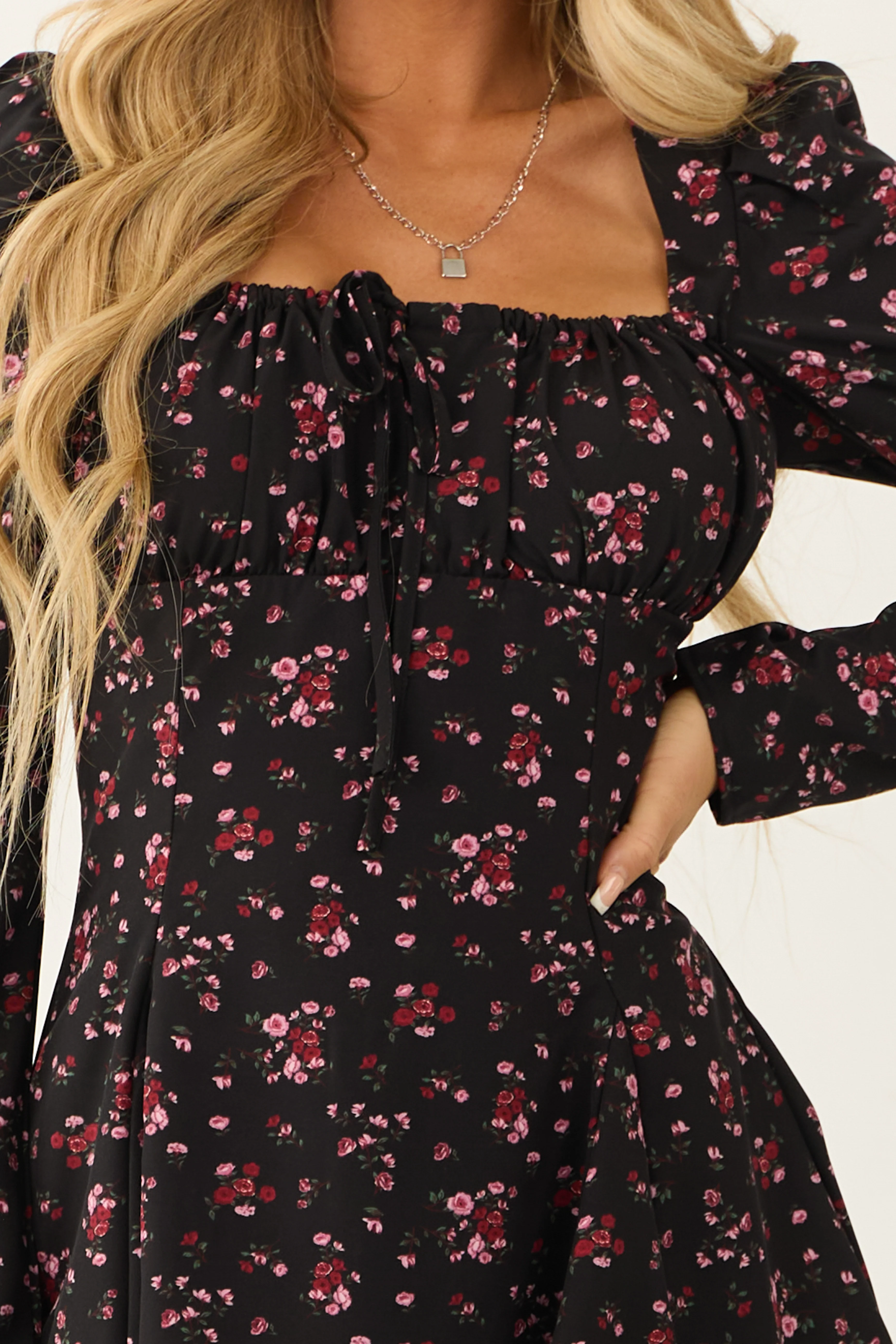 Black Long Sleeve Floral Print Mini Dress