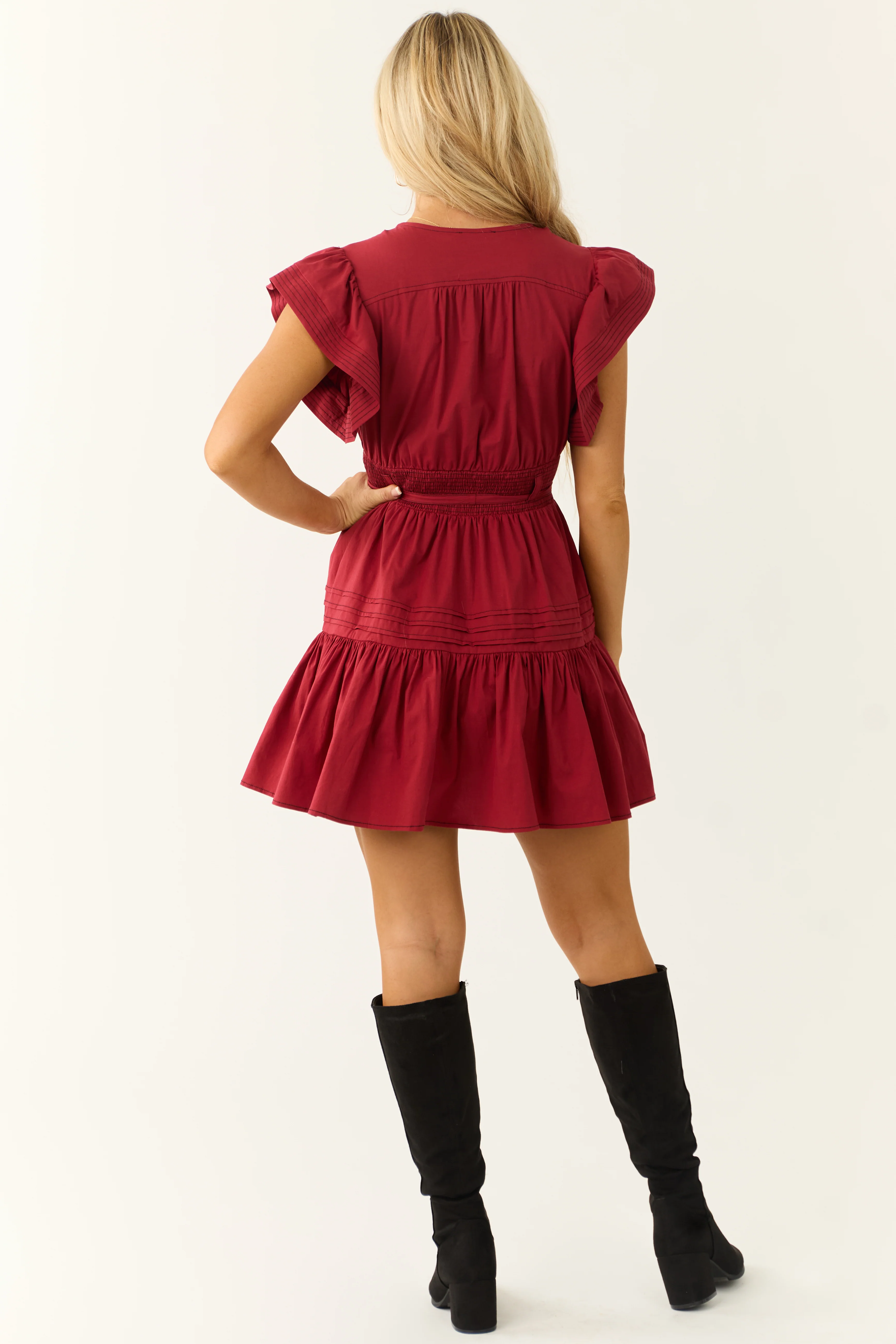 Maroon Ruffle Short Sleeve V Neck Mini Dress