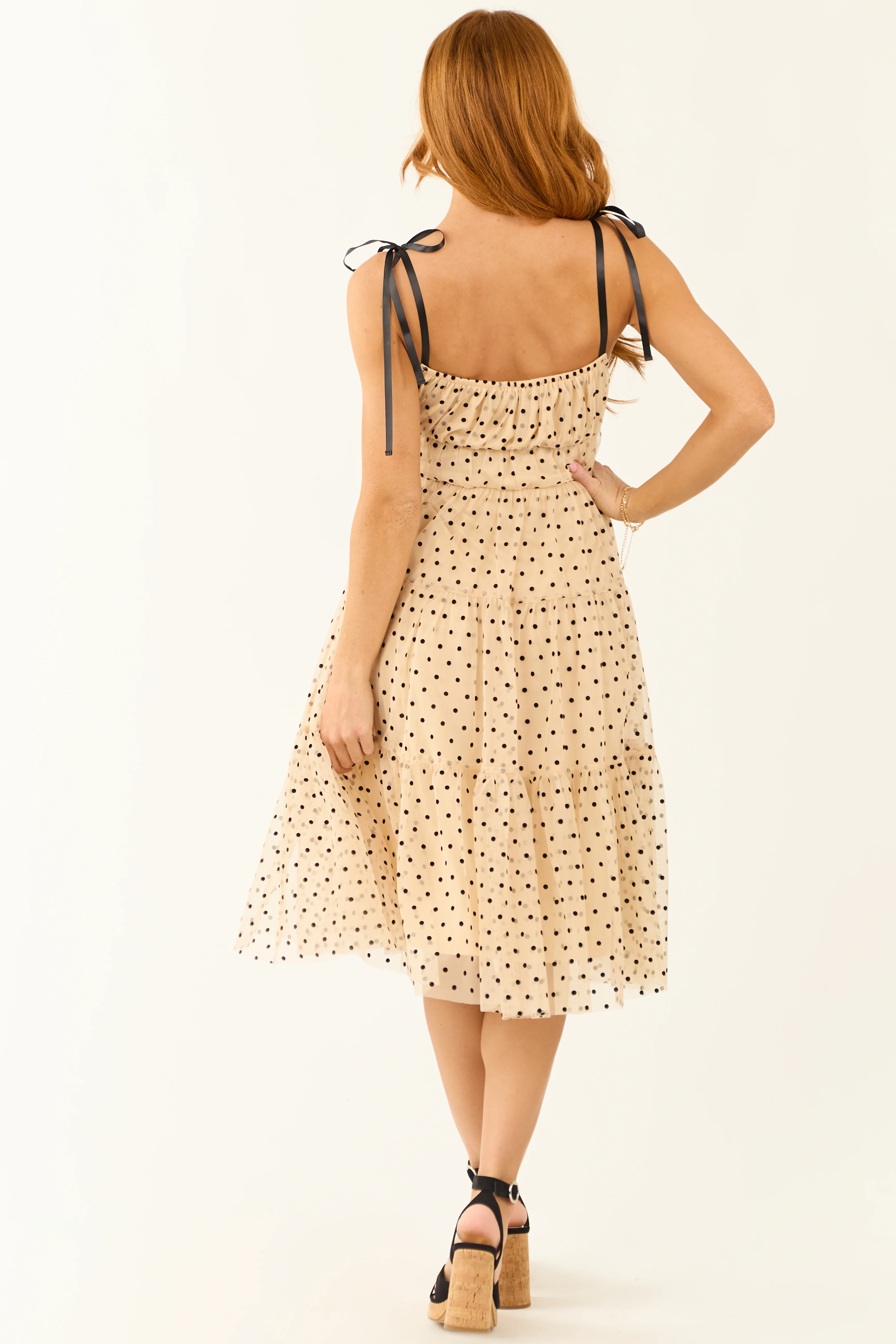 Beige Polka Dot Tulle Tiered Midi Dress