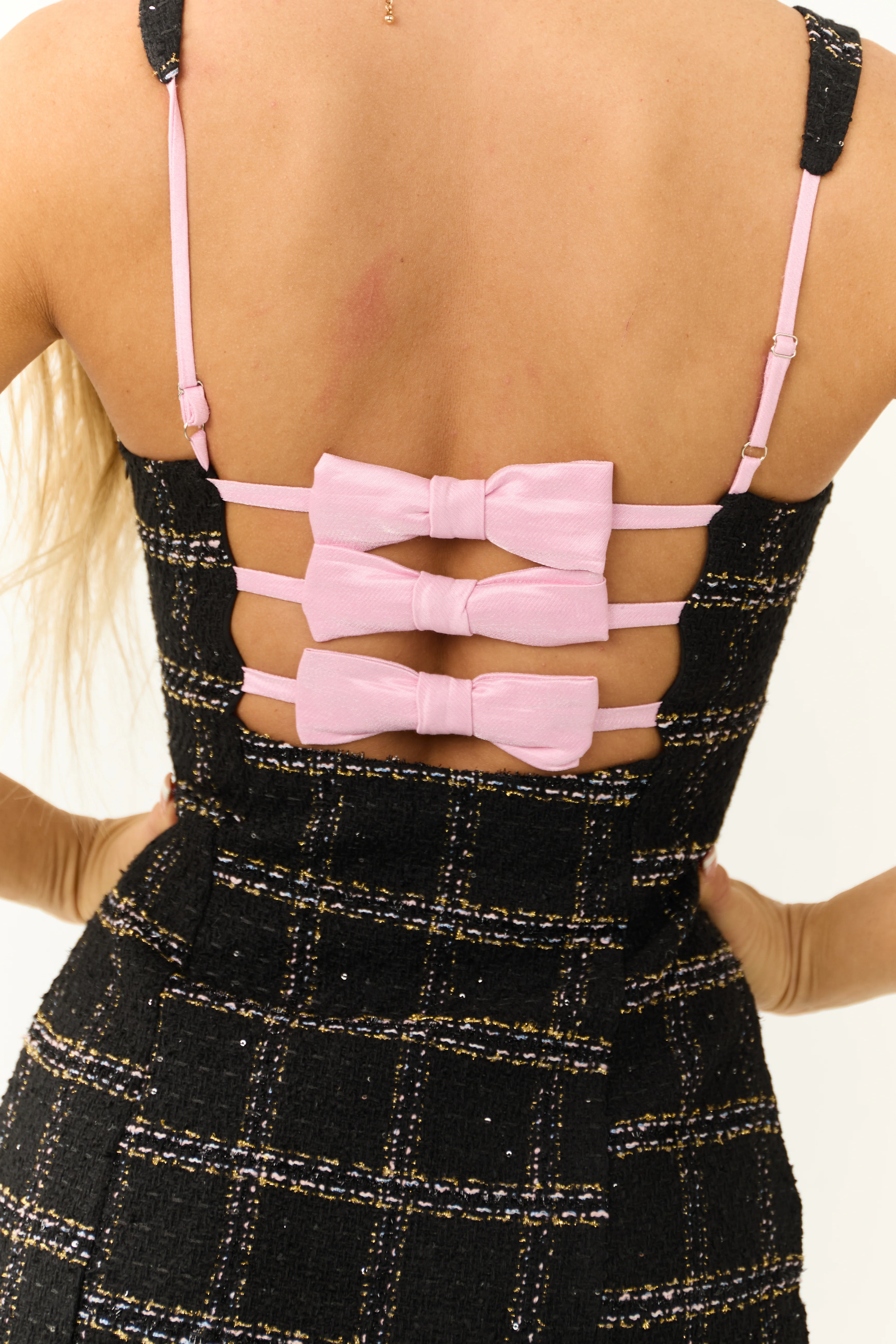 Black Plaid Sweetheart Tweed Bow Back Mini Dress