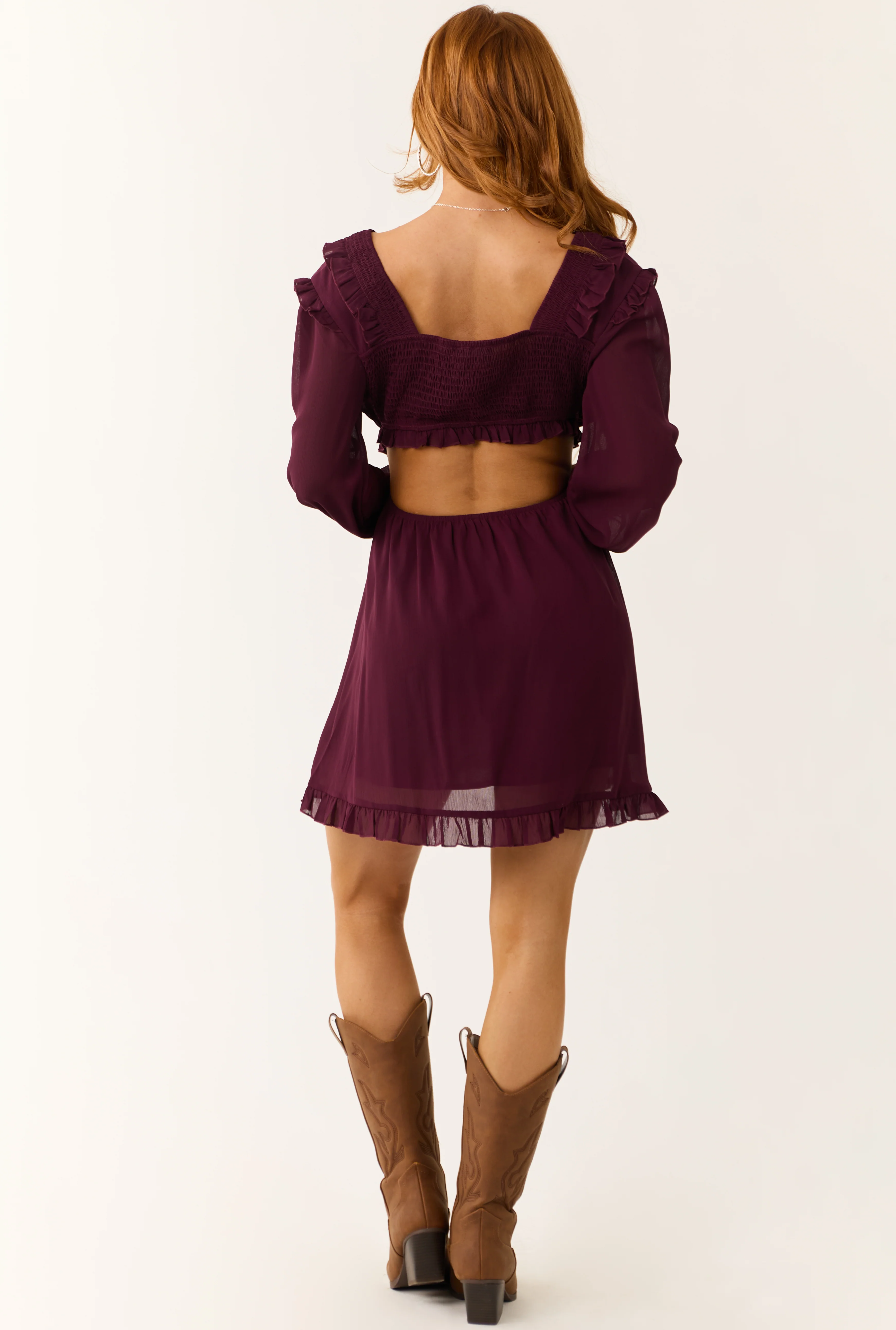 Eggplant Smocked Ruffle Long Sleeve Mini Dress