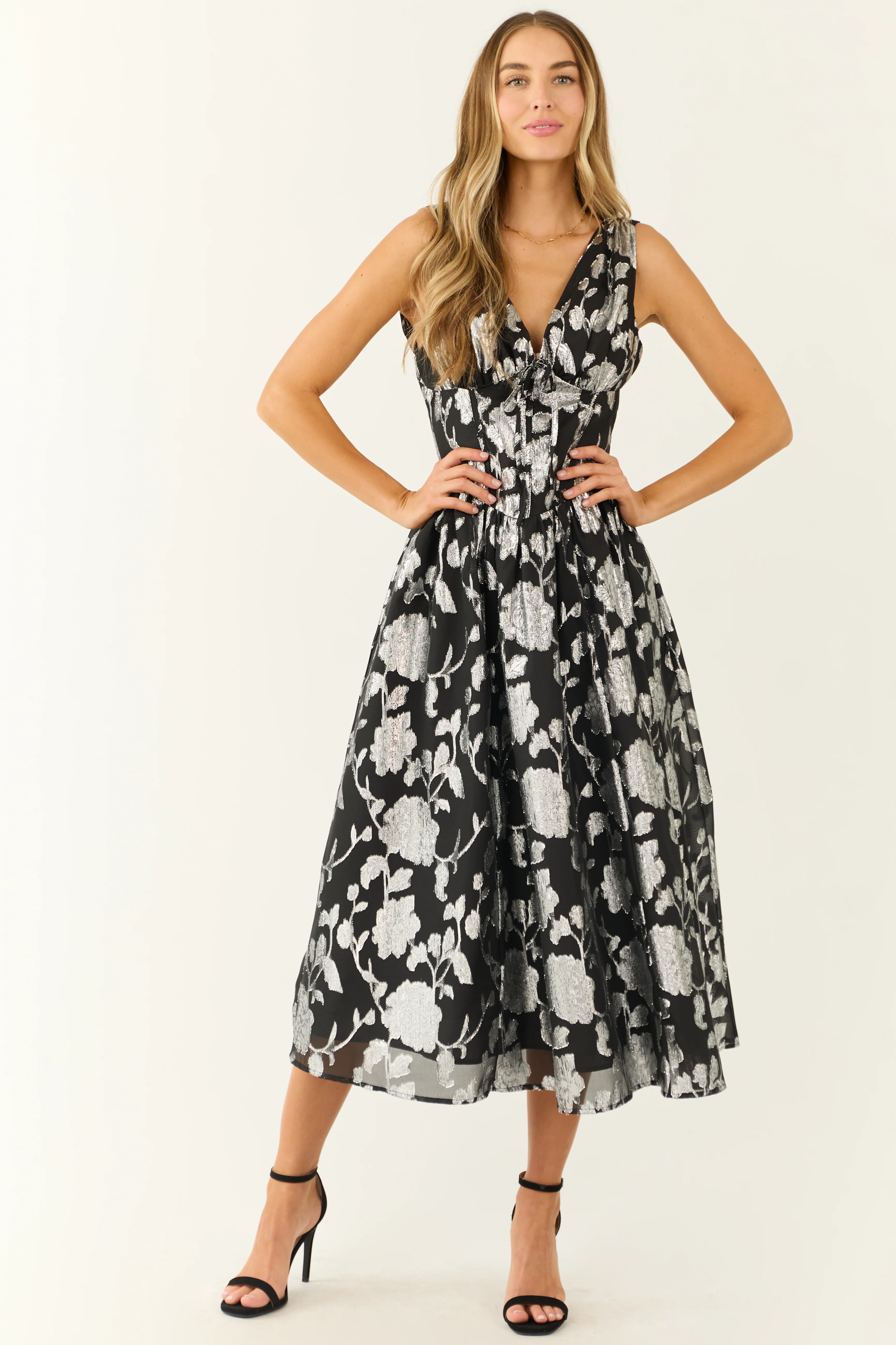 Flying Tomato Black and Silver Floral Midi Dress