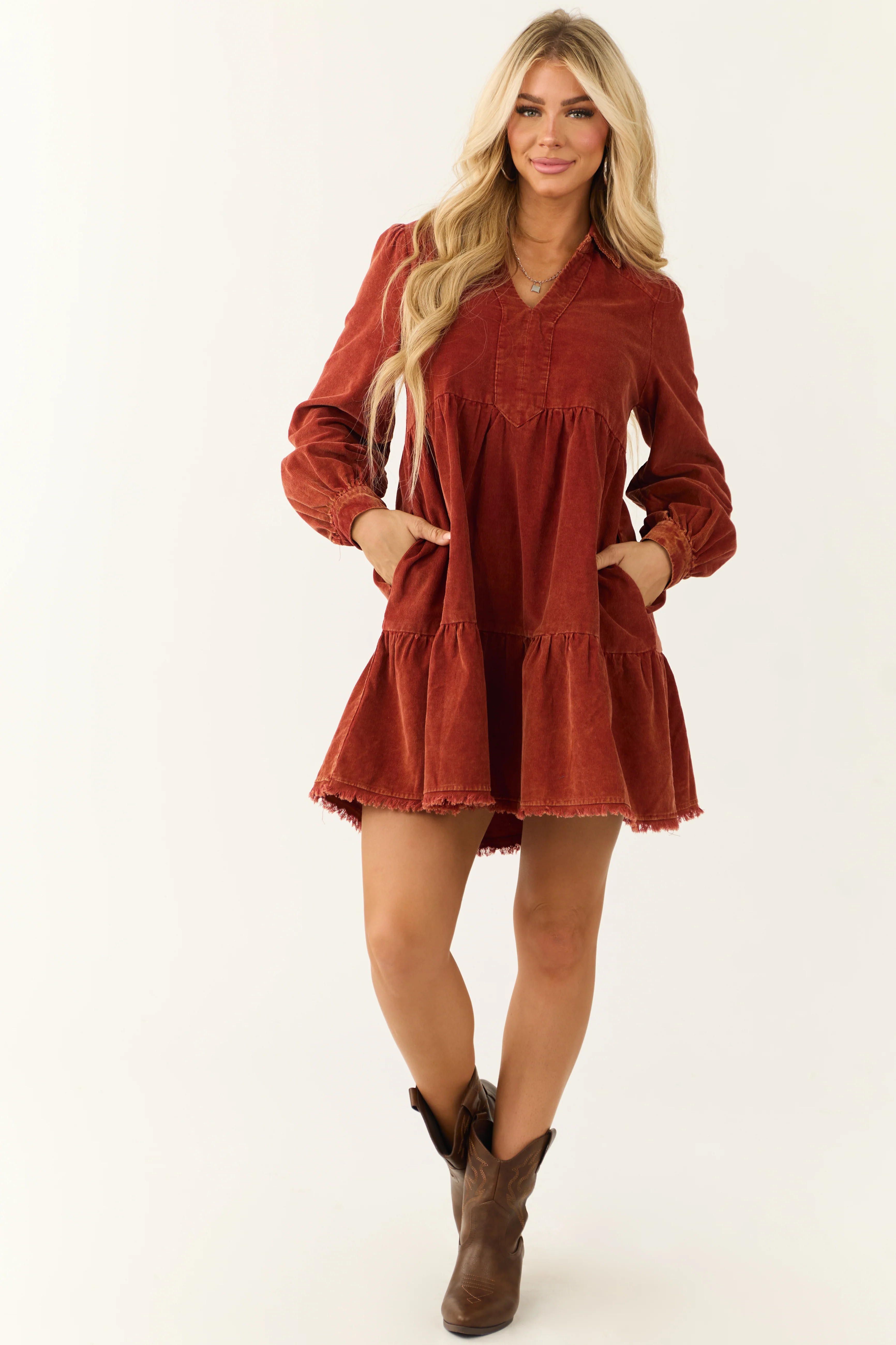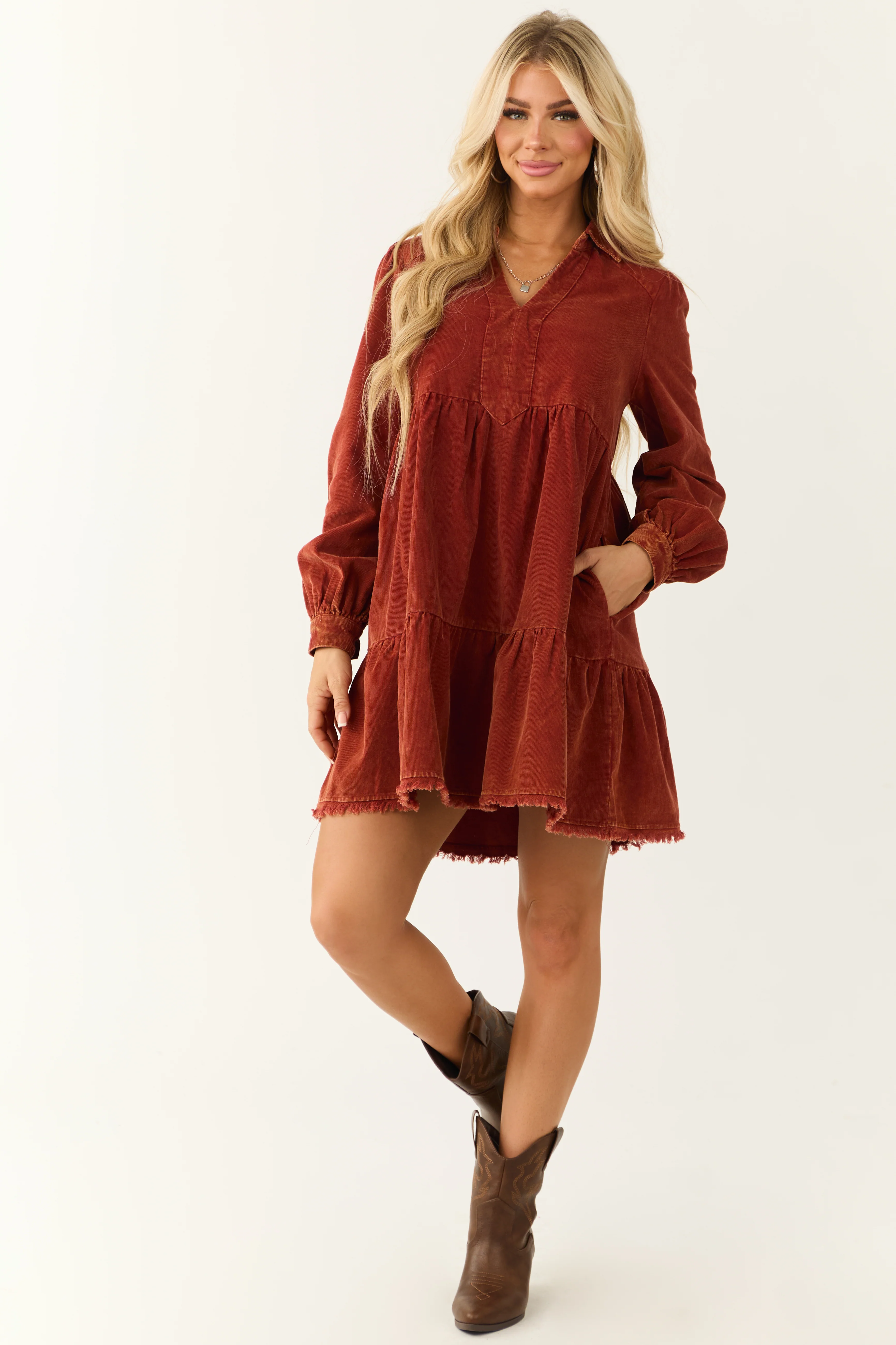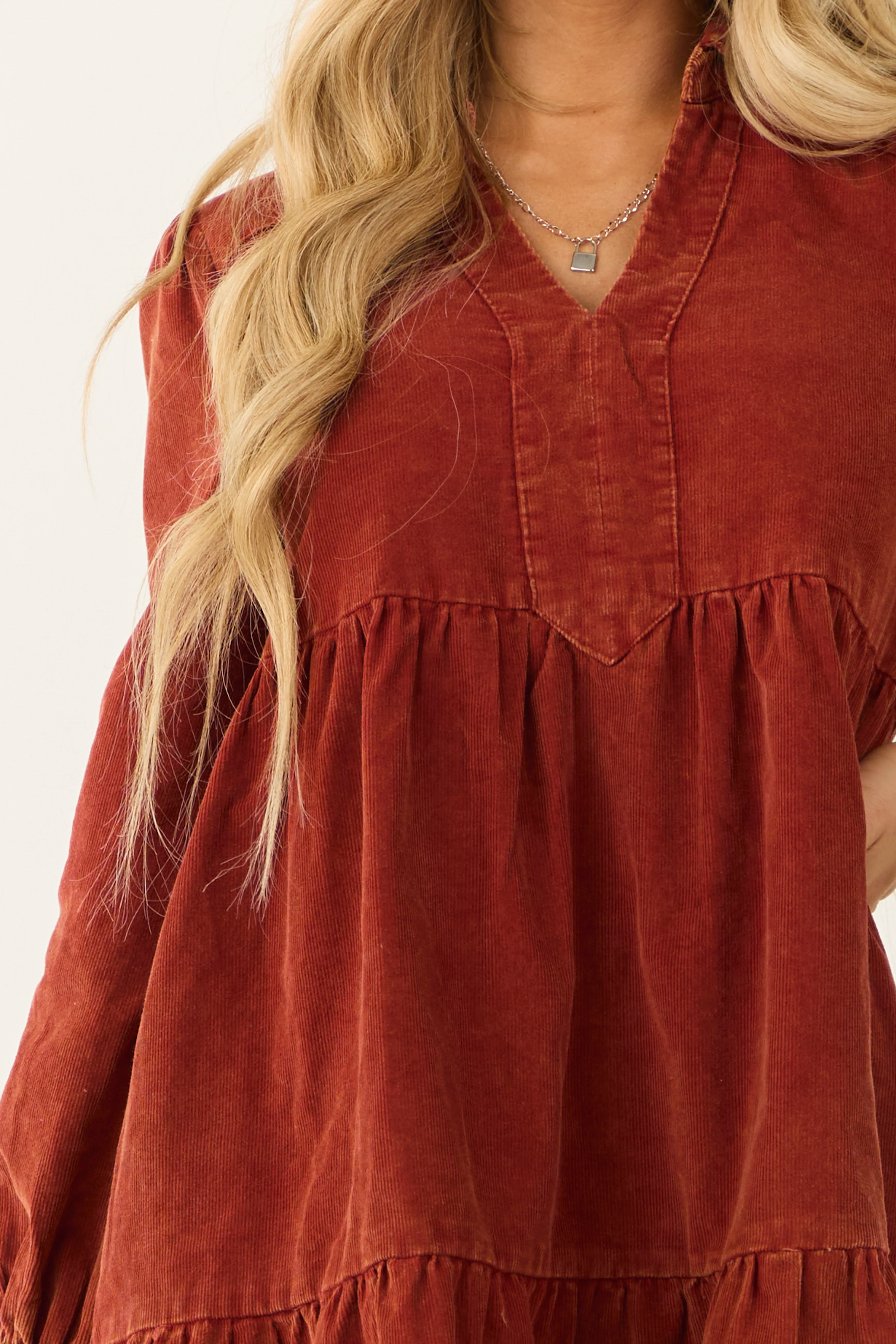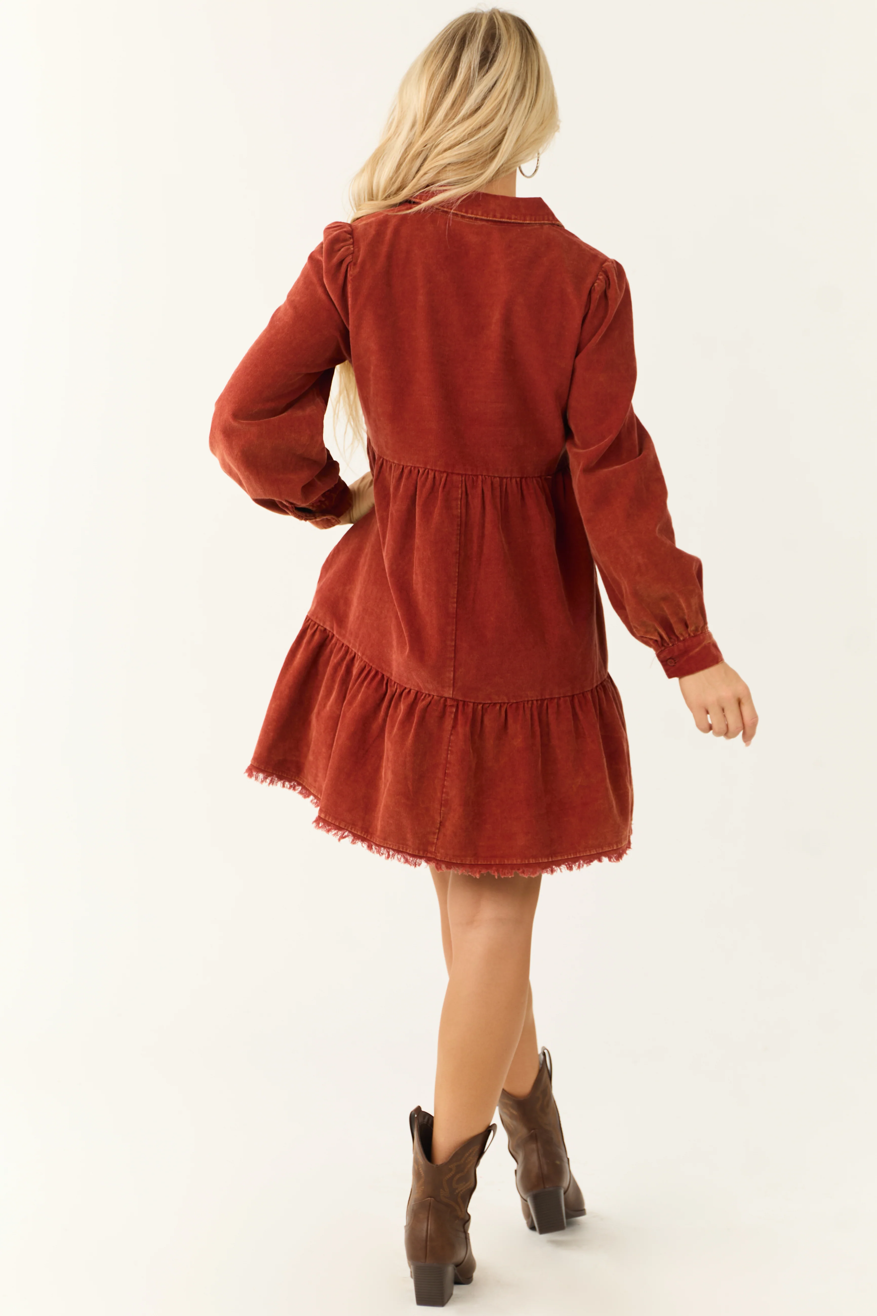 Dusty Rust Washed Corduroy Tiered Short Dress