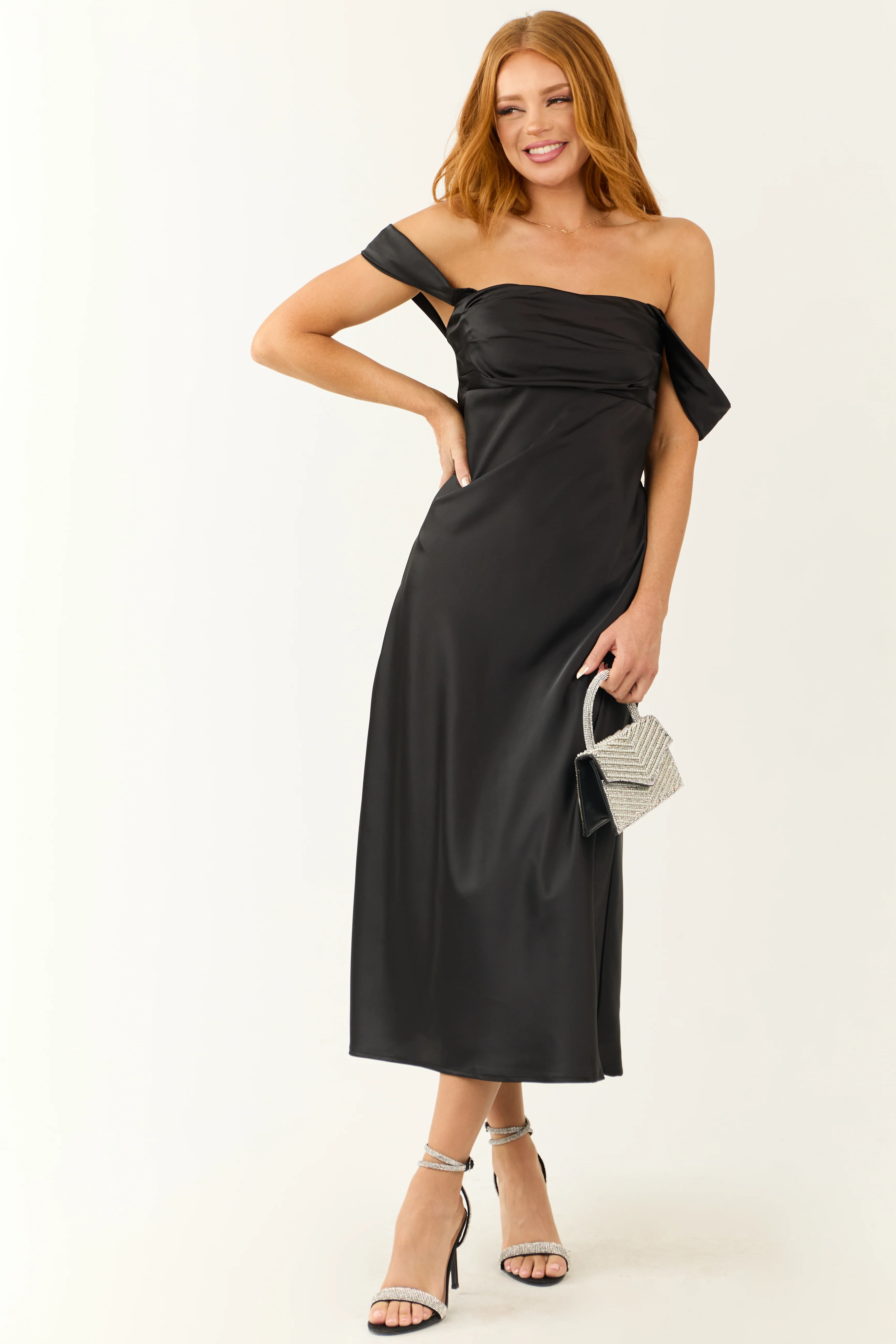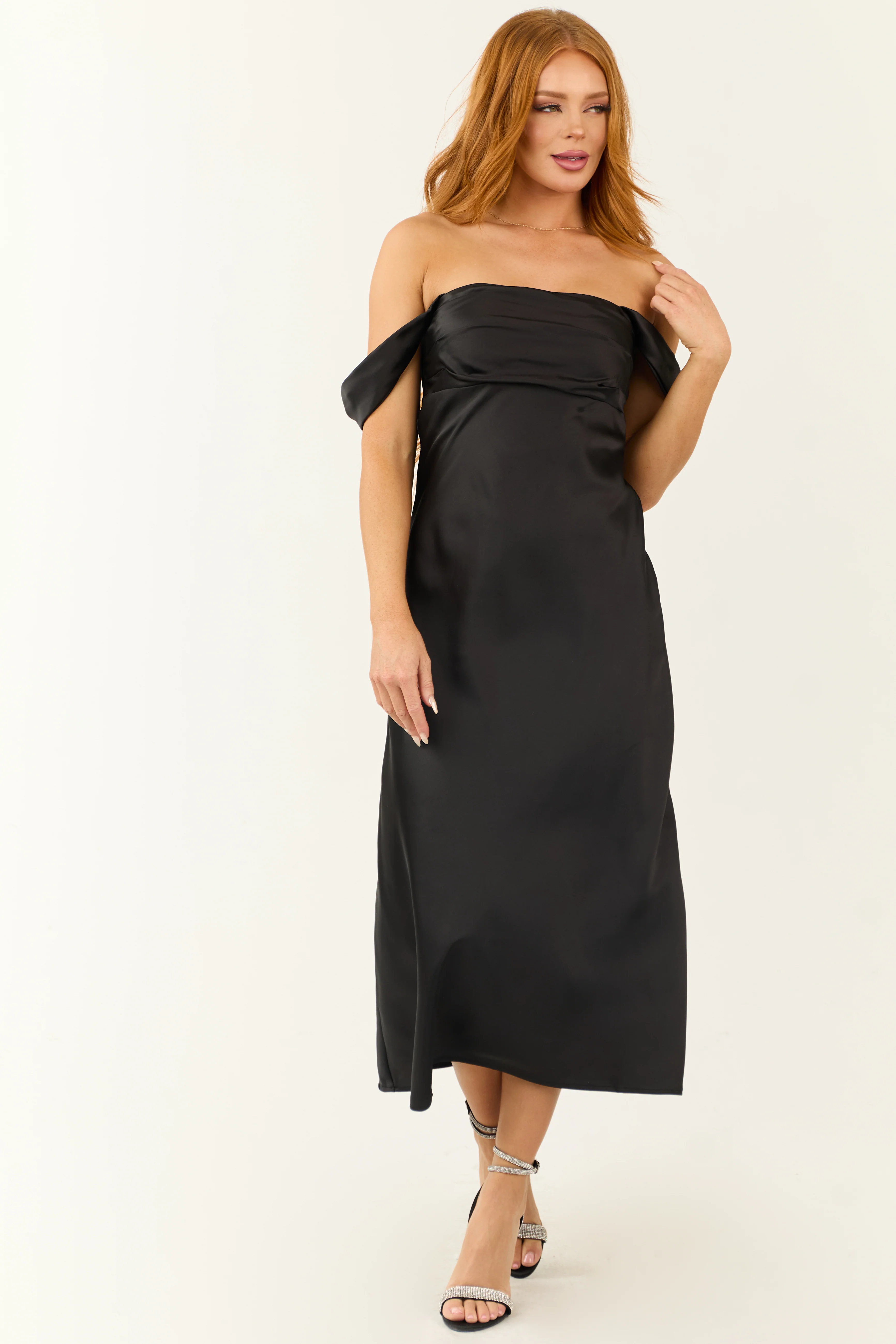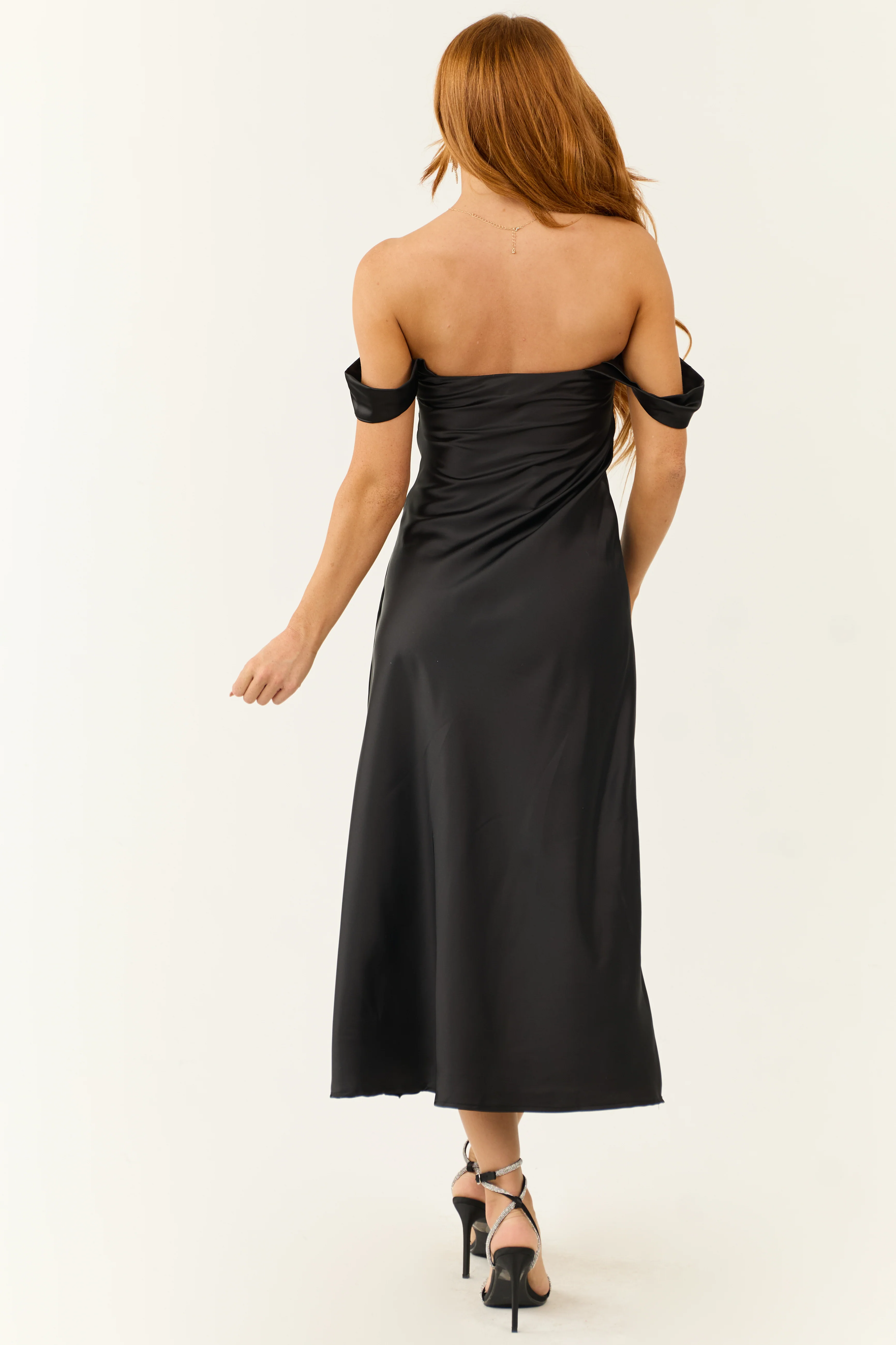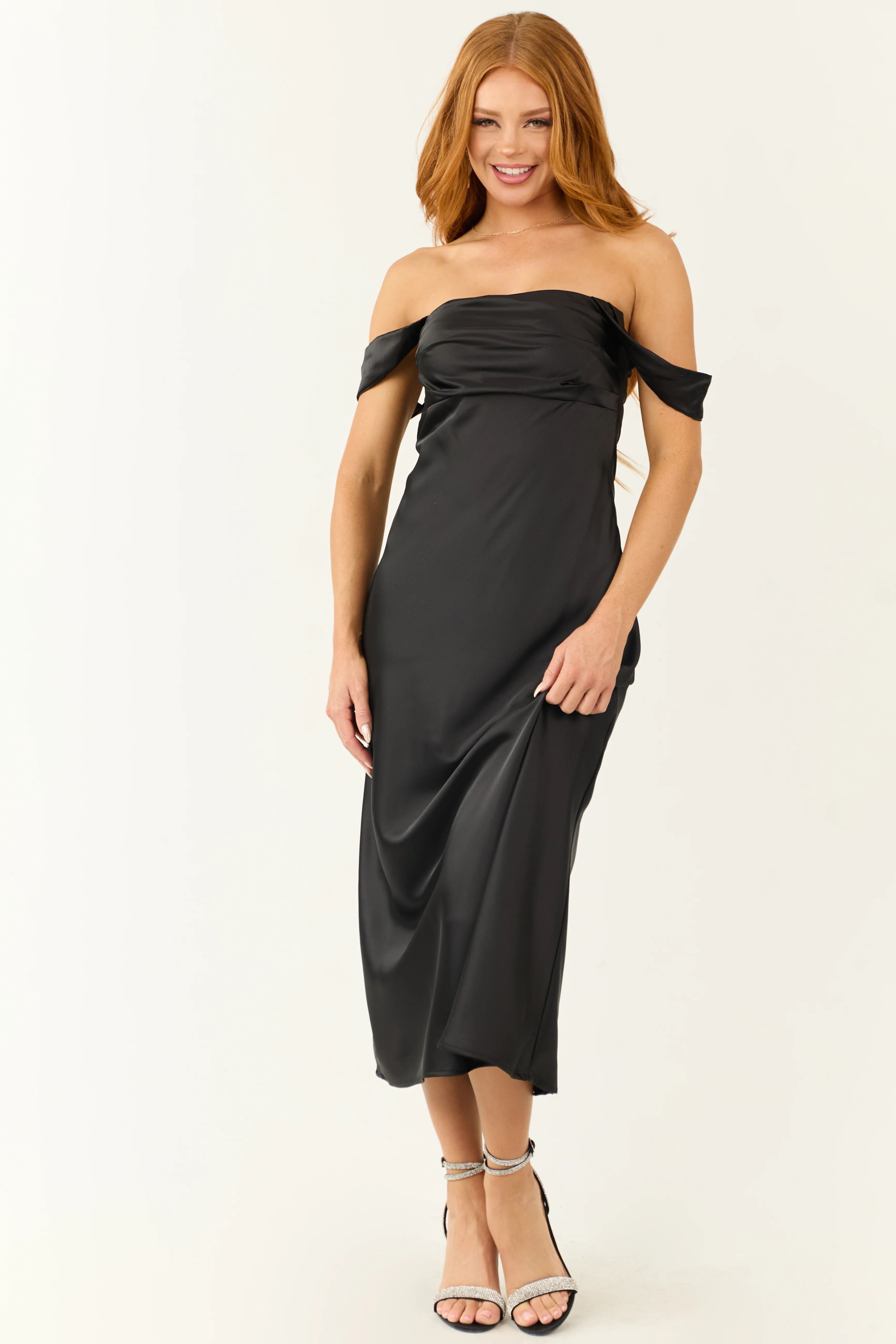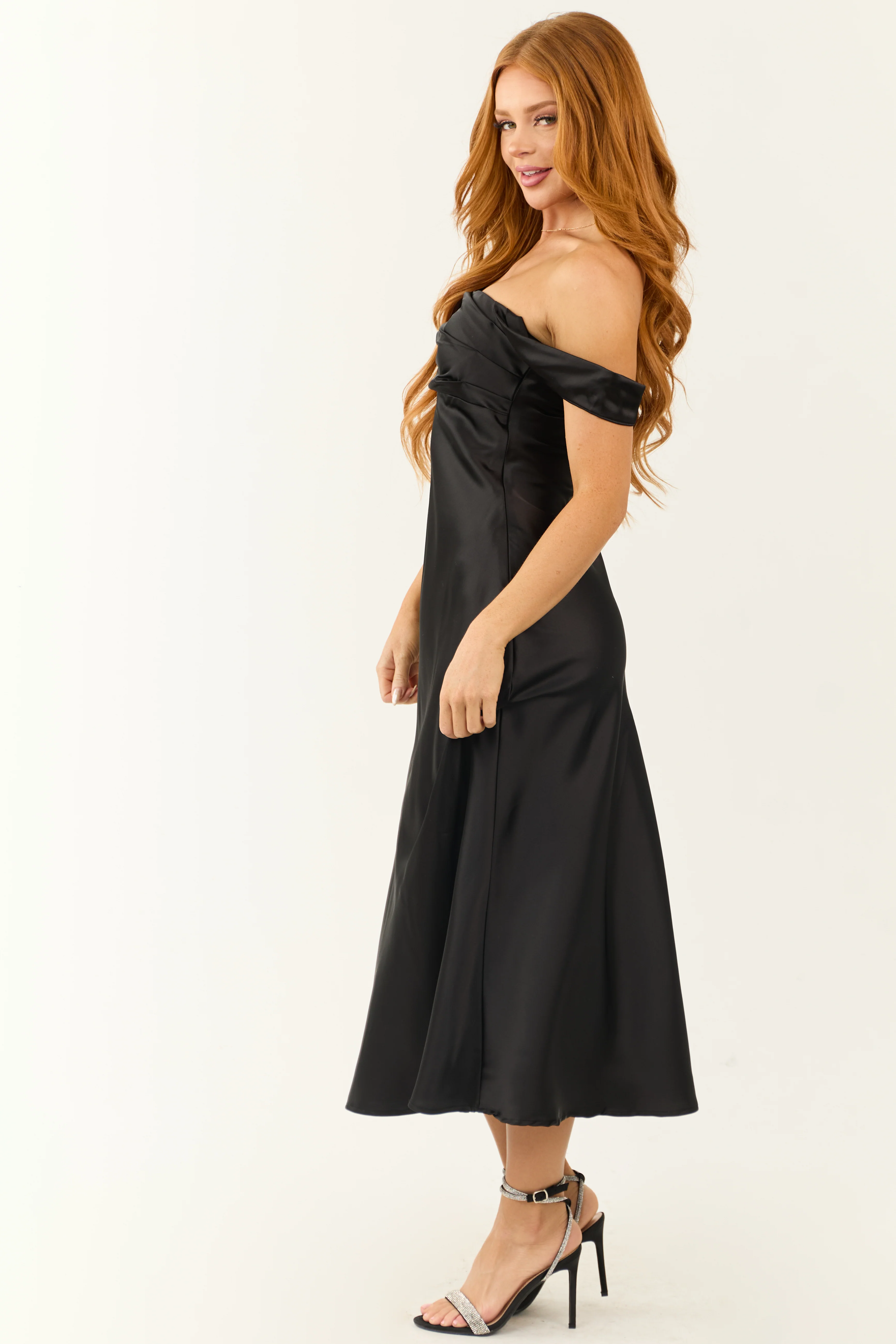 Black Off the Shoulder Satin Ruched Midi Dress