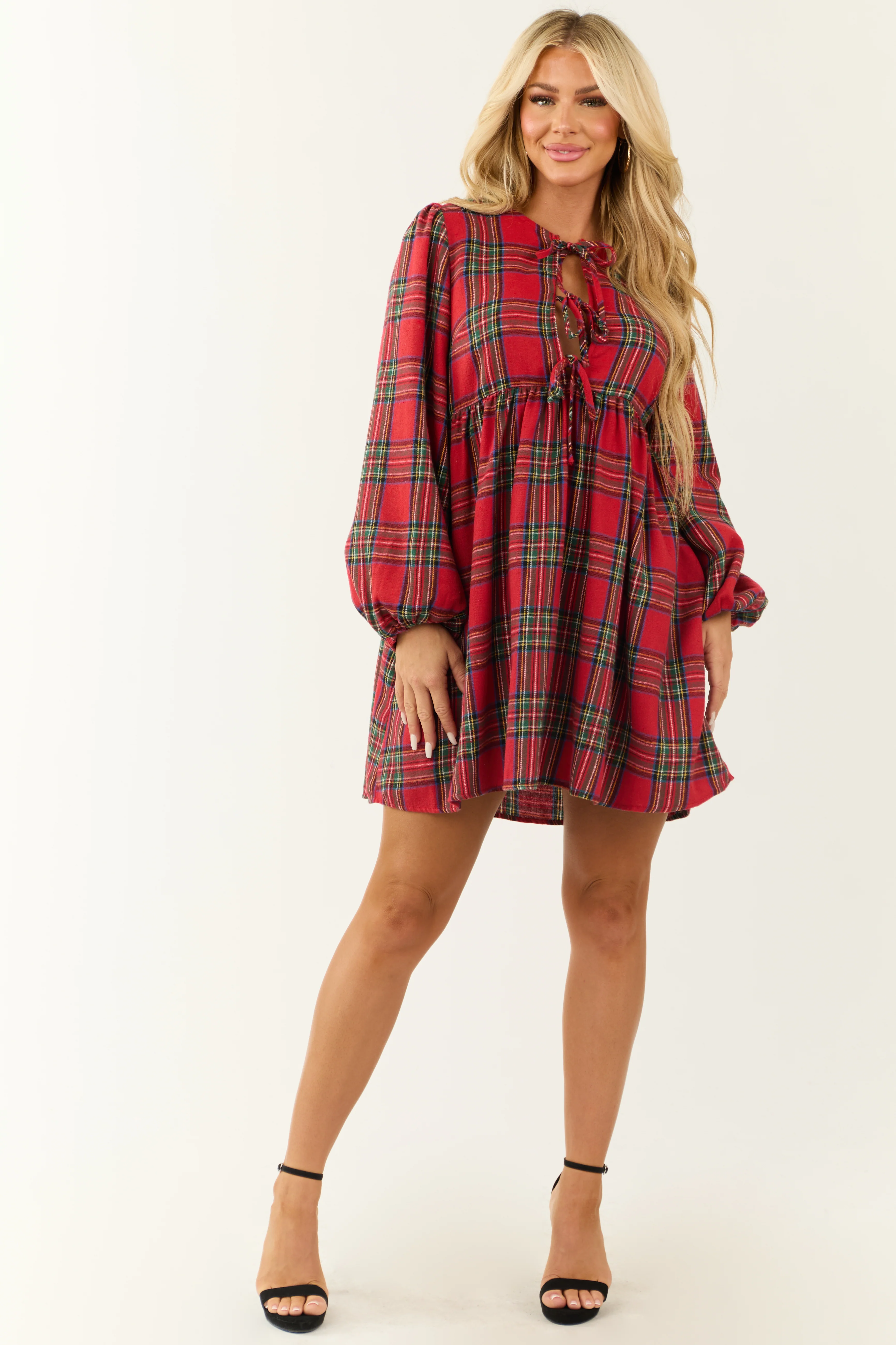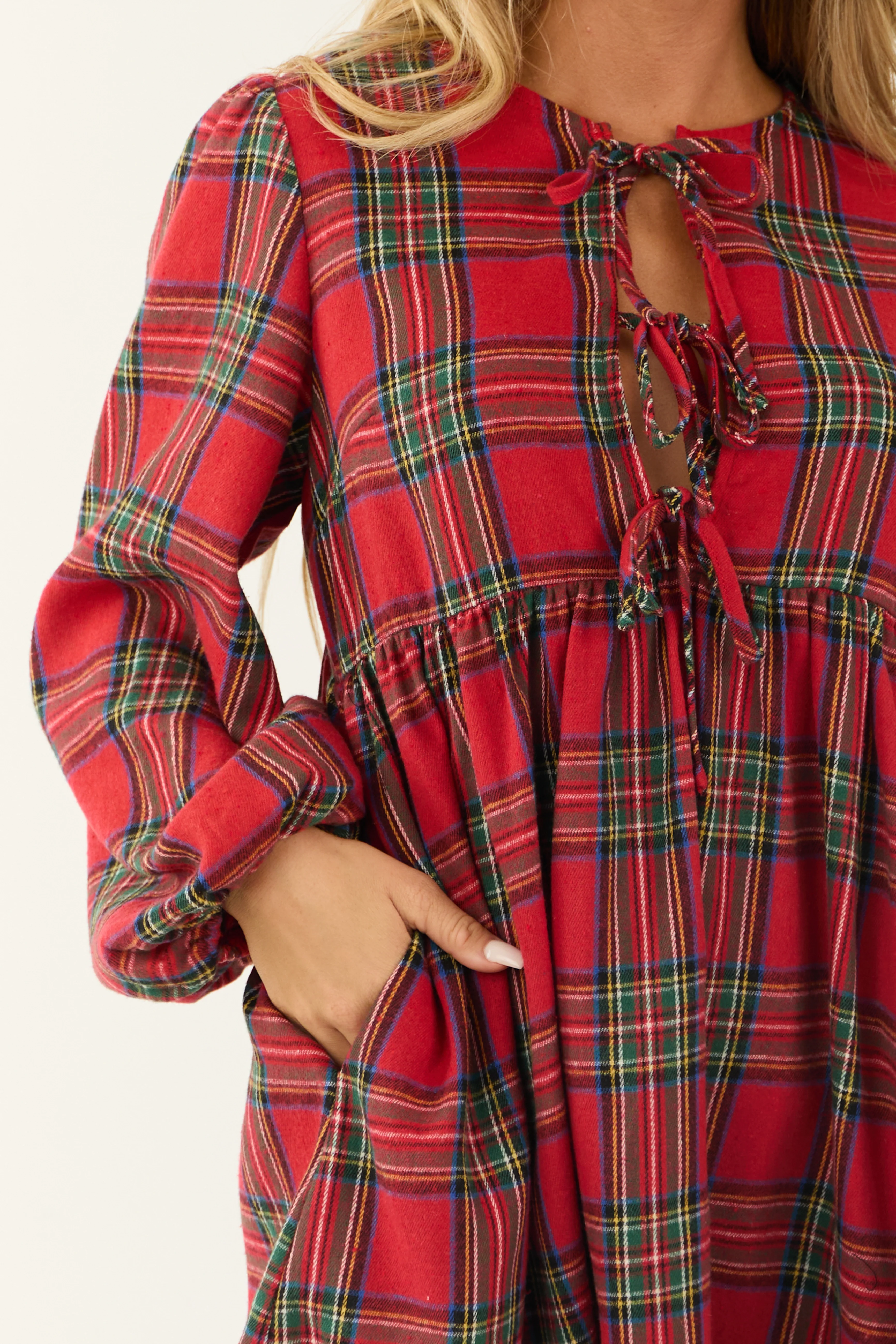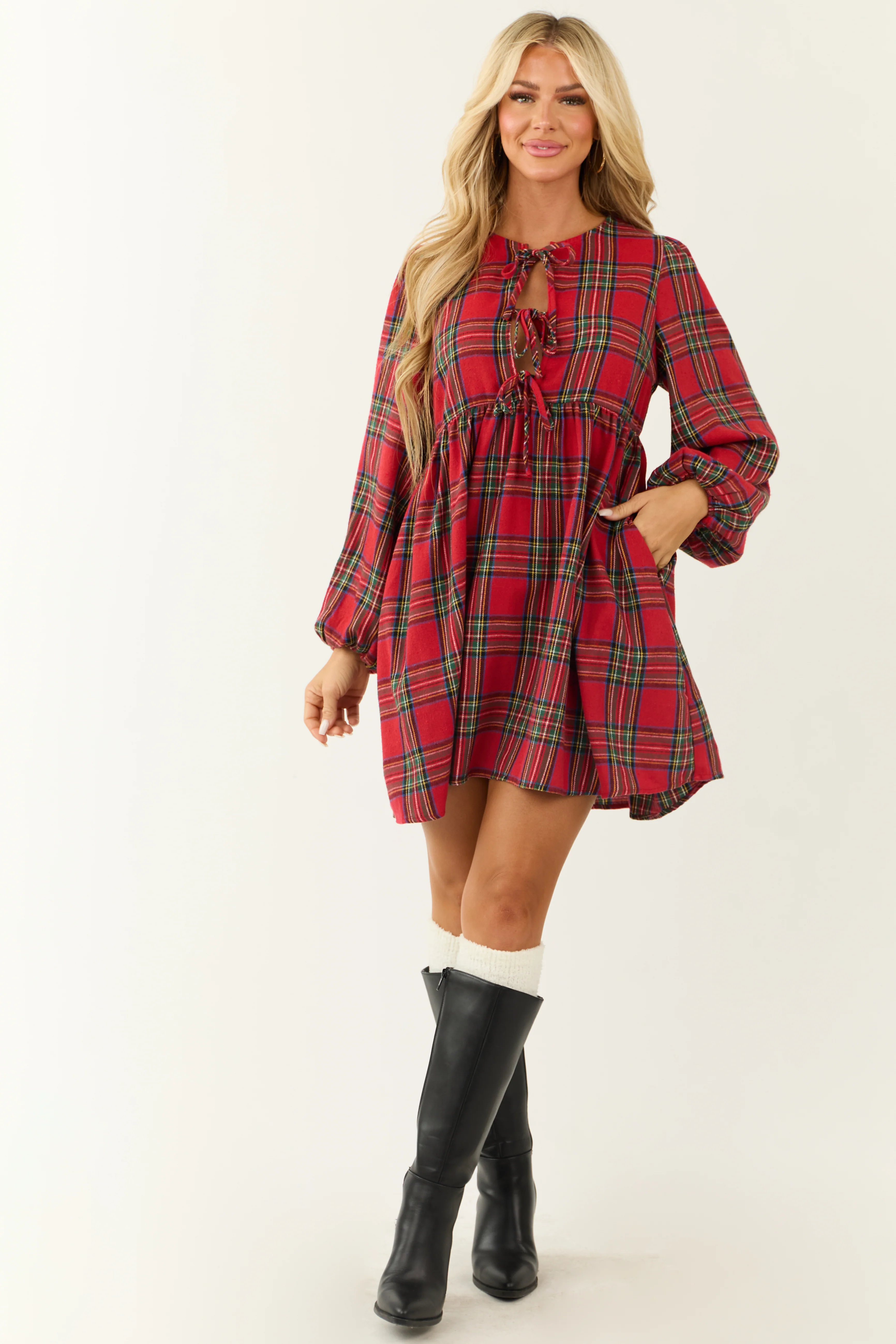 Ruby Plaid Front Tie Long Sleeve Short Dress