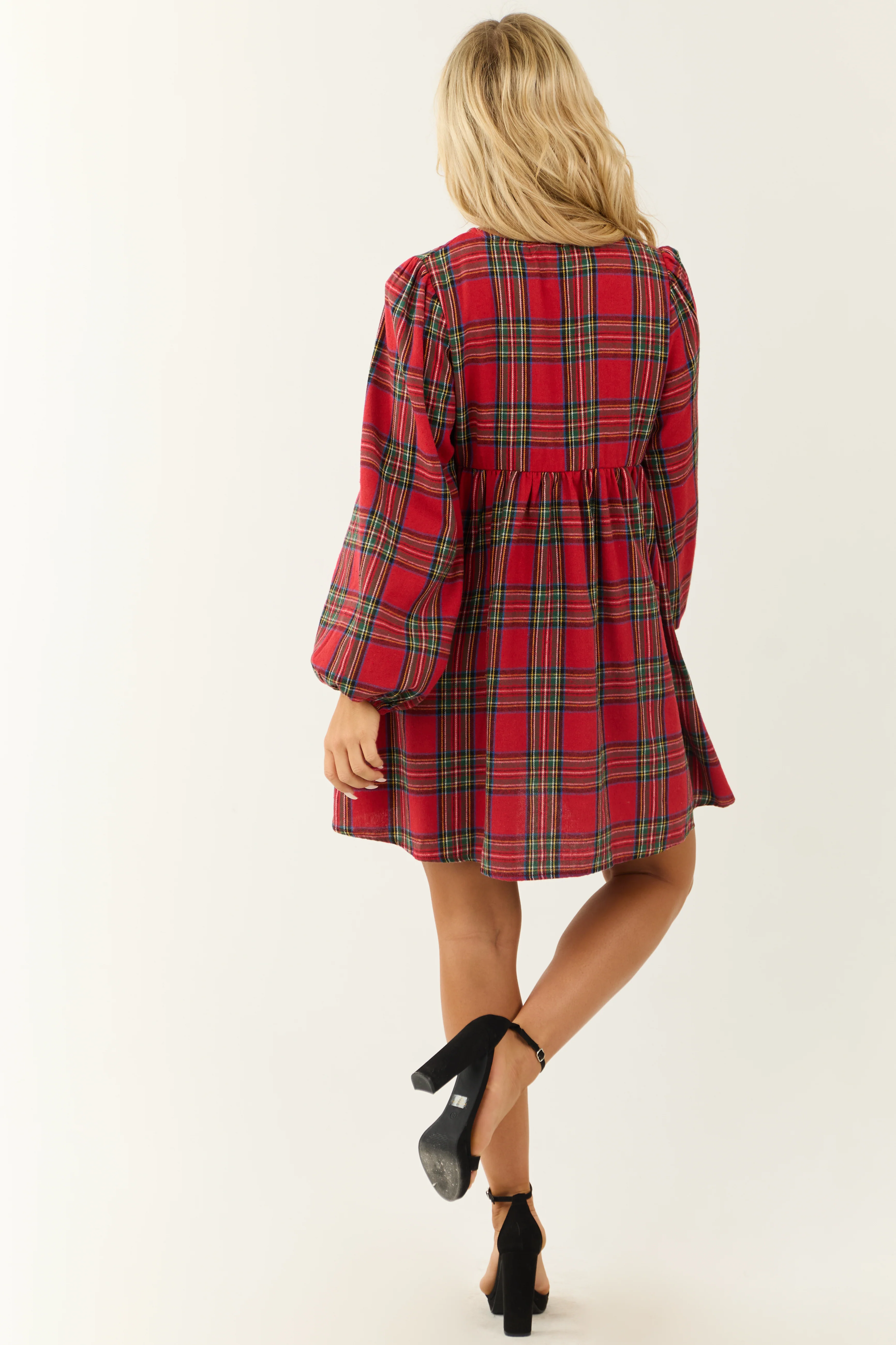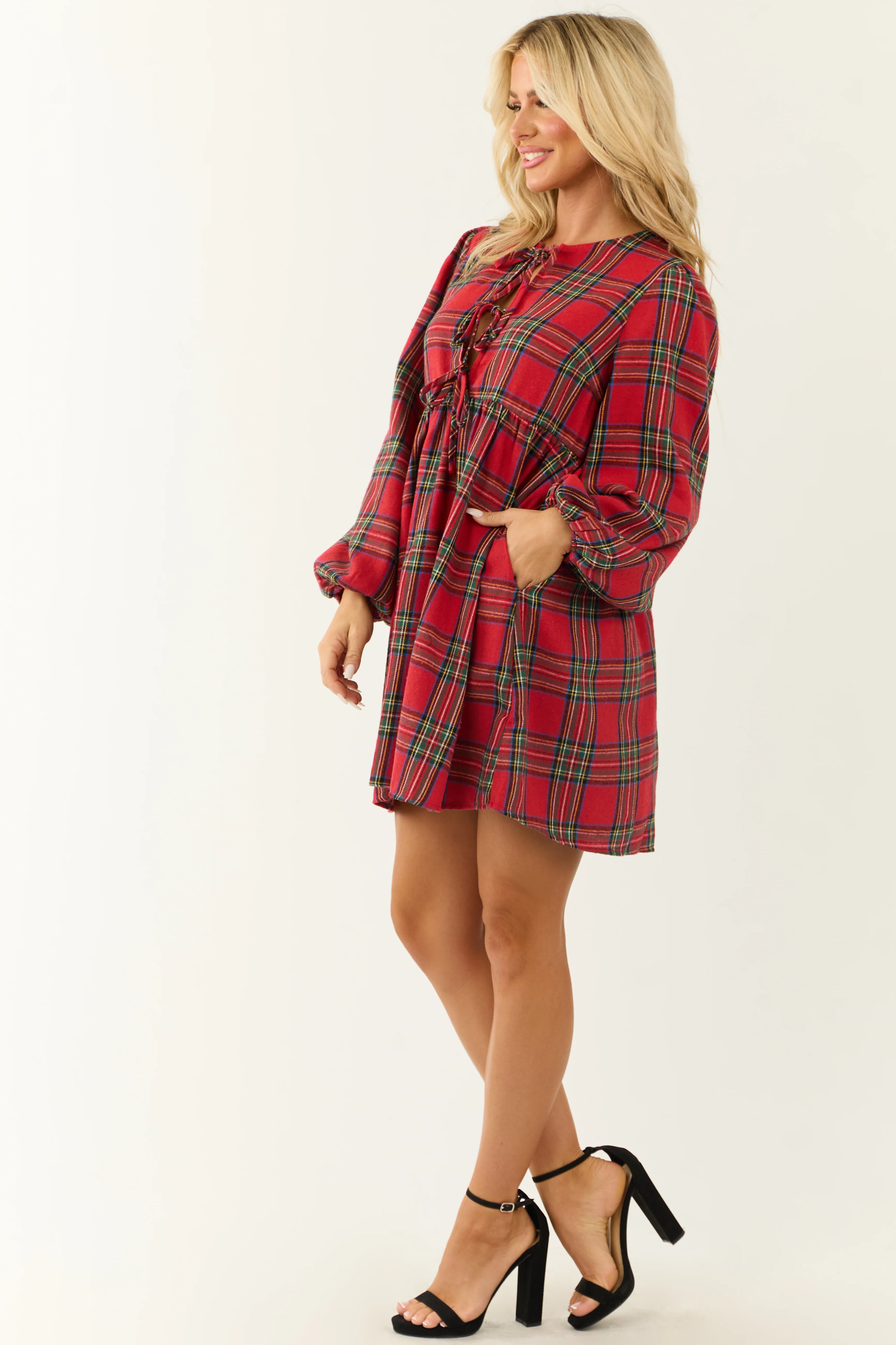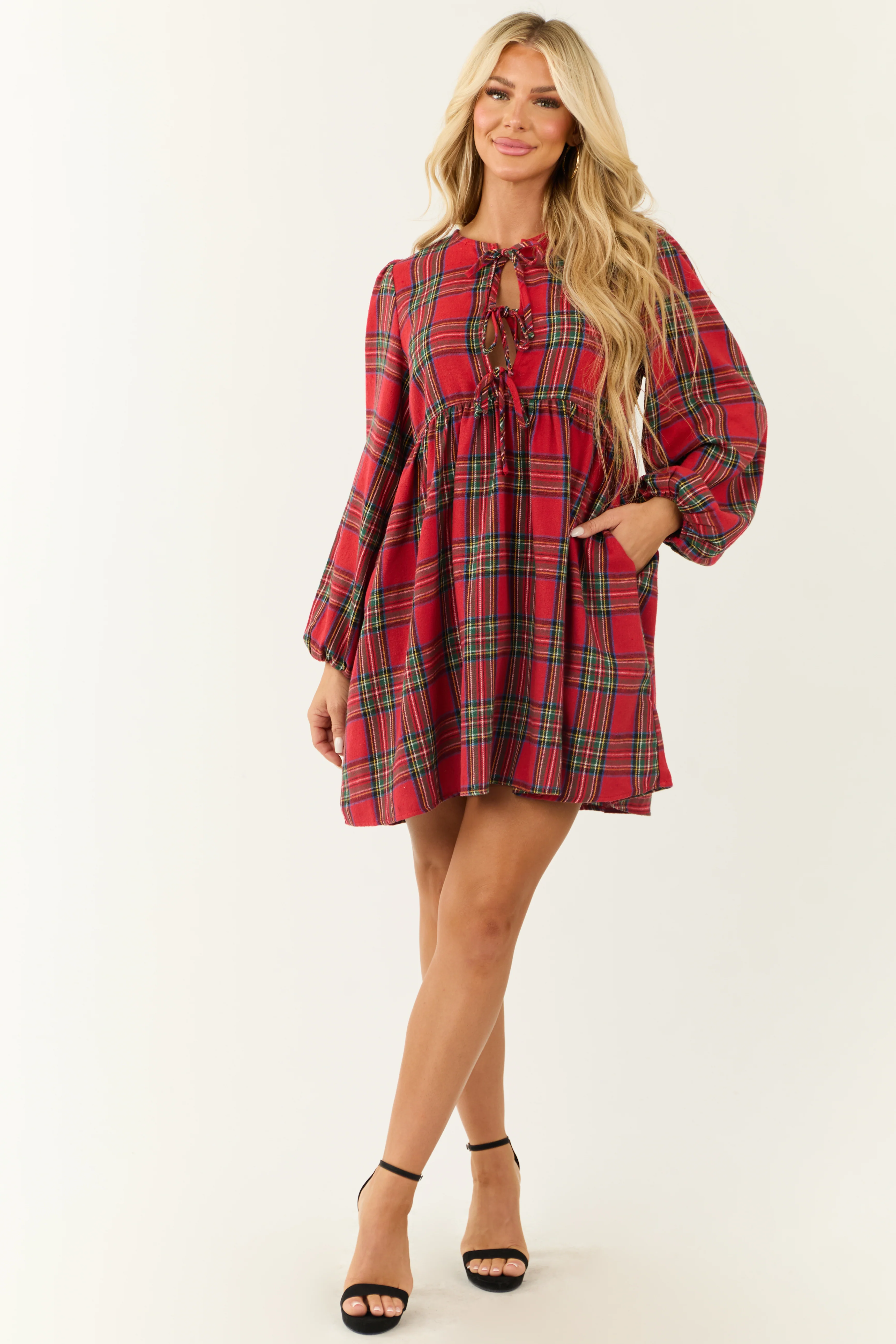 Ruby Plaid Front Tie Long Sleeve Short Dress