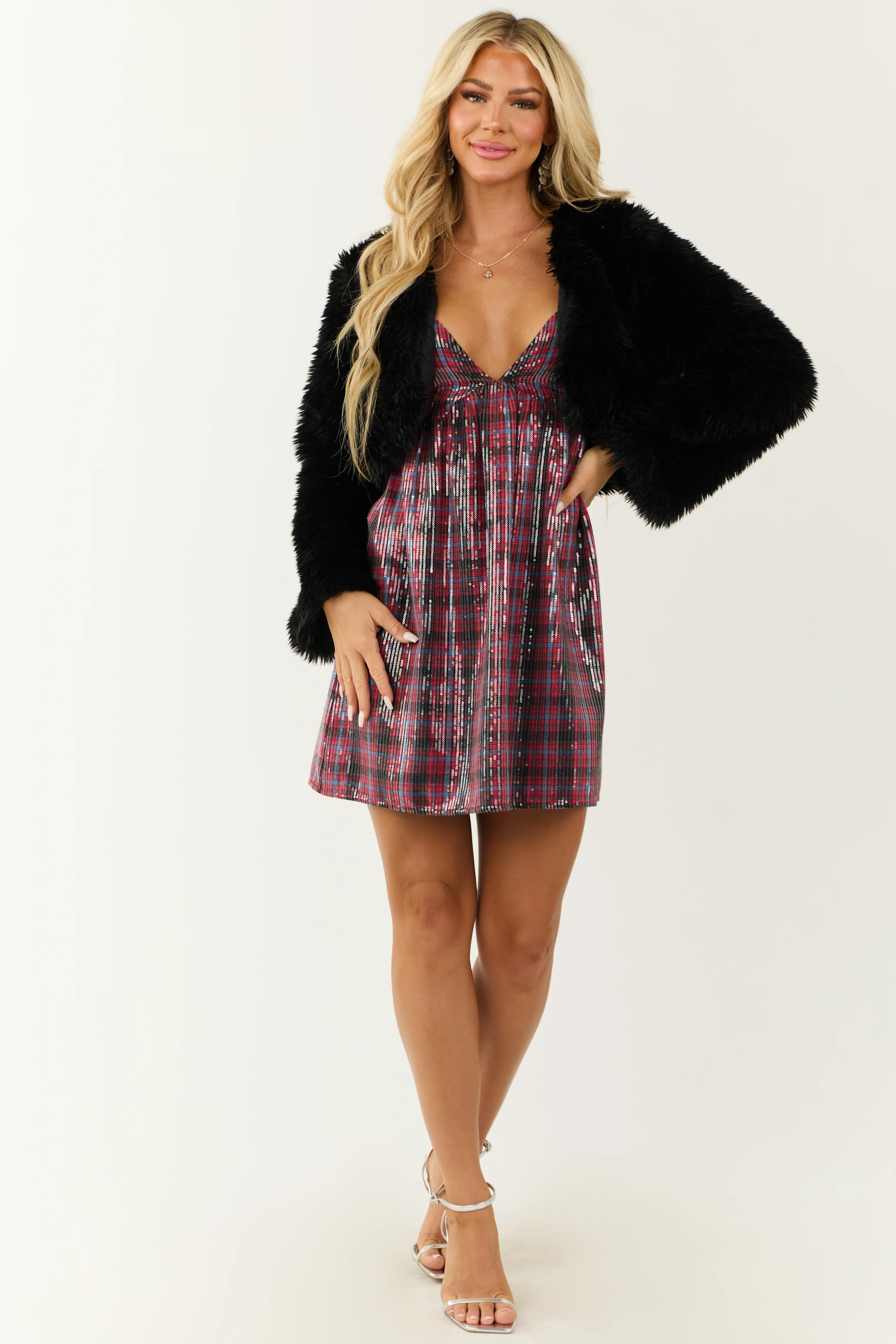 Lipstick Plaid Sequin Sleeveless Short Dress