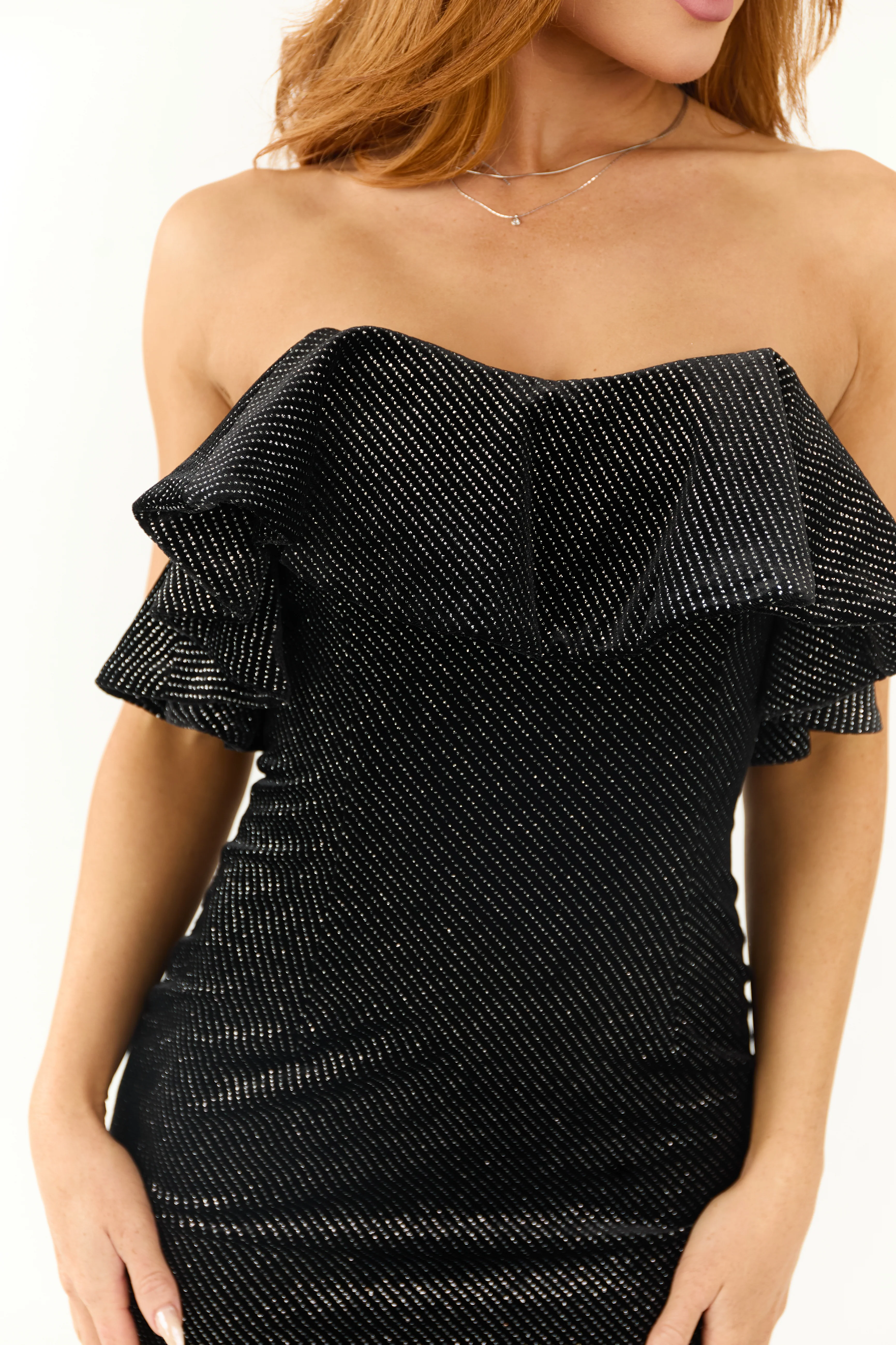Black Velvet Glitter Ruffle Strapless Mini Dress