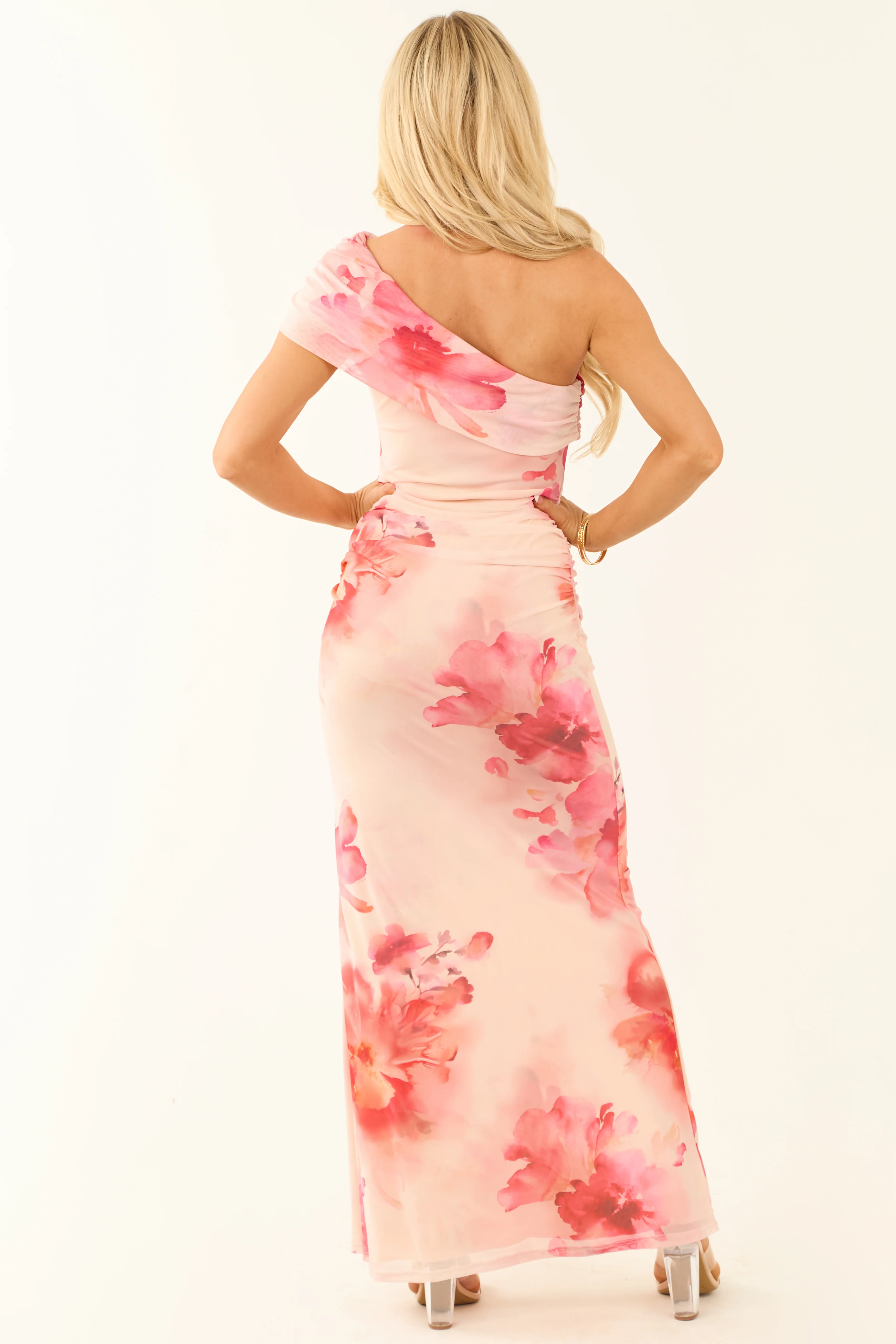 Blush Floral Watercolor One Shoulder Mesh Maxi Dress