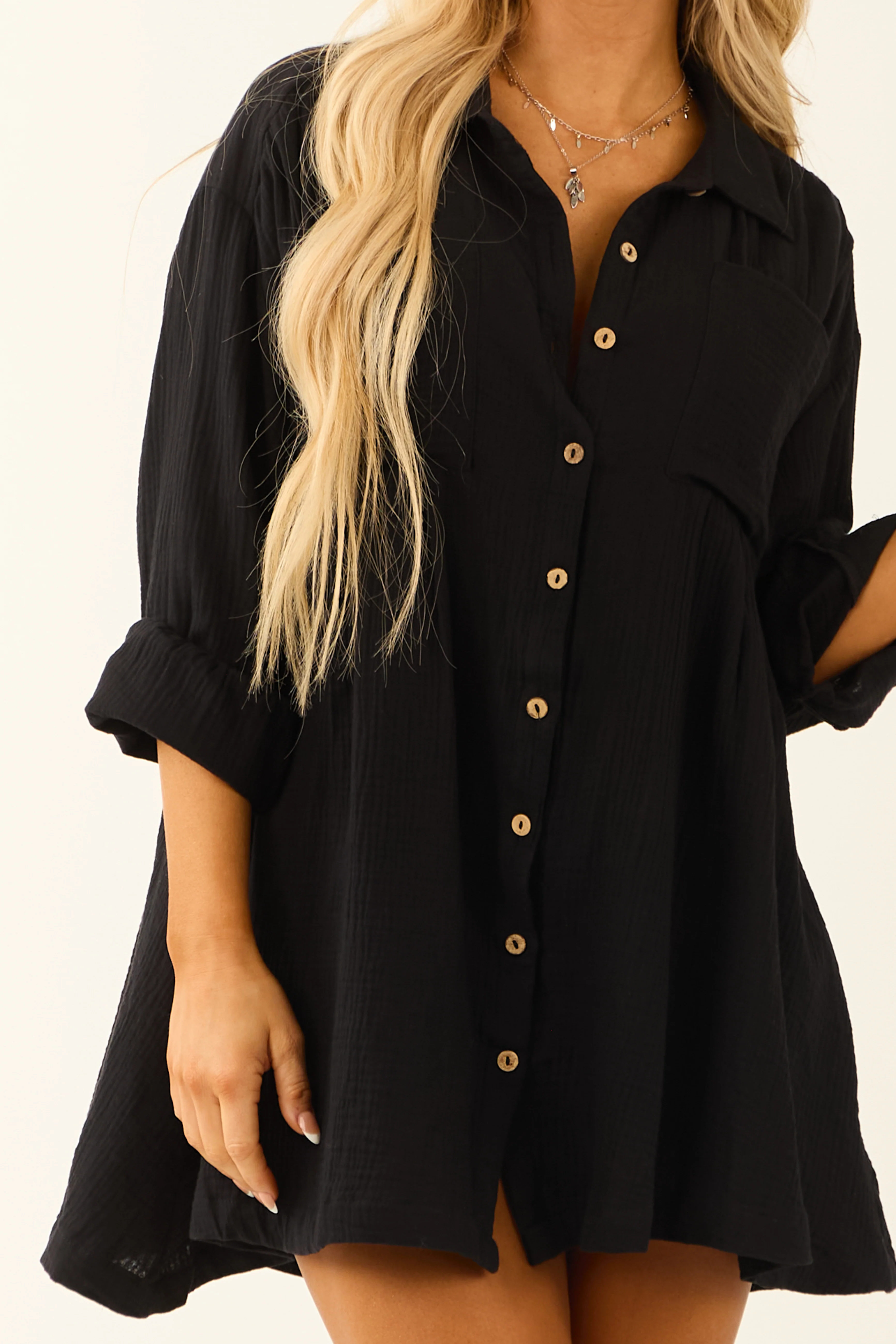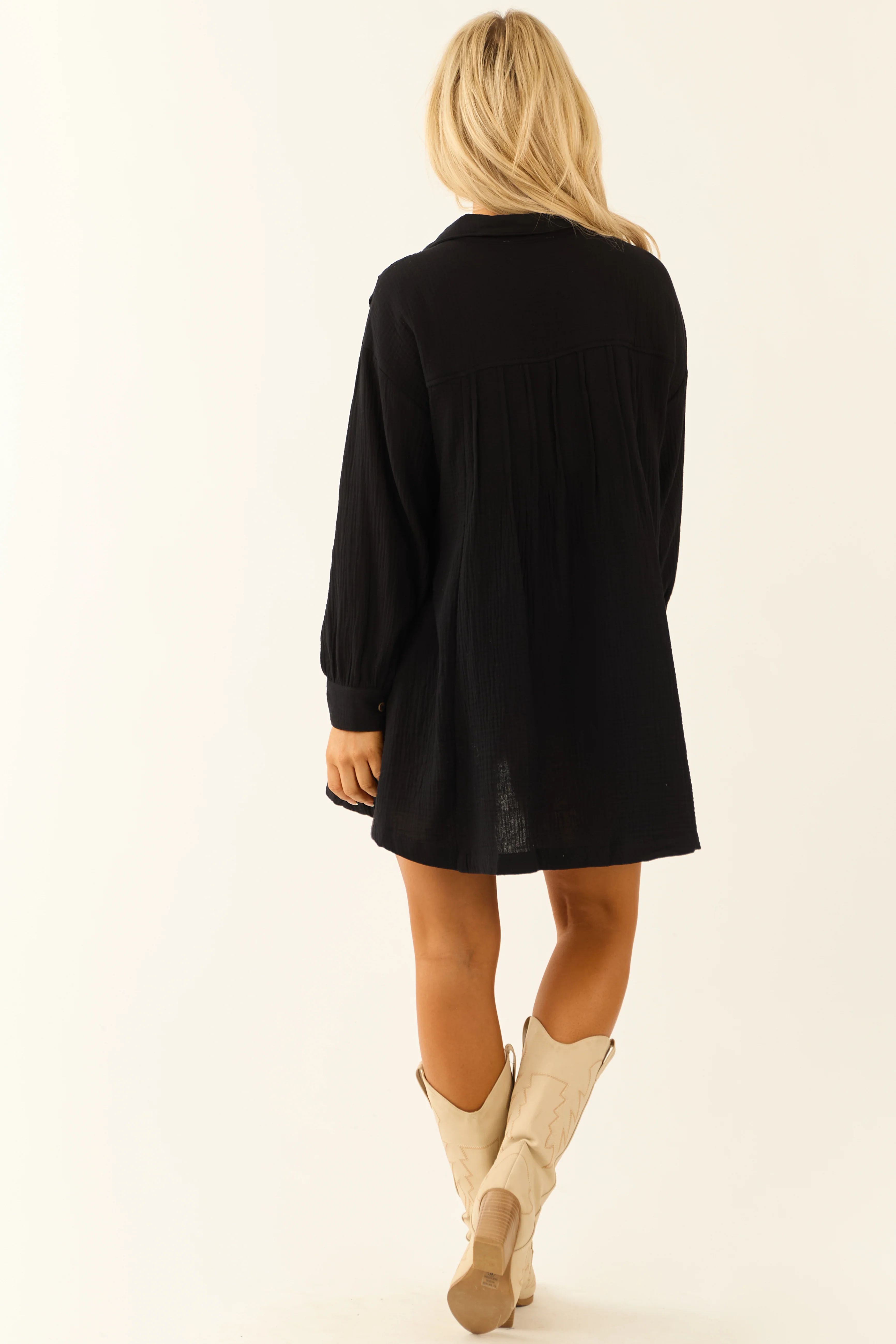 Black Chest Pocket Relaxed Gauze Short Shirt Dress