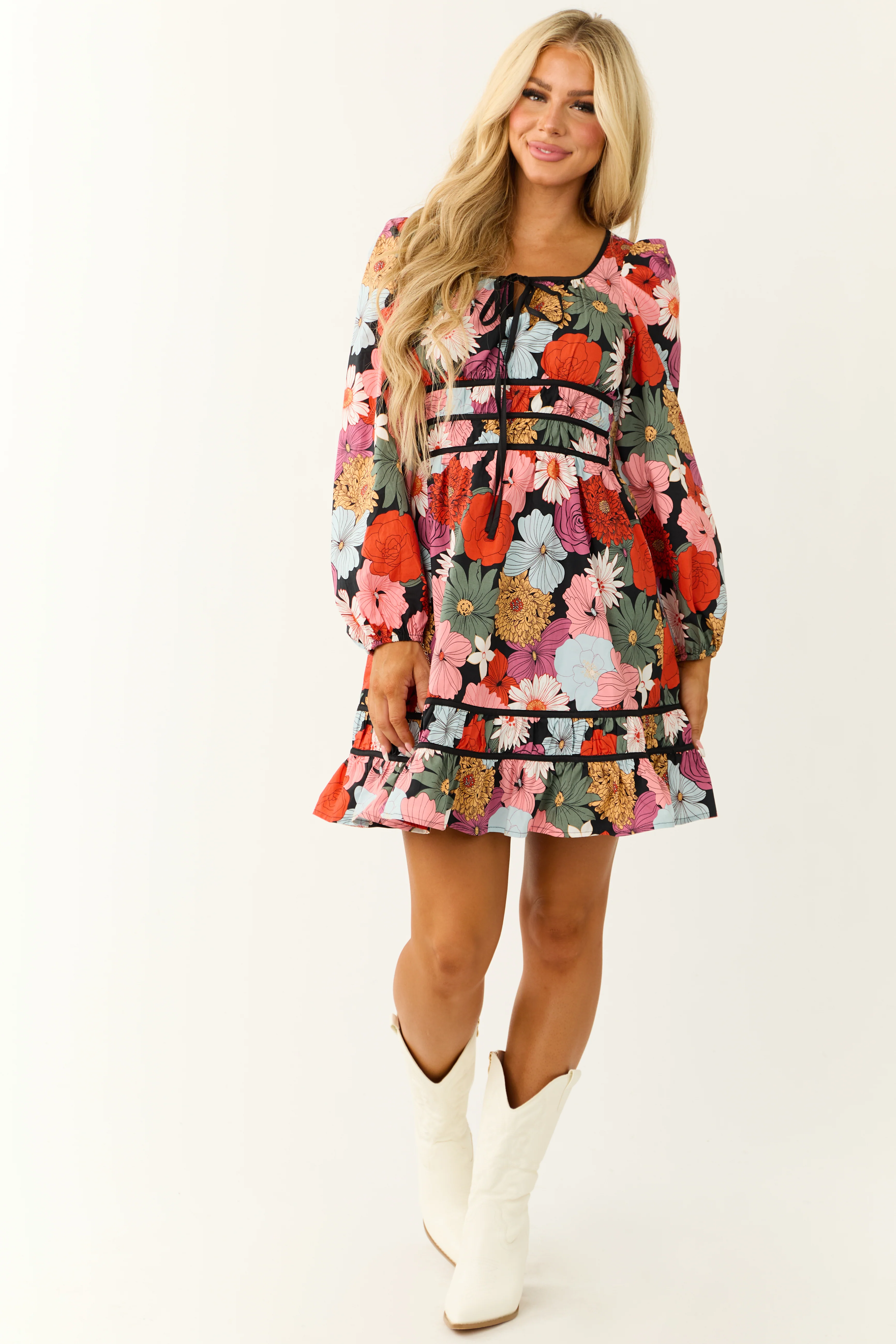Black Bright Floral Print Long Sleeve Mini Dress