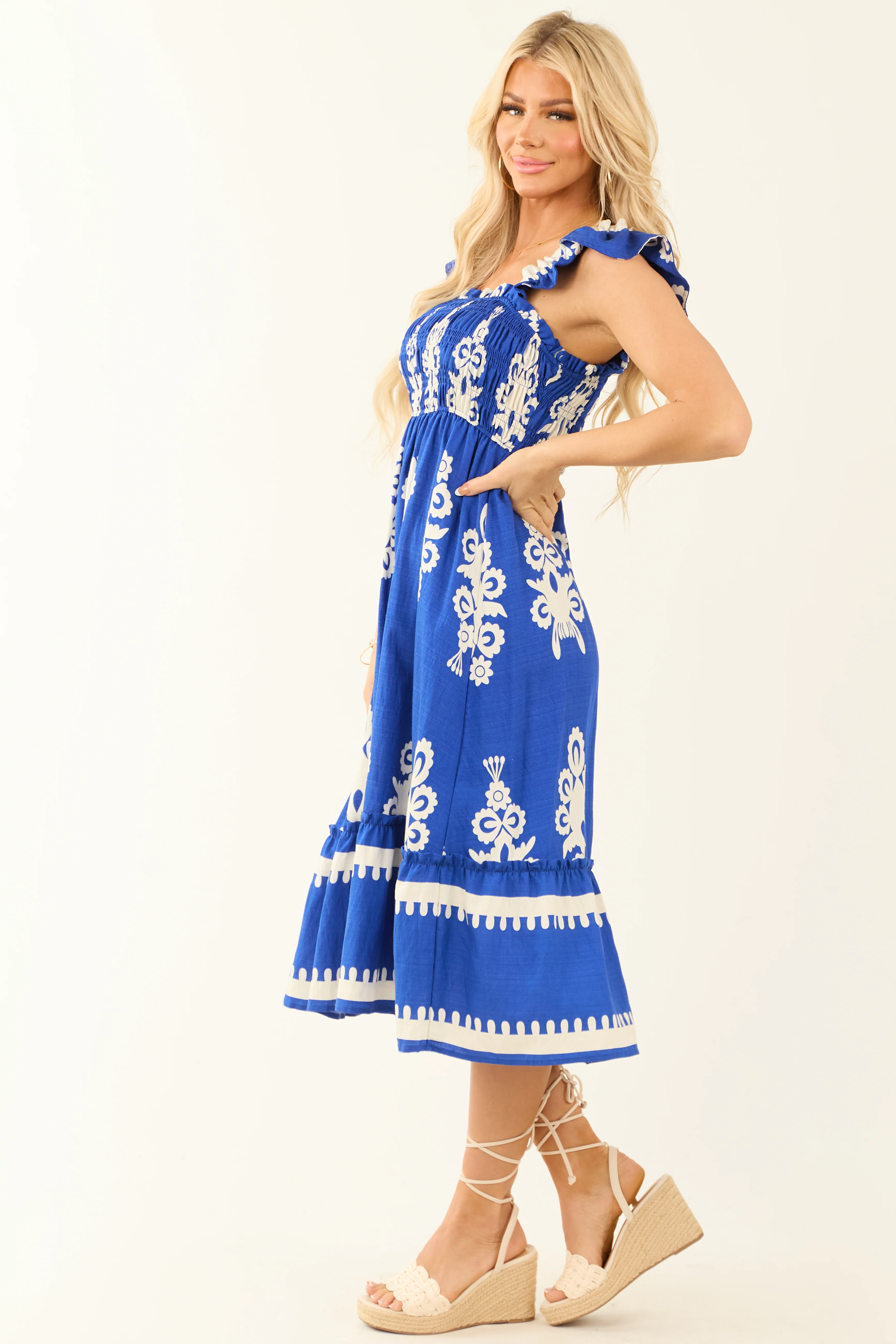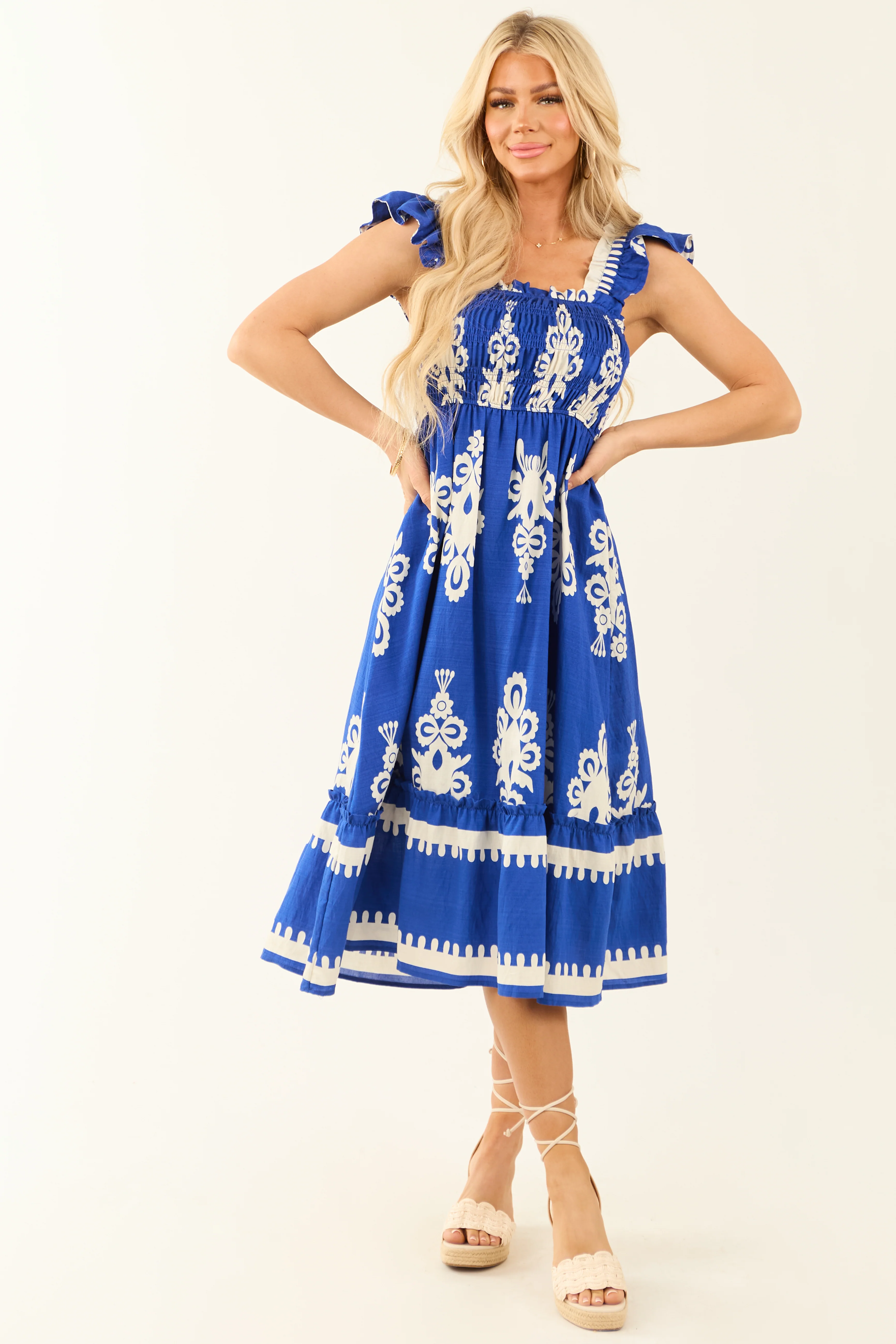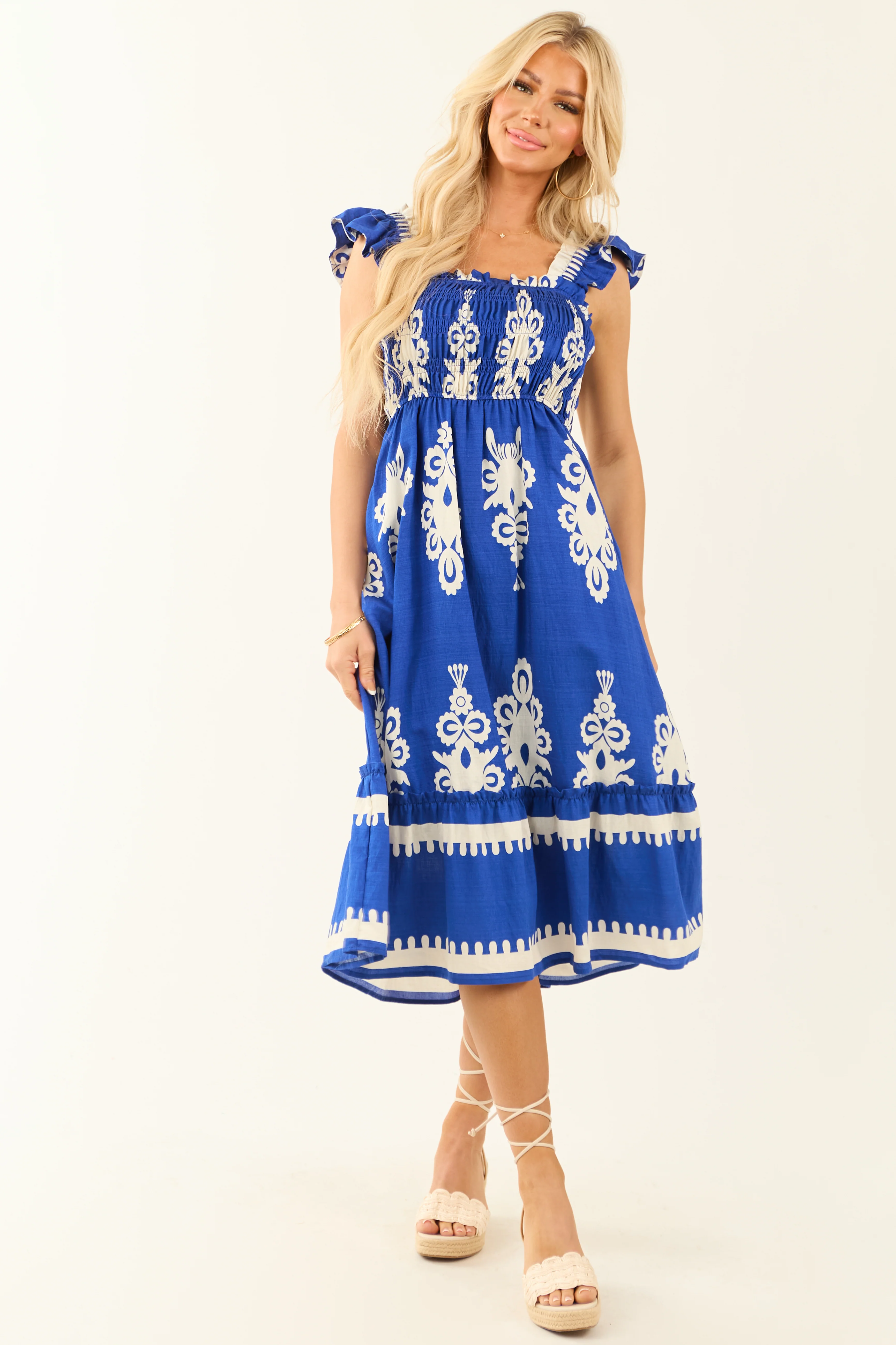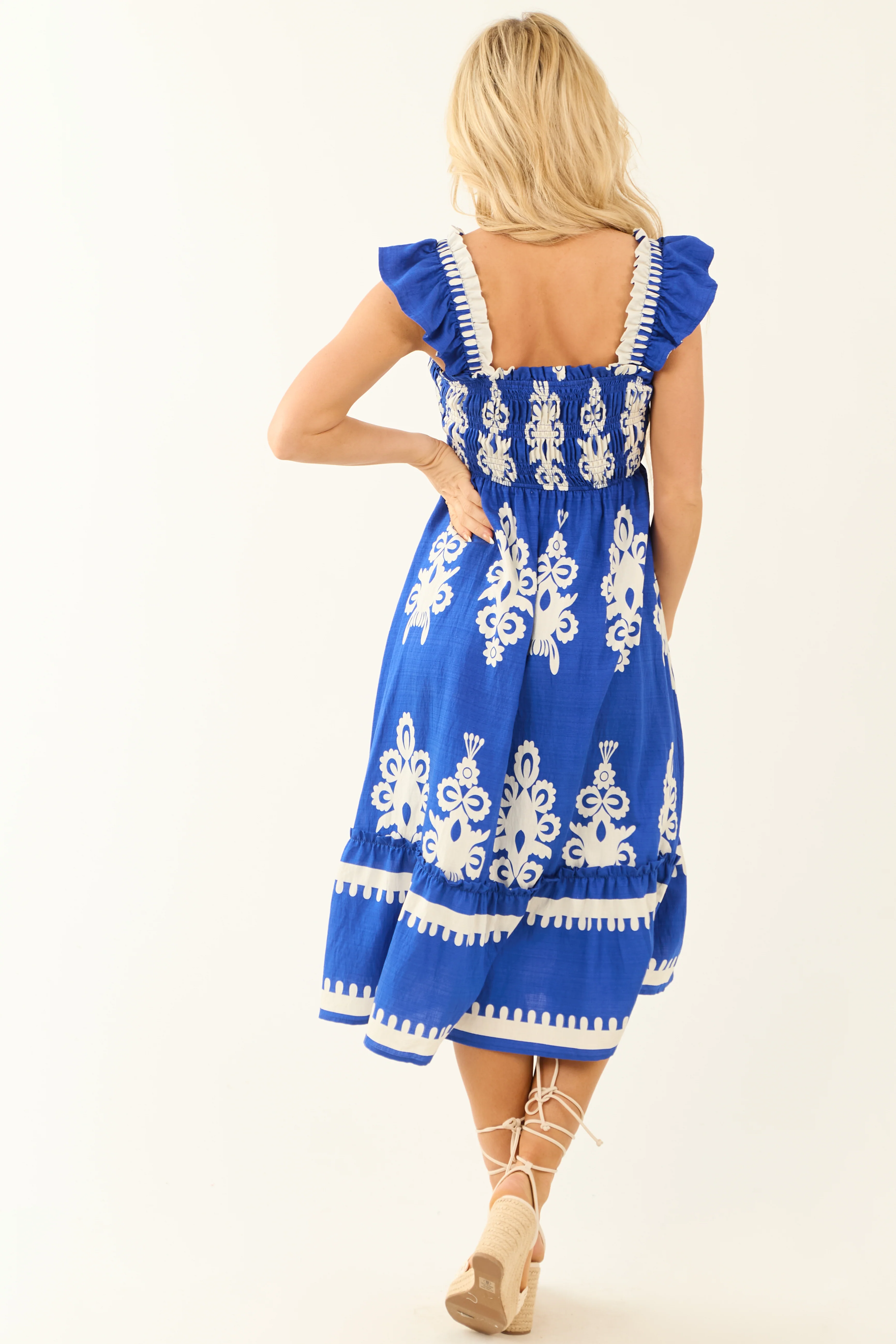 Cobalt and White Abstract Print Smocked Midi Sun Dress