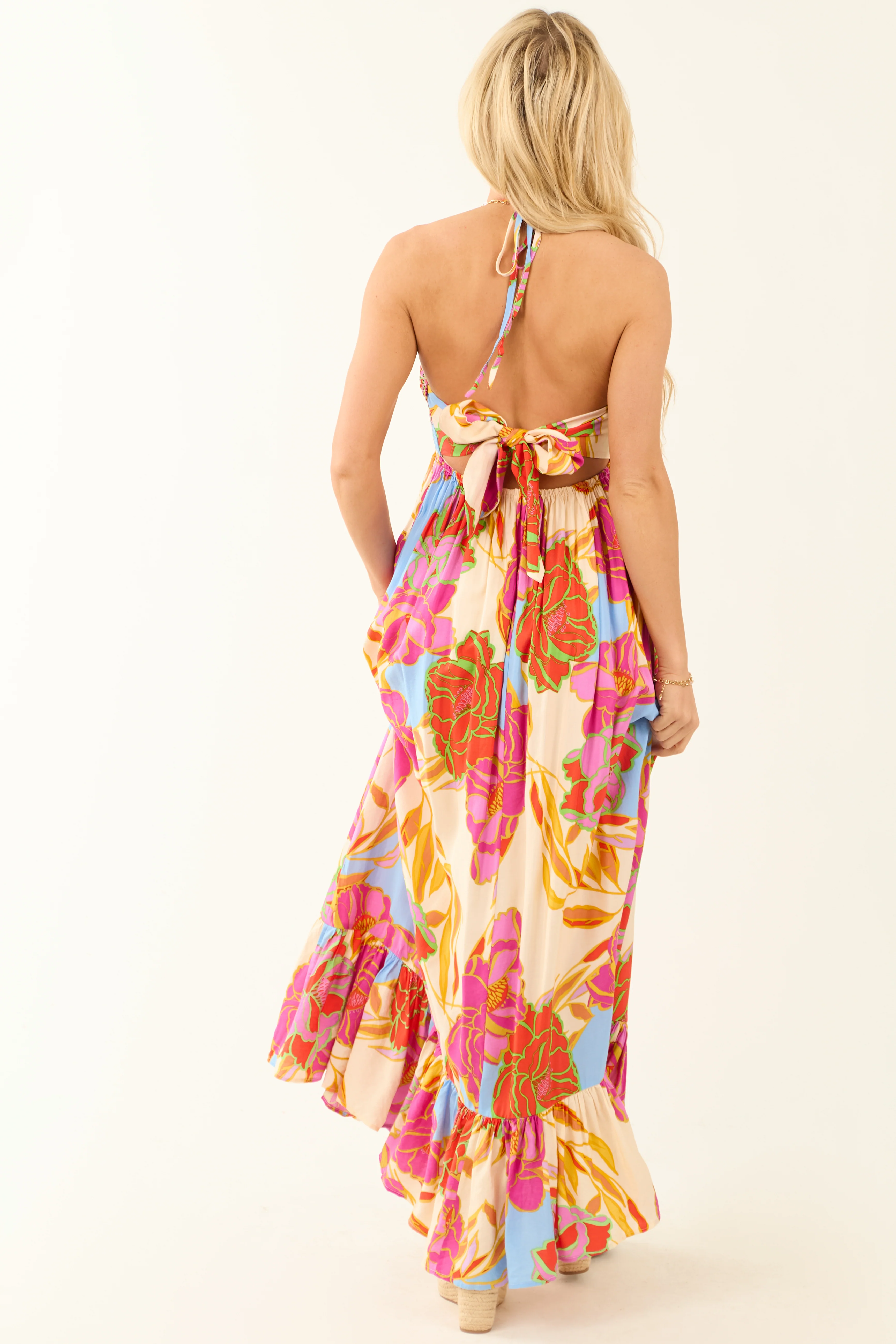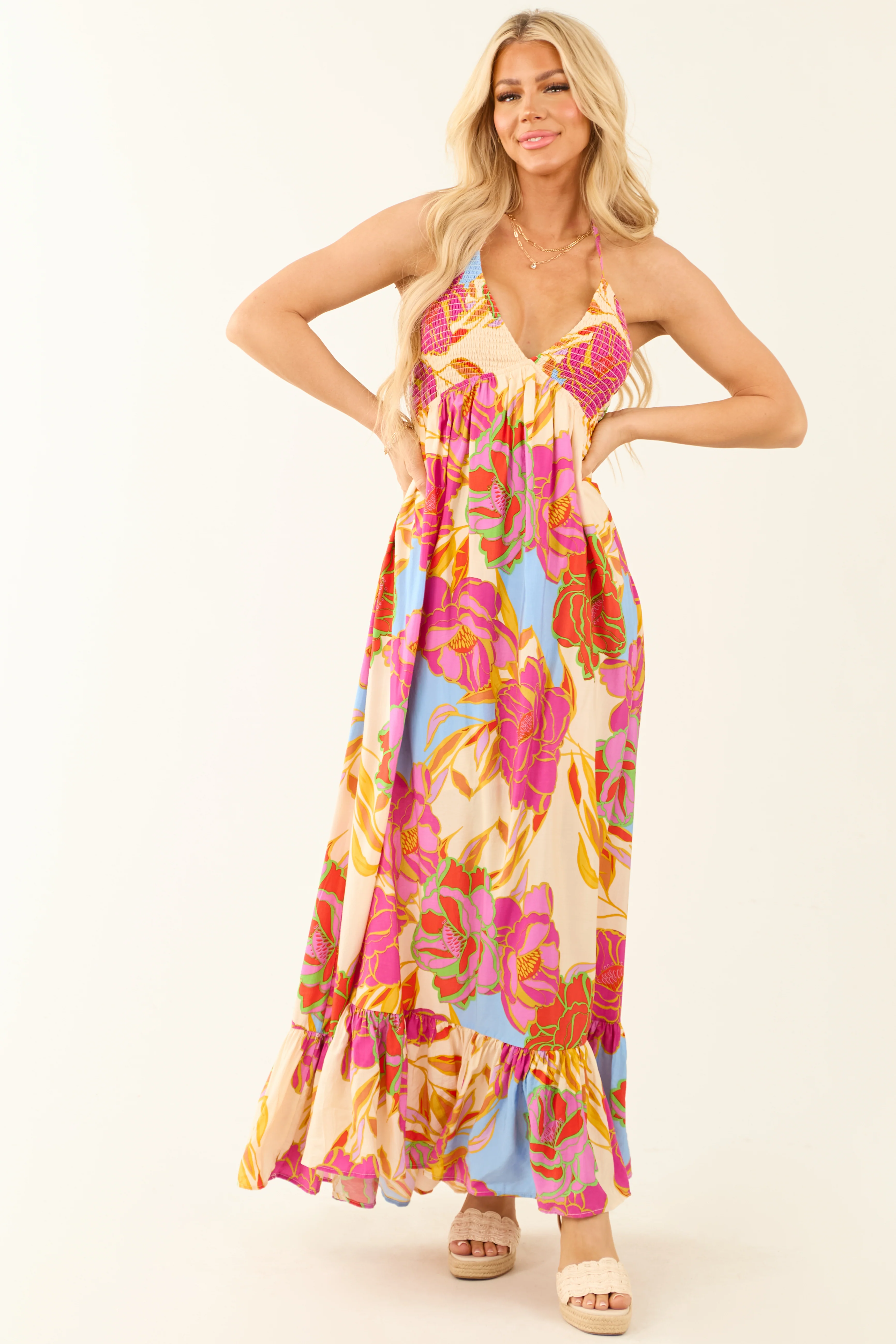 Magenta Floral Smocked Bust Tie Back Maxi Dress