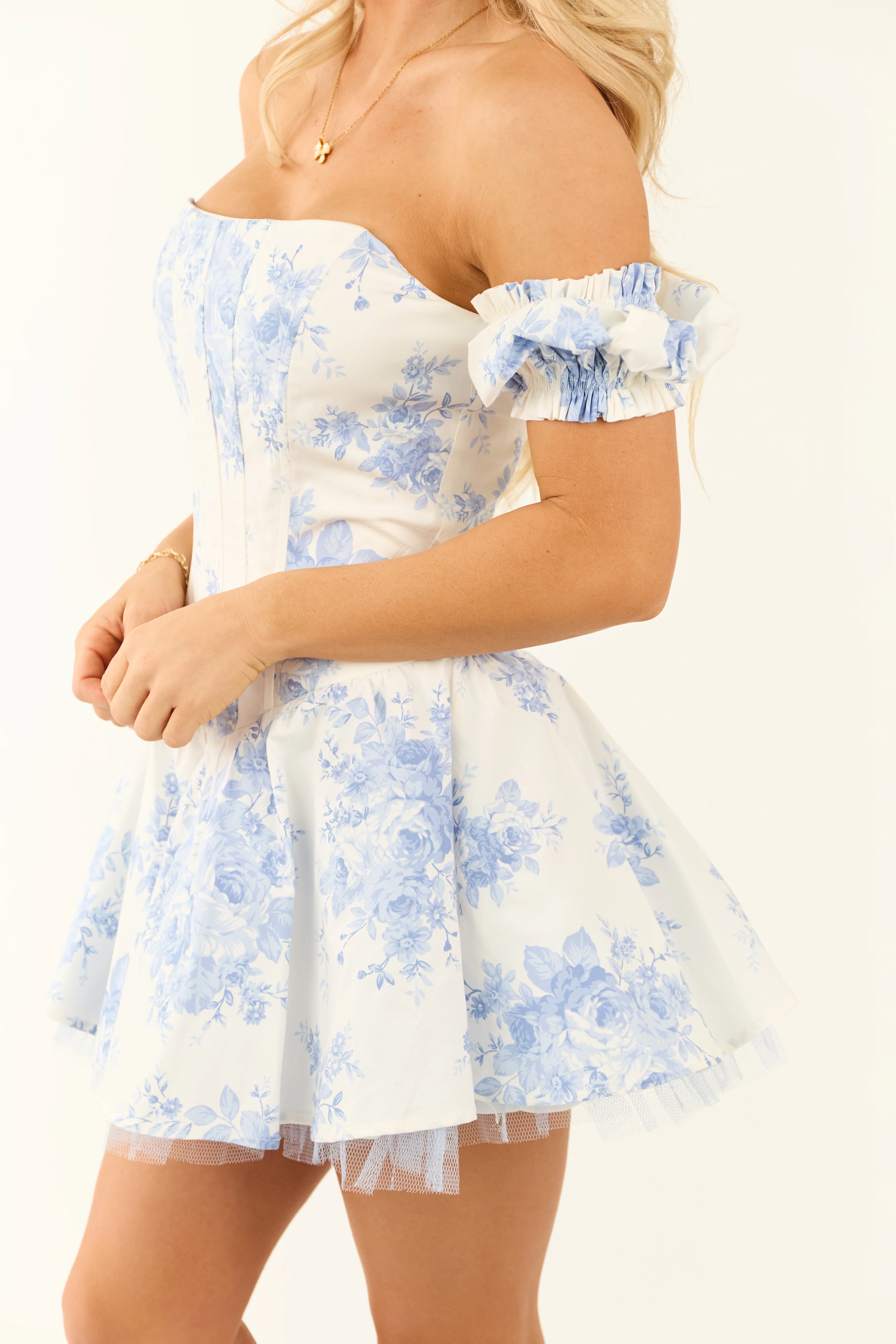 White Rose Print Pleated Lace Corset Mini Dress