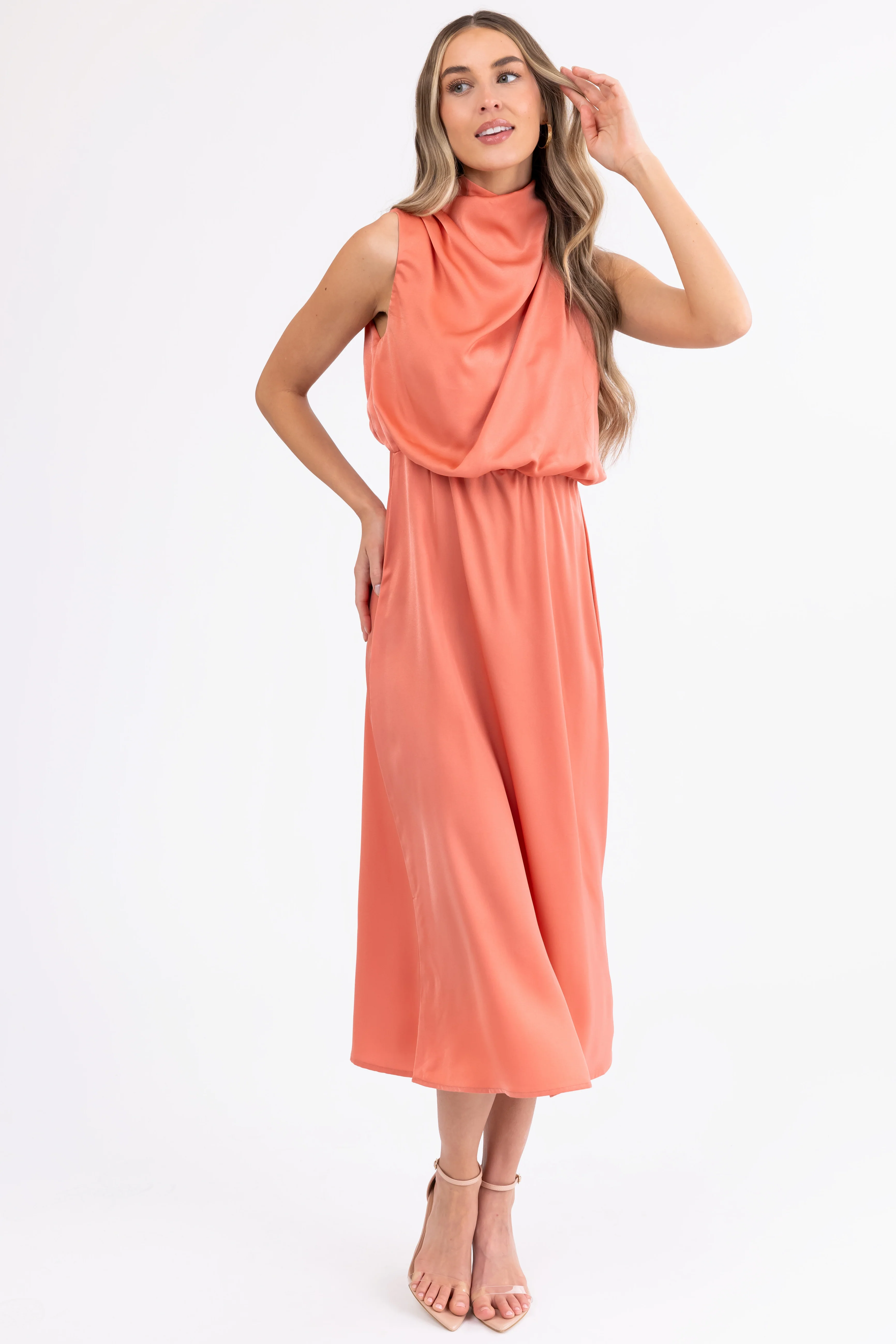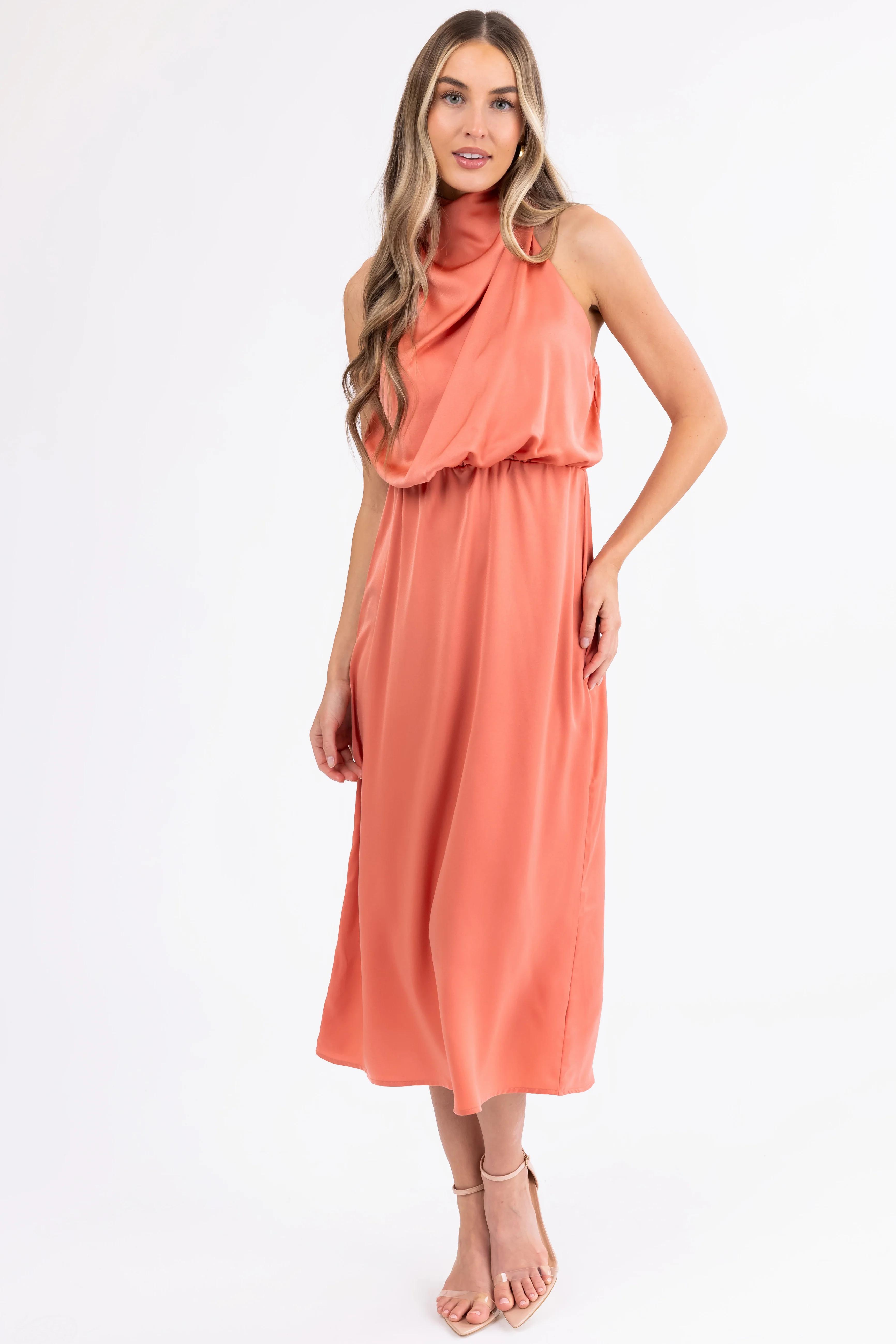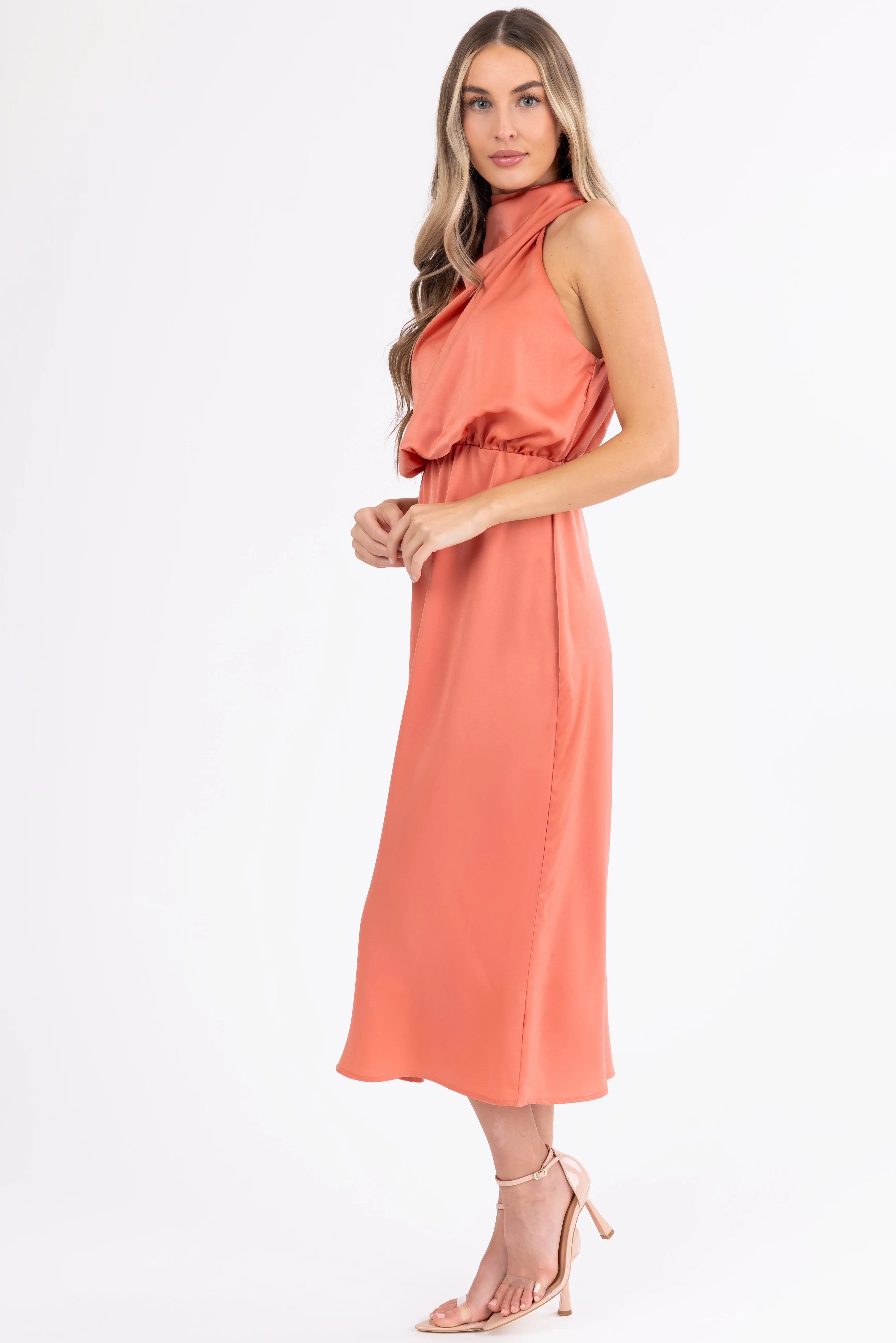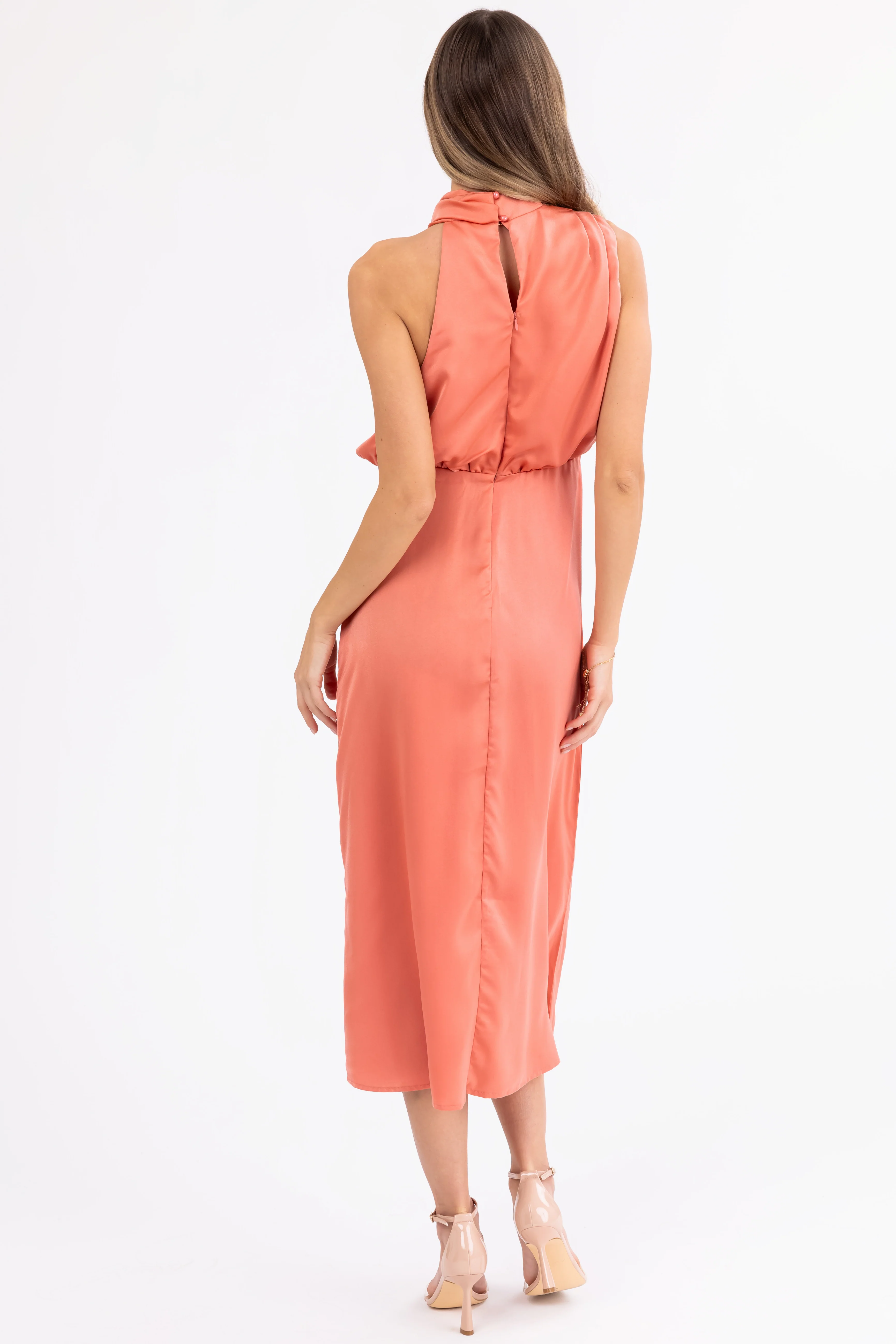 Coral Satin Halter Sleeveless Midi Dress