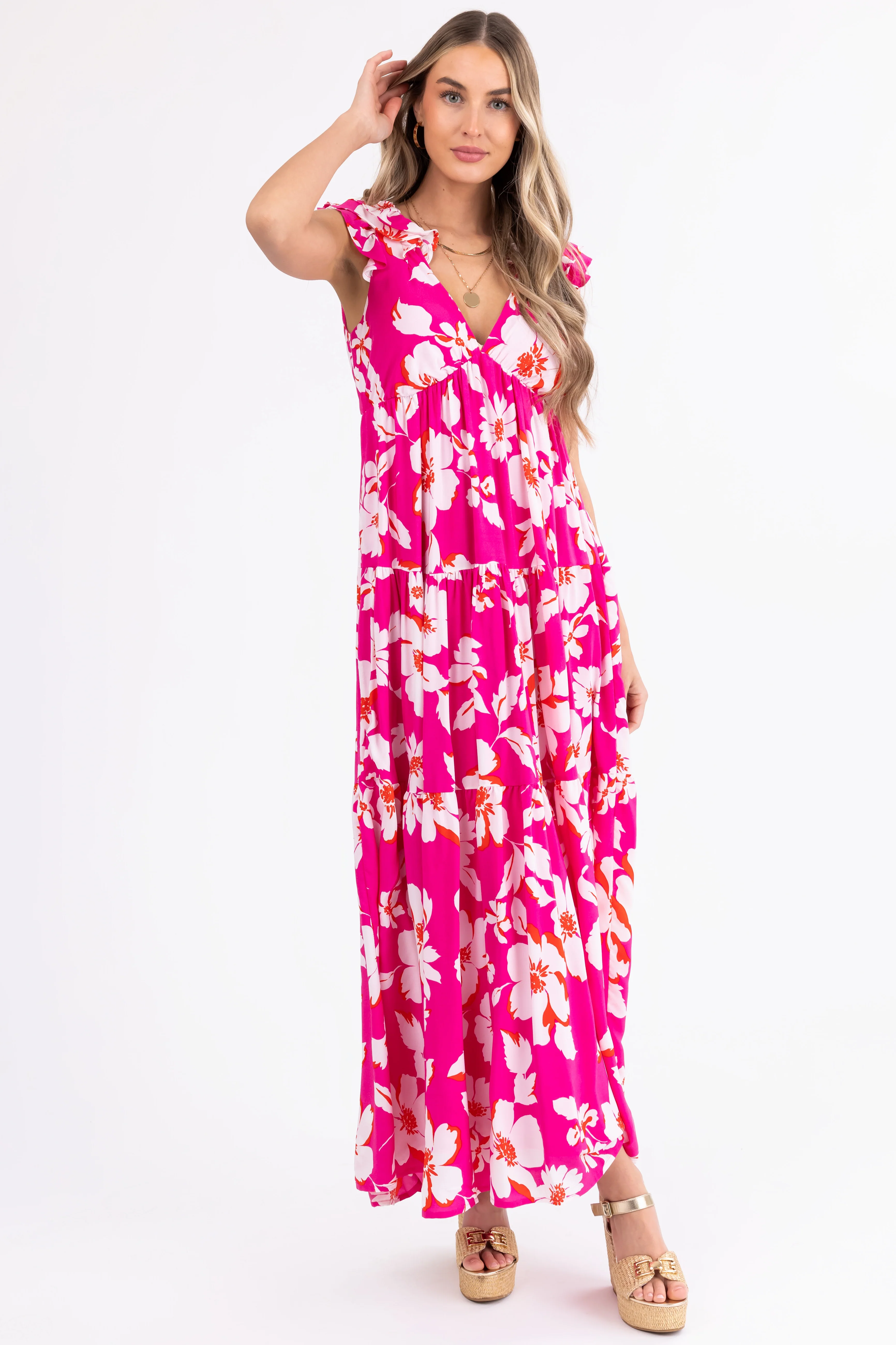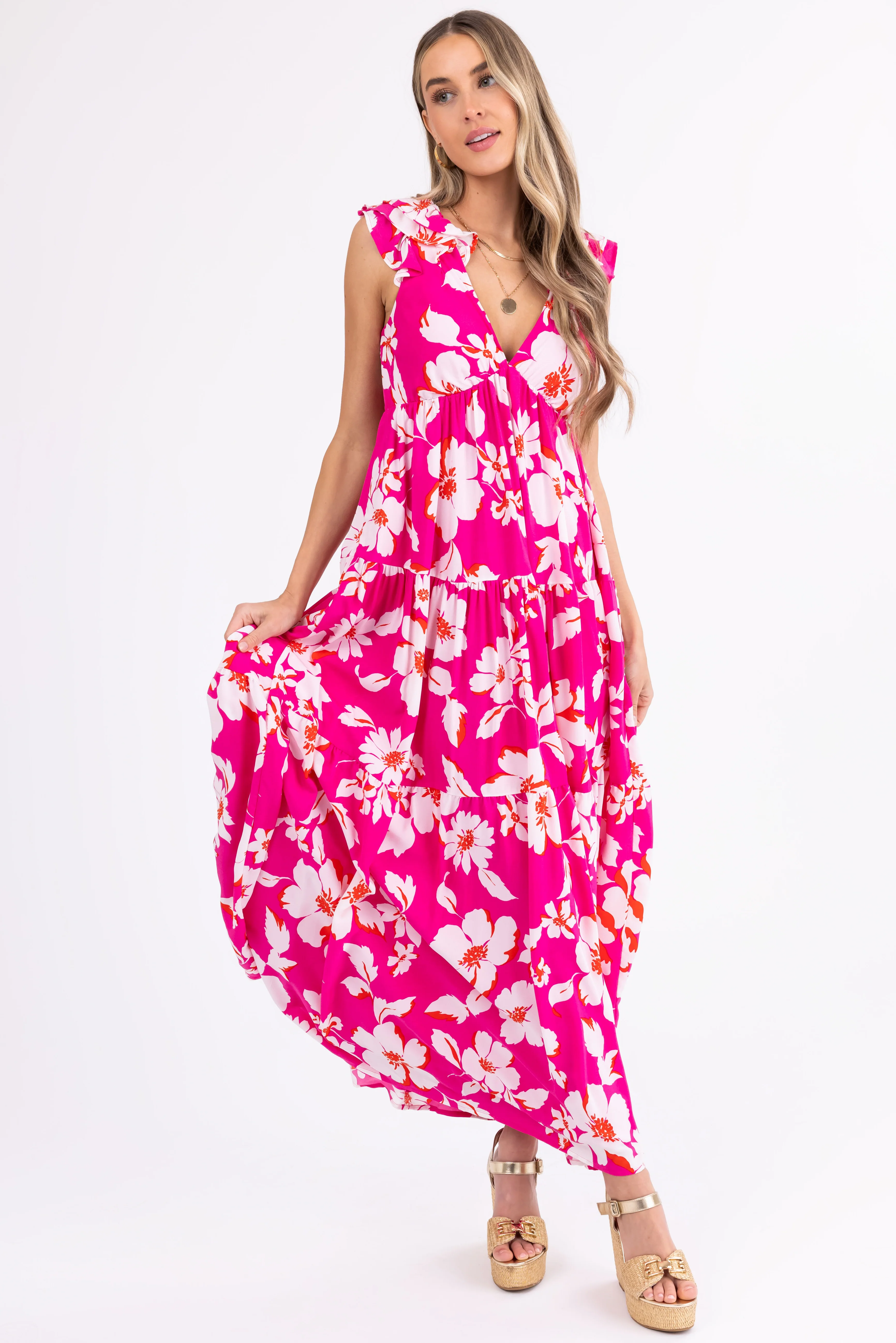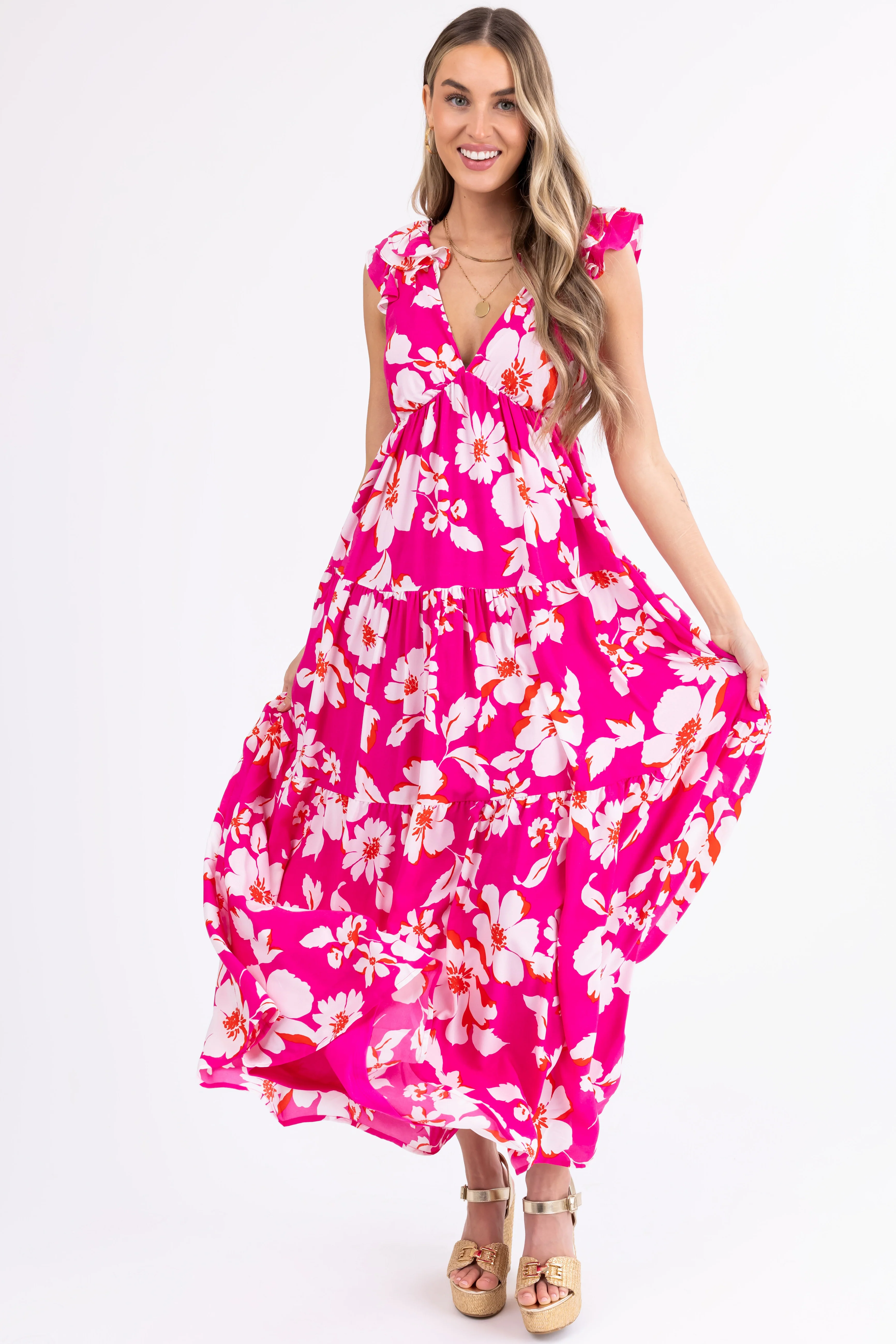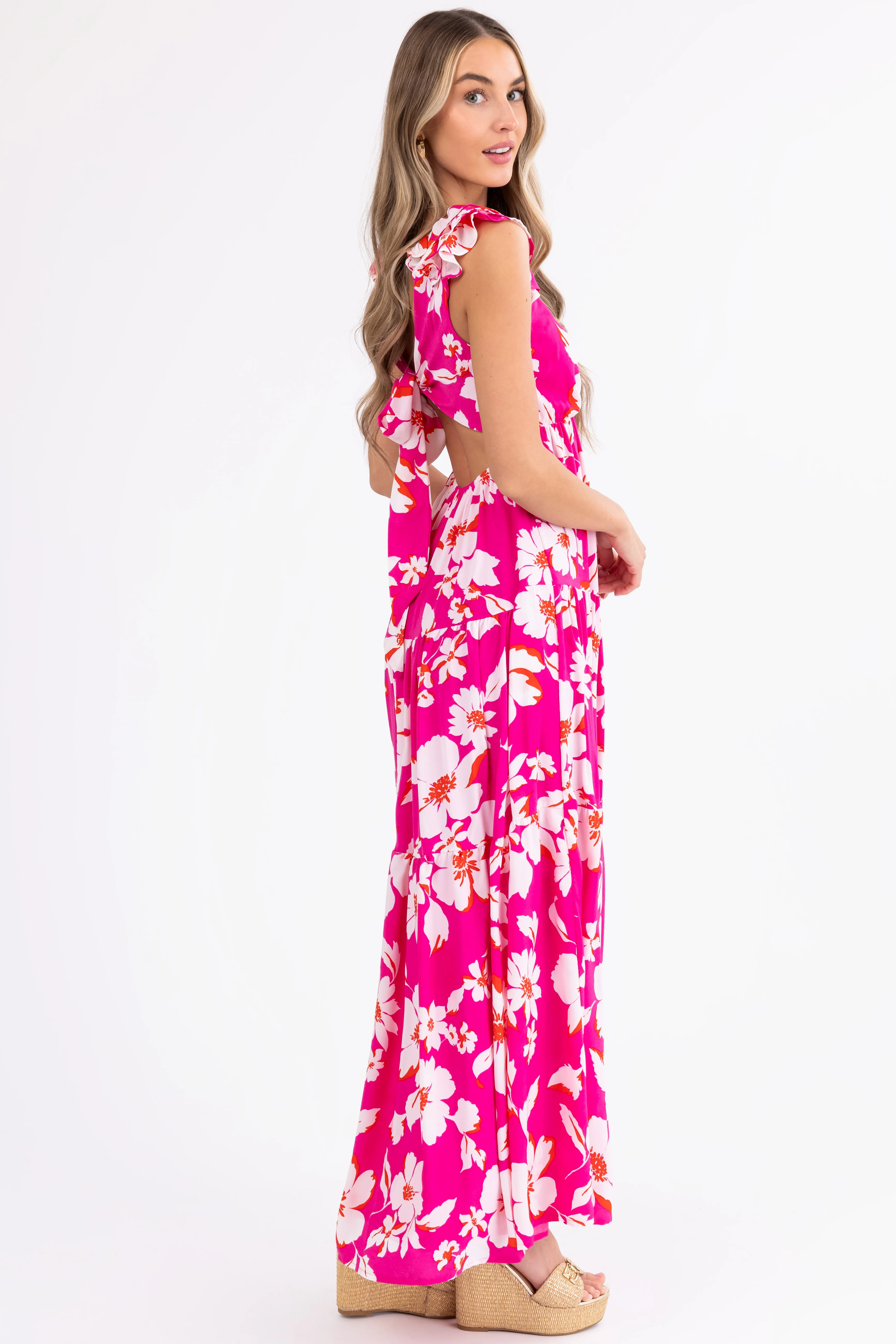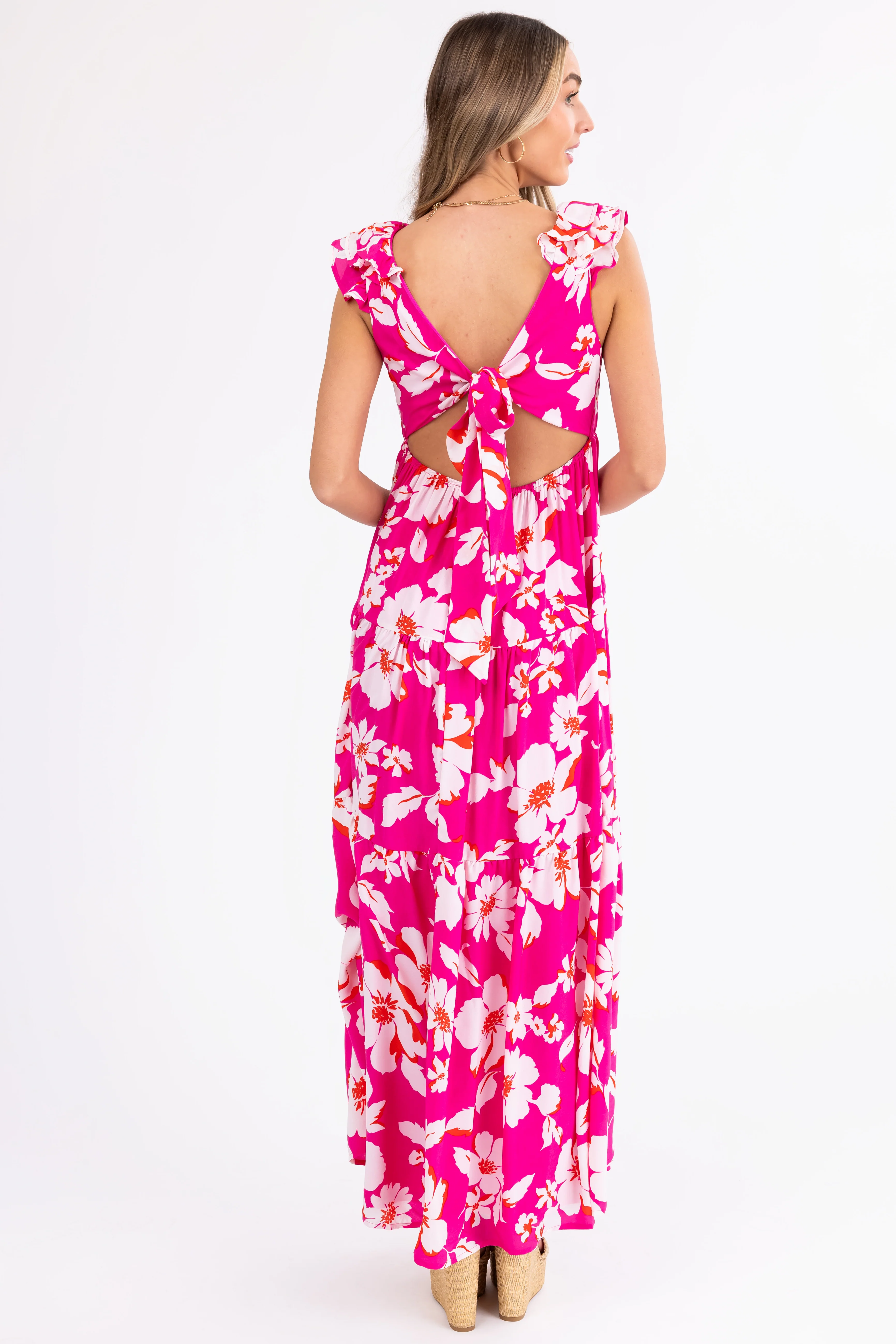 Magenta Floral Print Open Back Maxi Dress