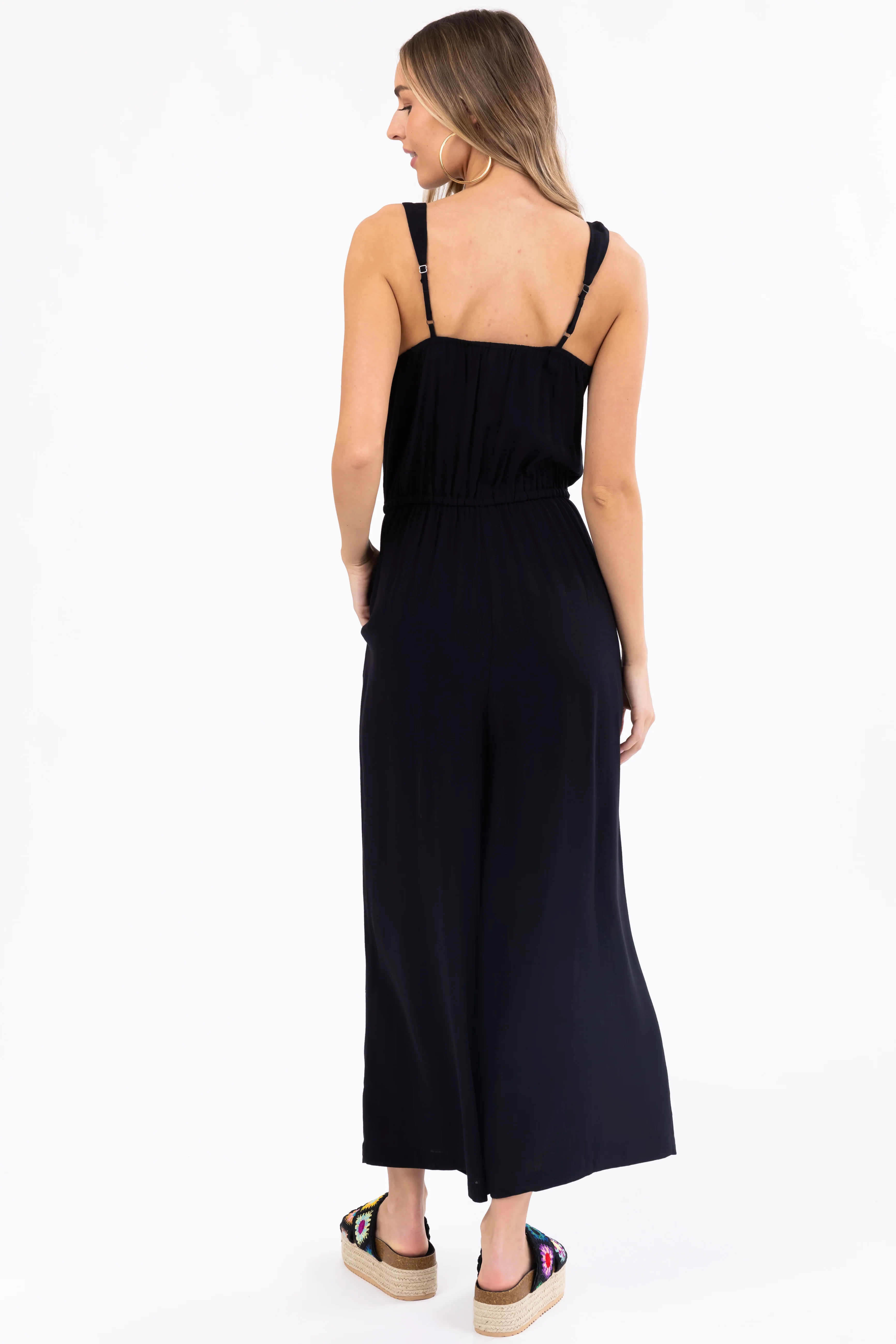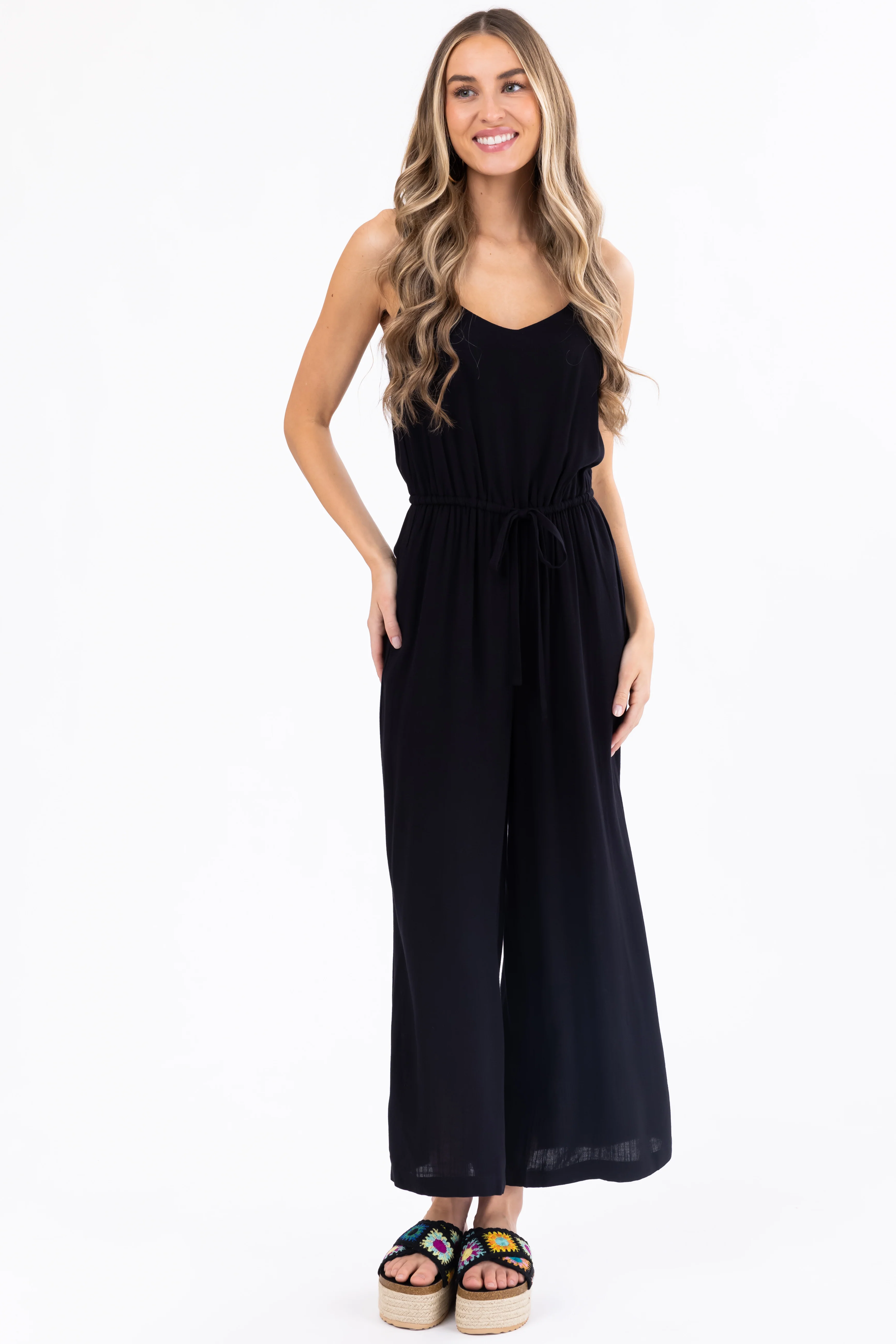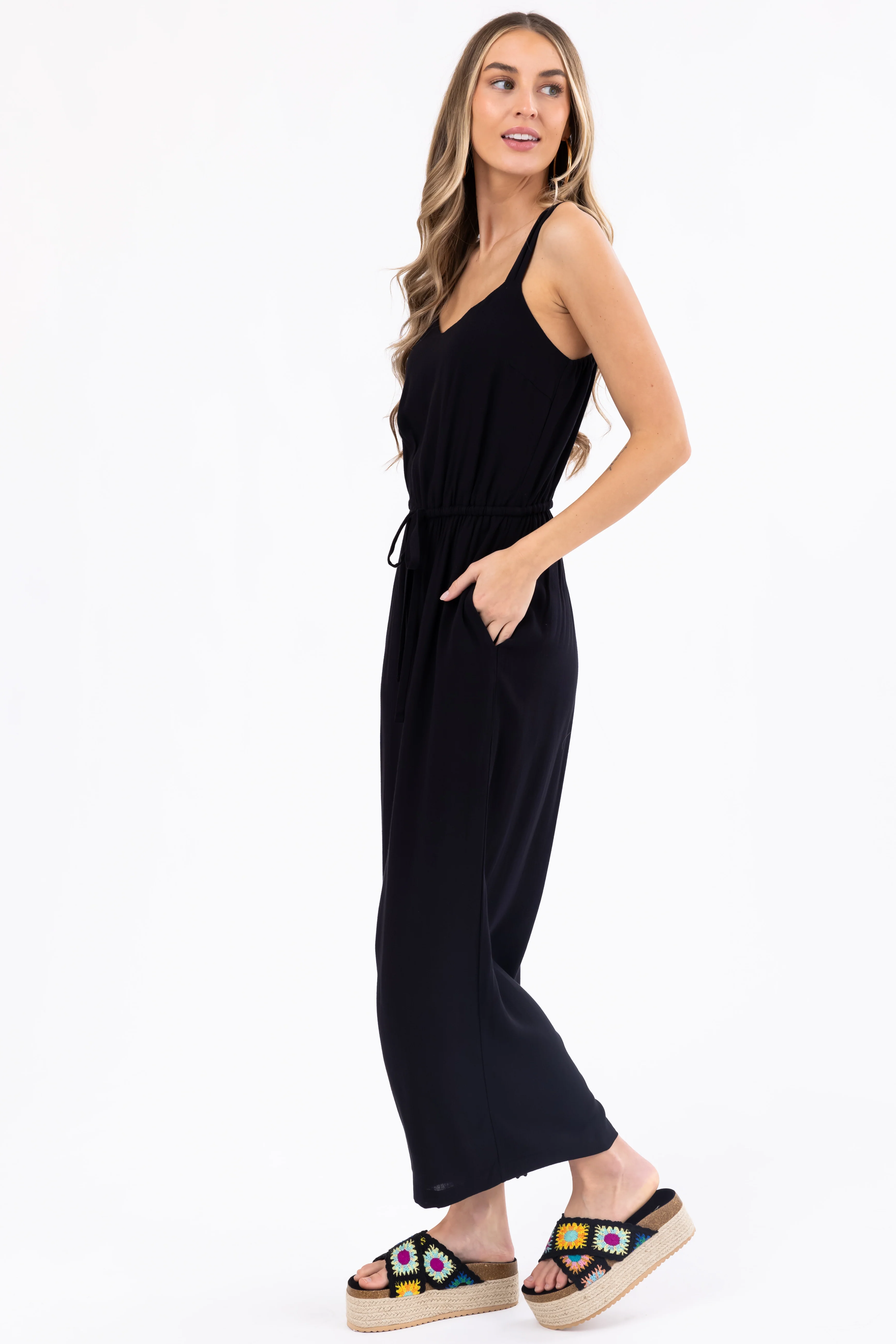 Black Sleeveless Waist Tie Wide Leg Jumpsuit