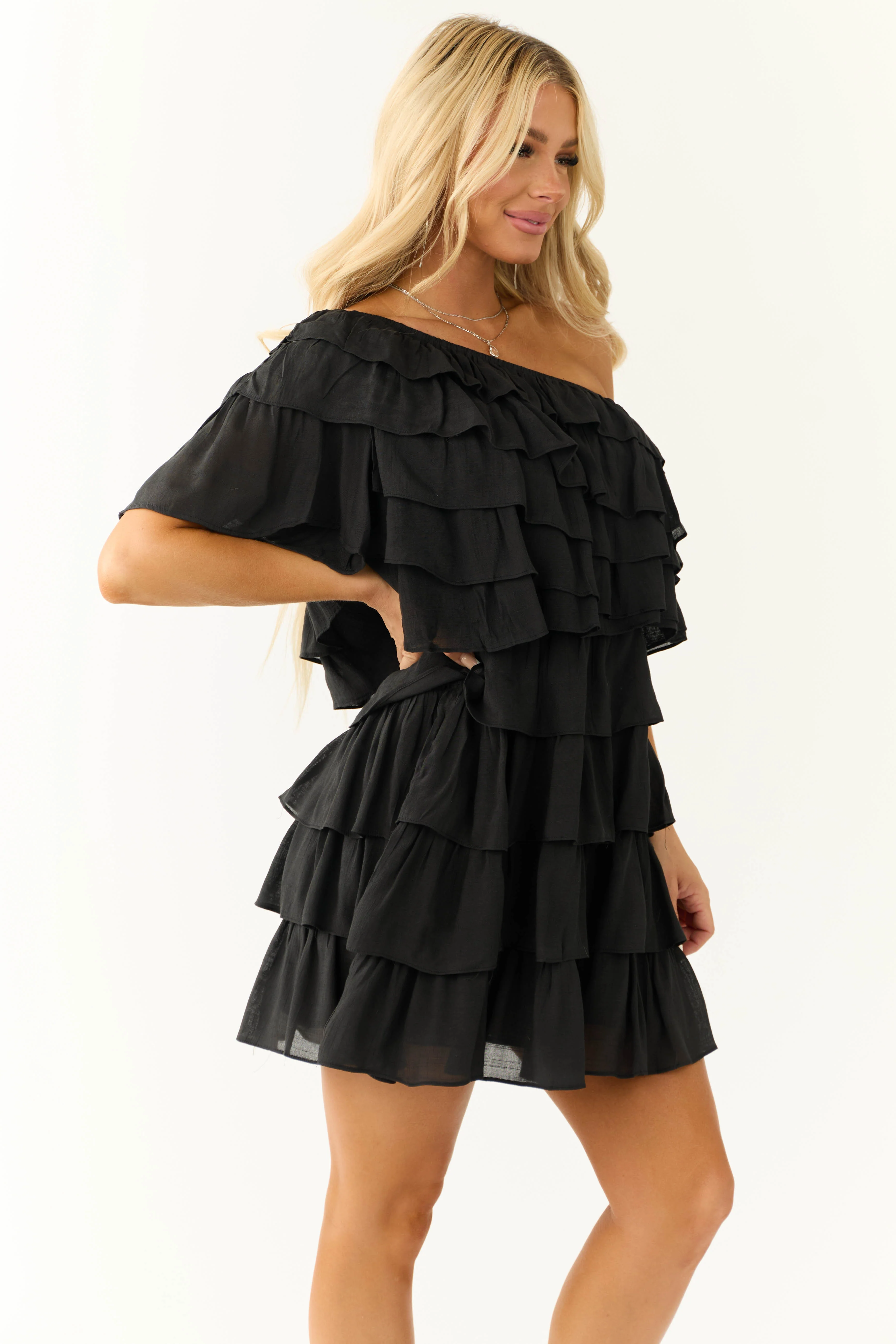 Black One Shoulder Tiered Ruffle Mini Dress