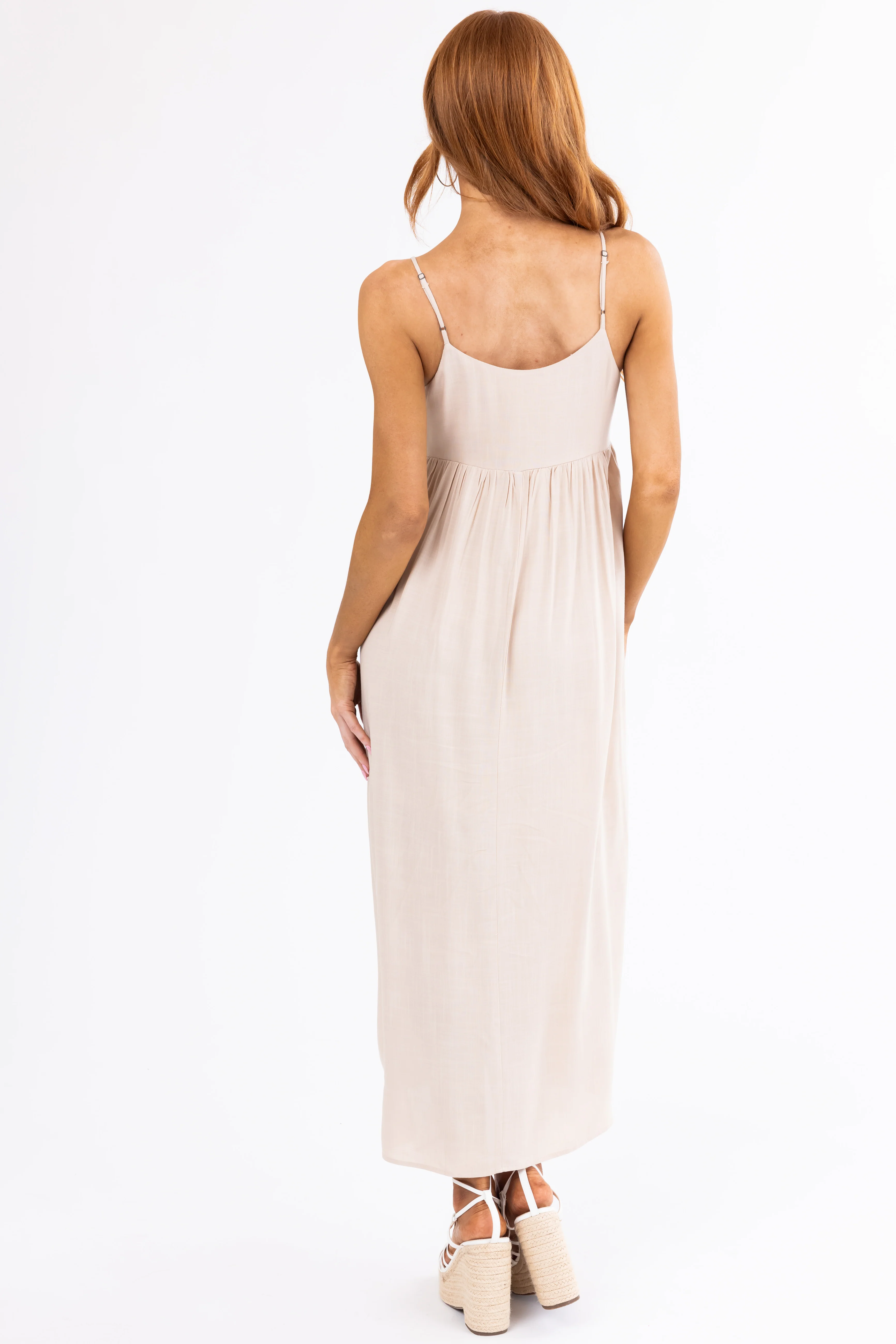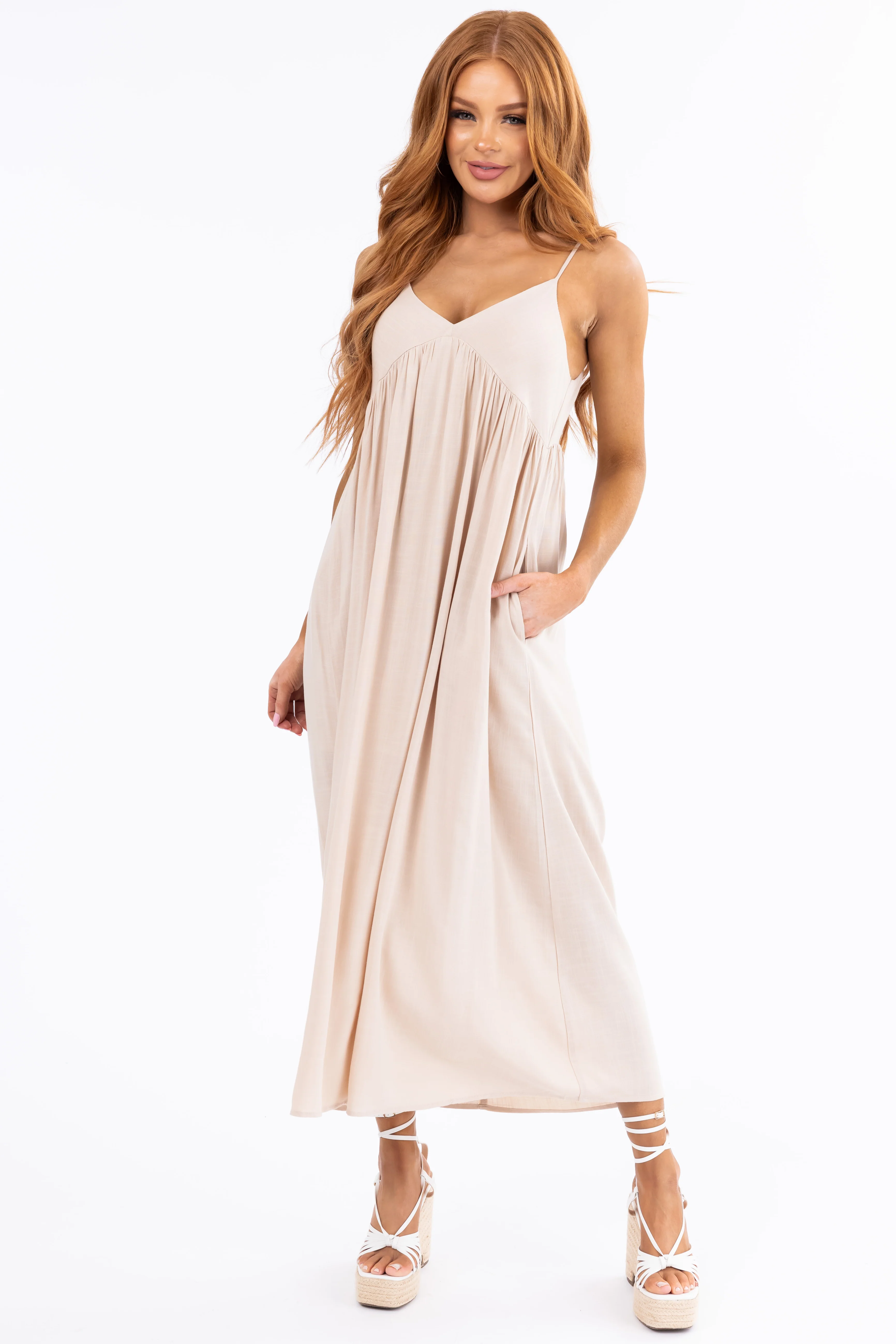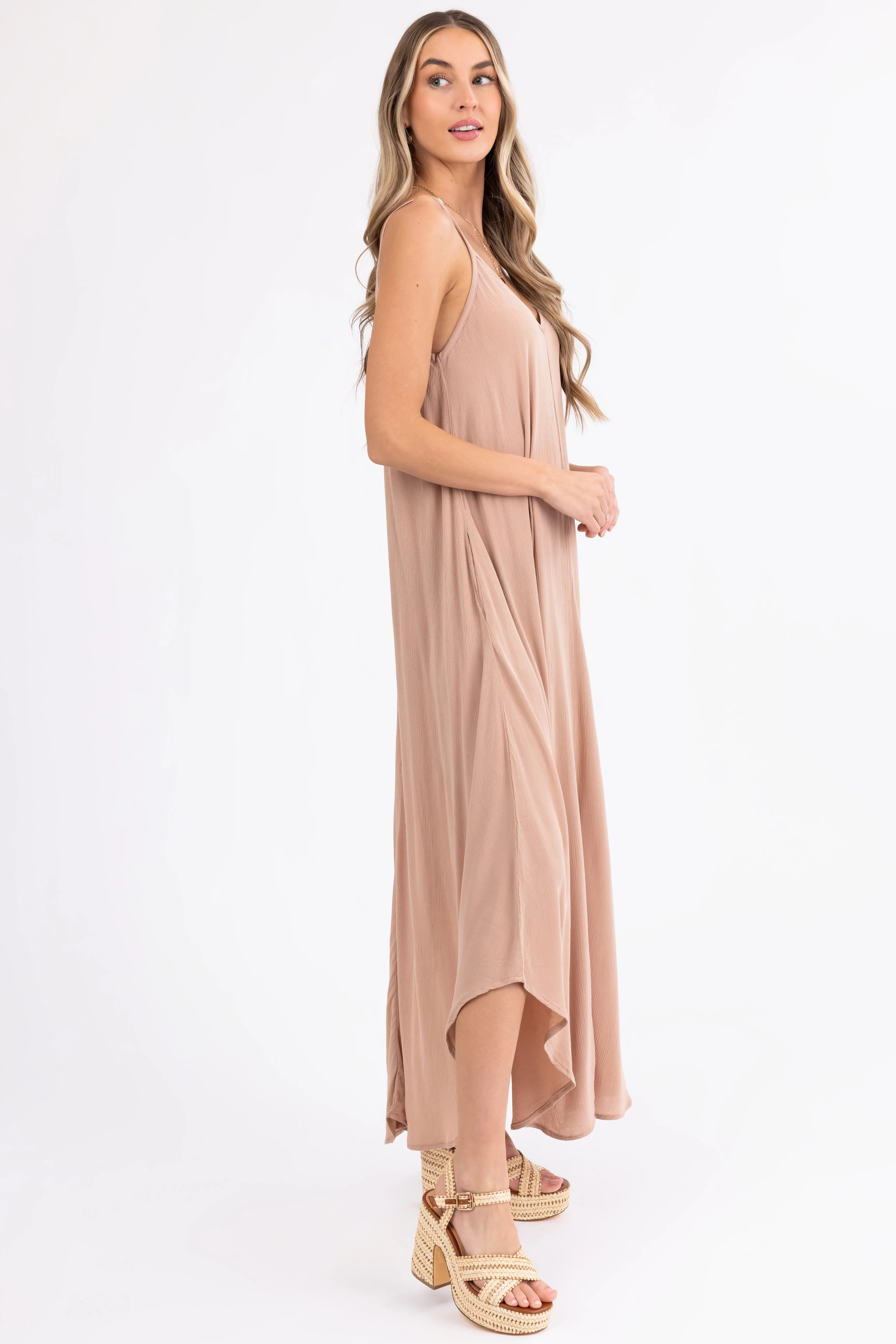Almond Woven Strapless Flowy Midi Dress