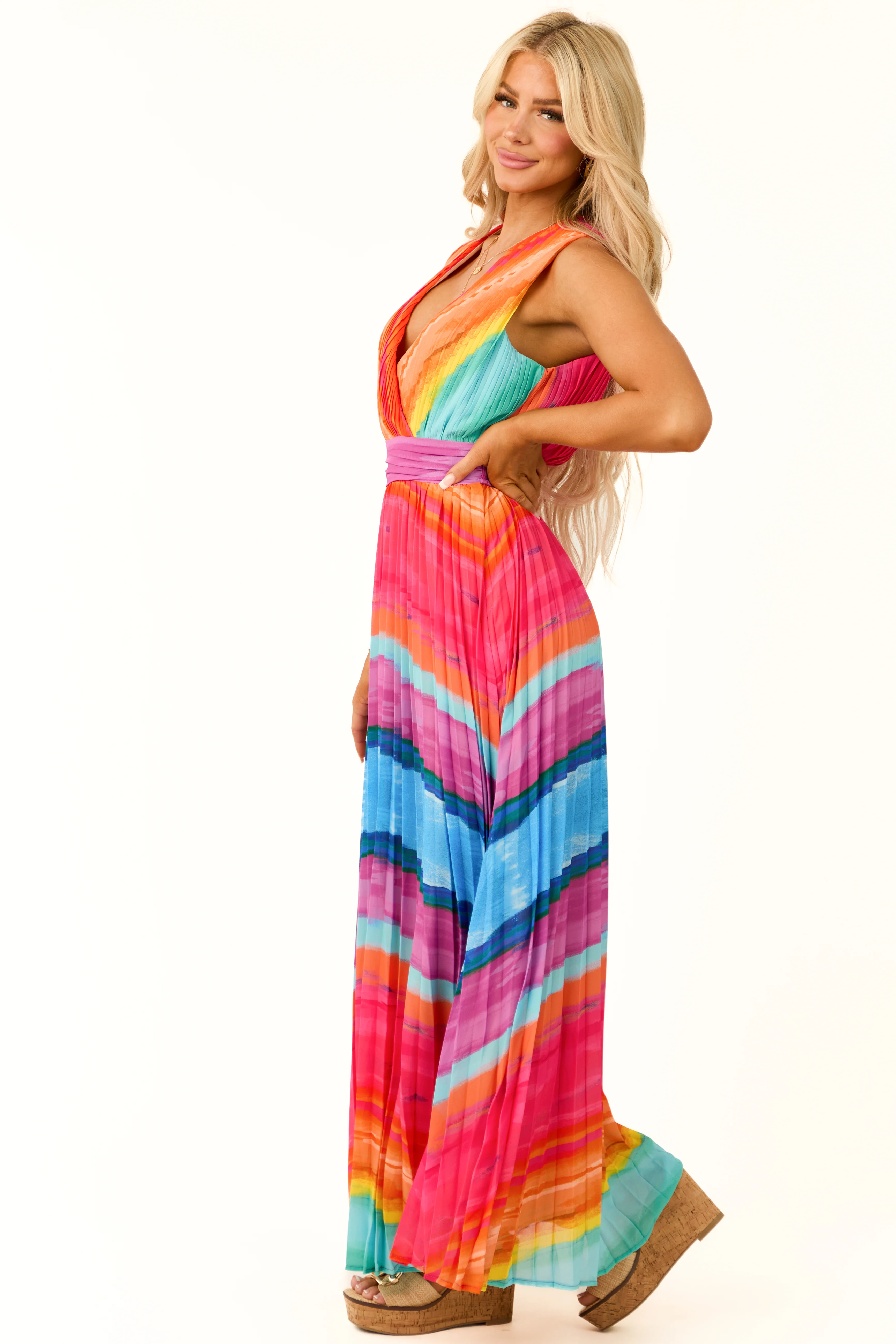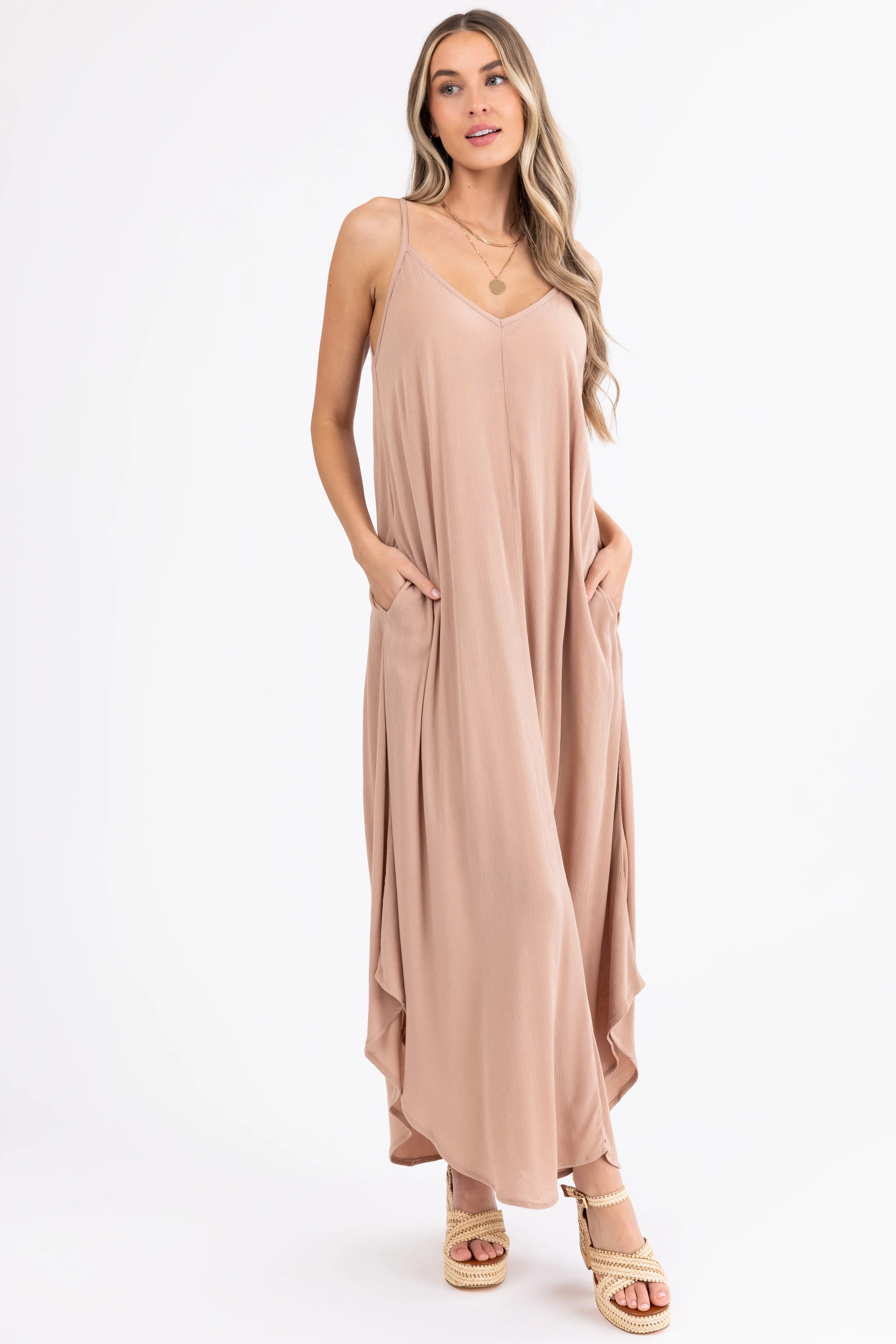 Desert Sand Pleated Sleeveless Overlay Jumpsuit