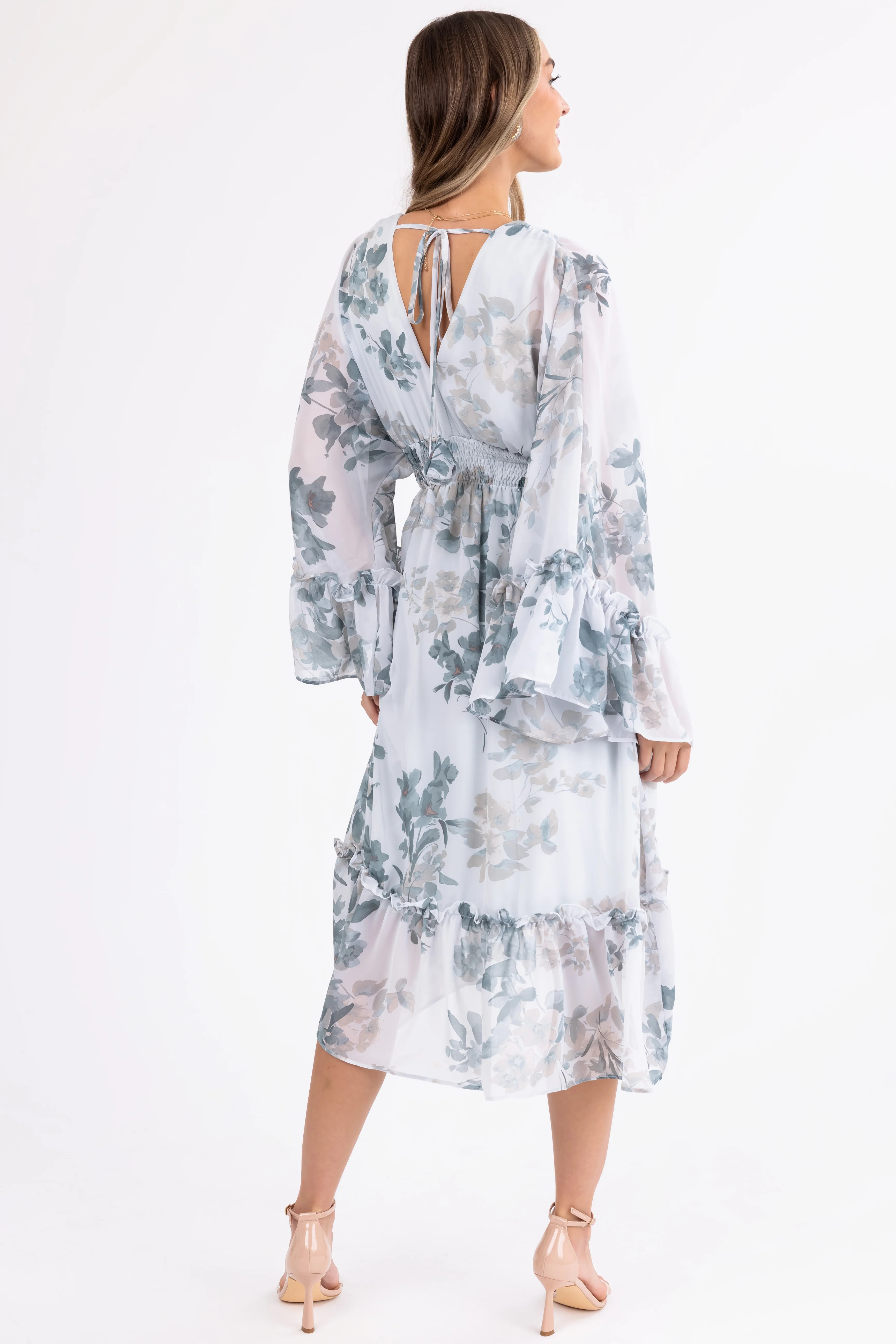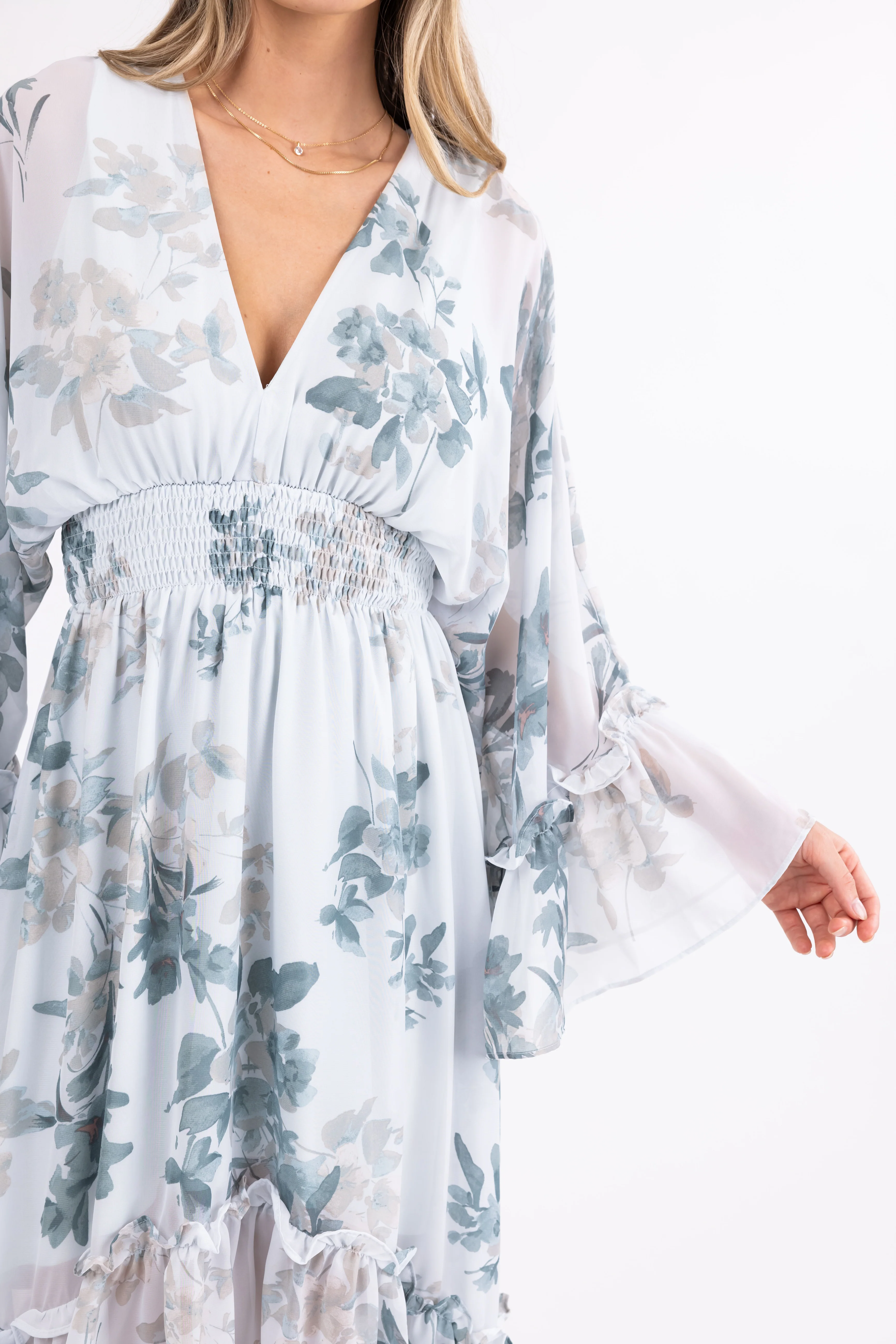 Arctic Blue Floral Print V Neck Midi Dress