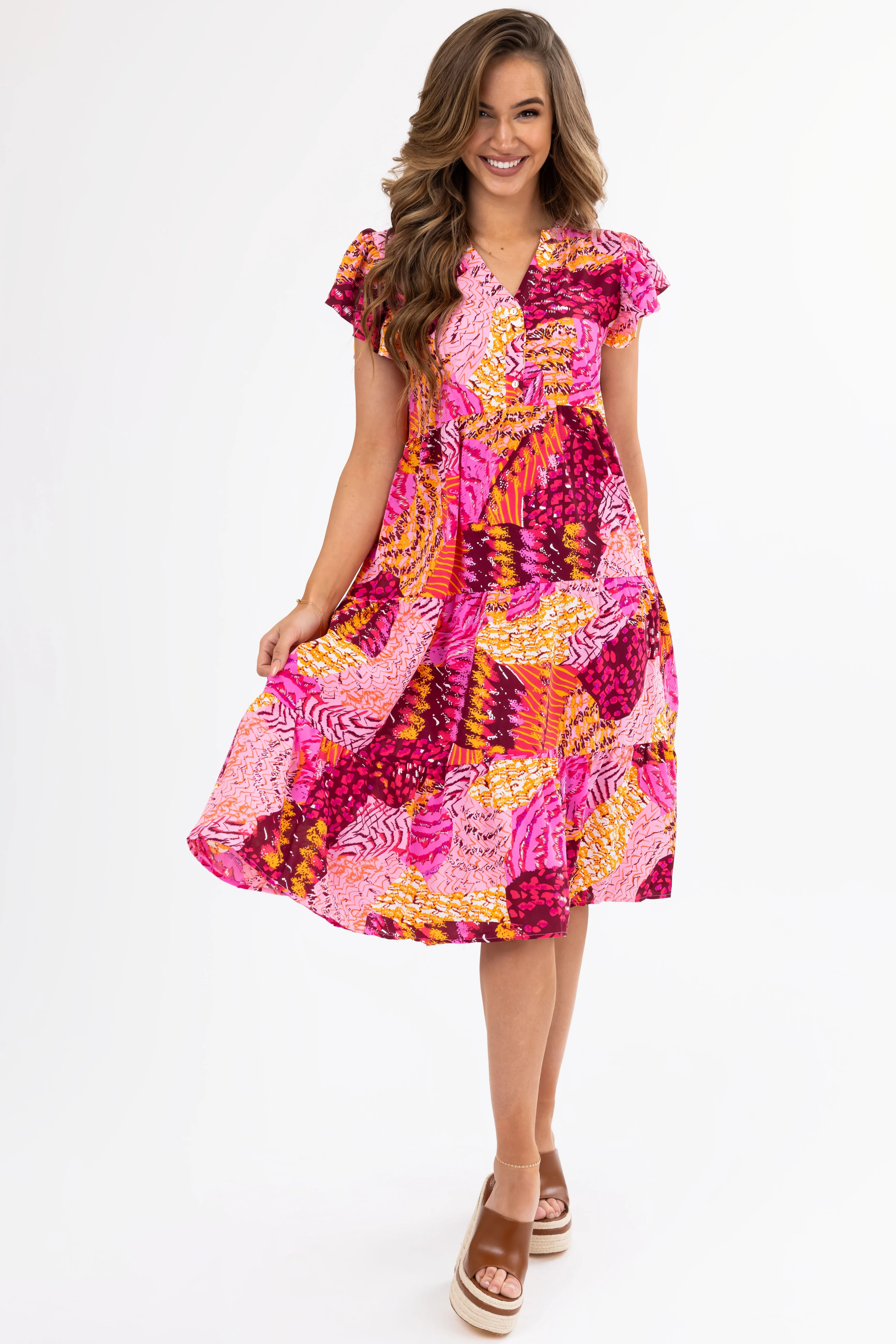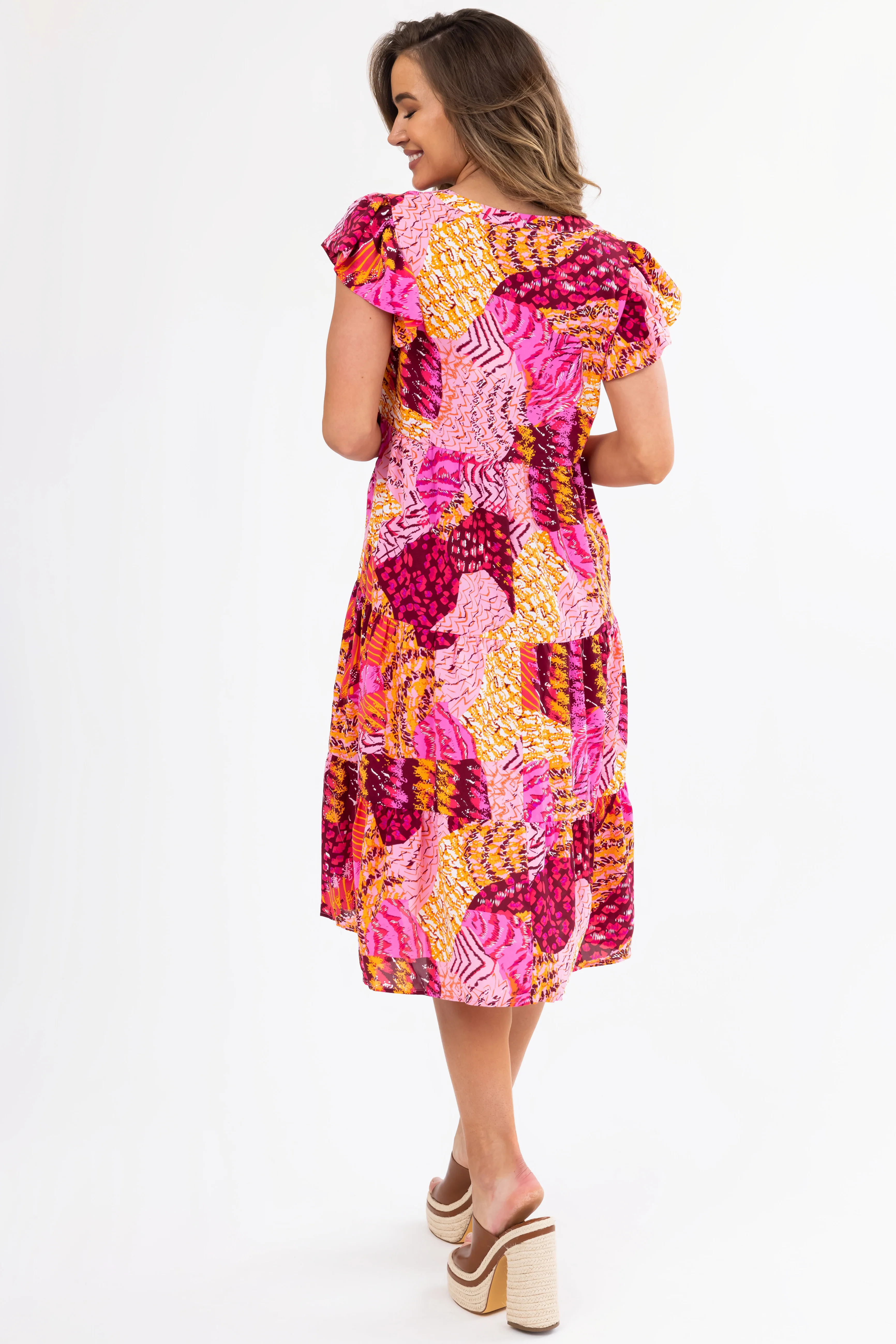 Fuchsia Abstract Print Short Sleeve Midi Dress