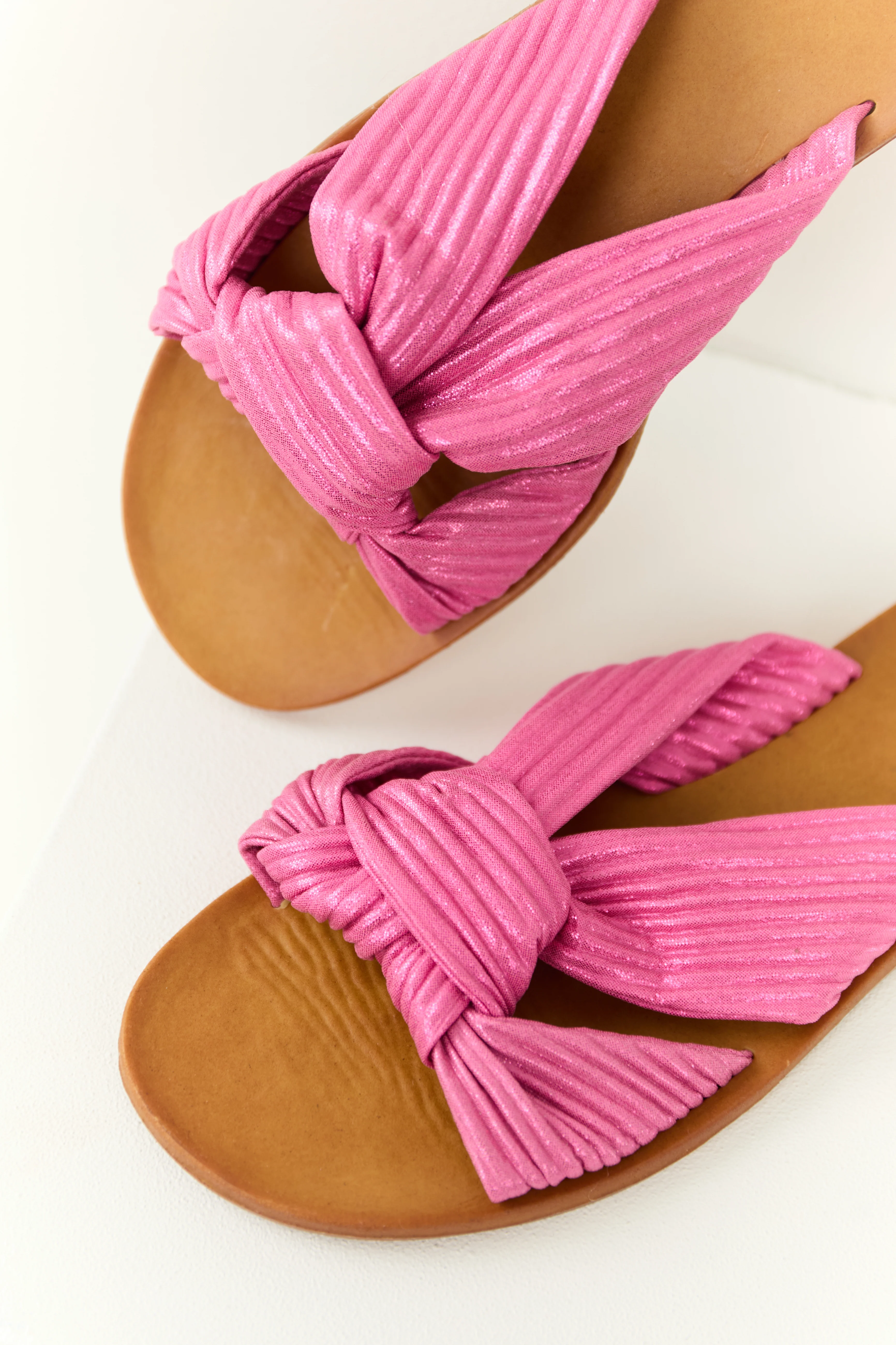 Shiny Bubblegum Fabric Open Toe Slip On Sandals