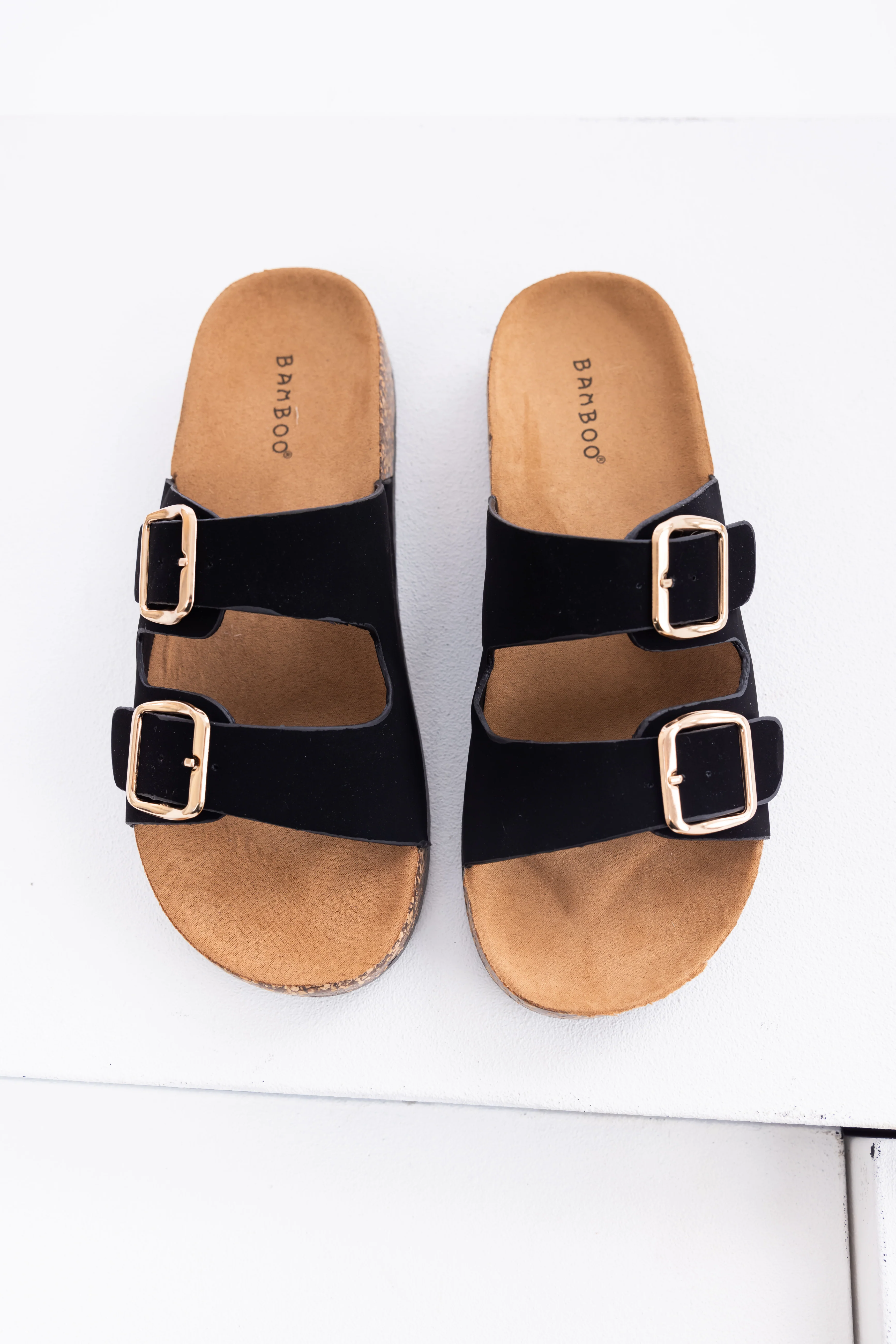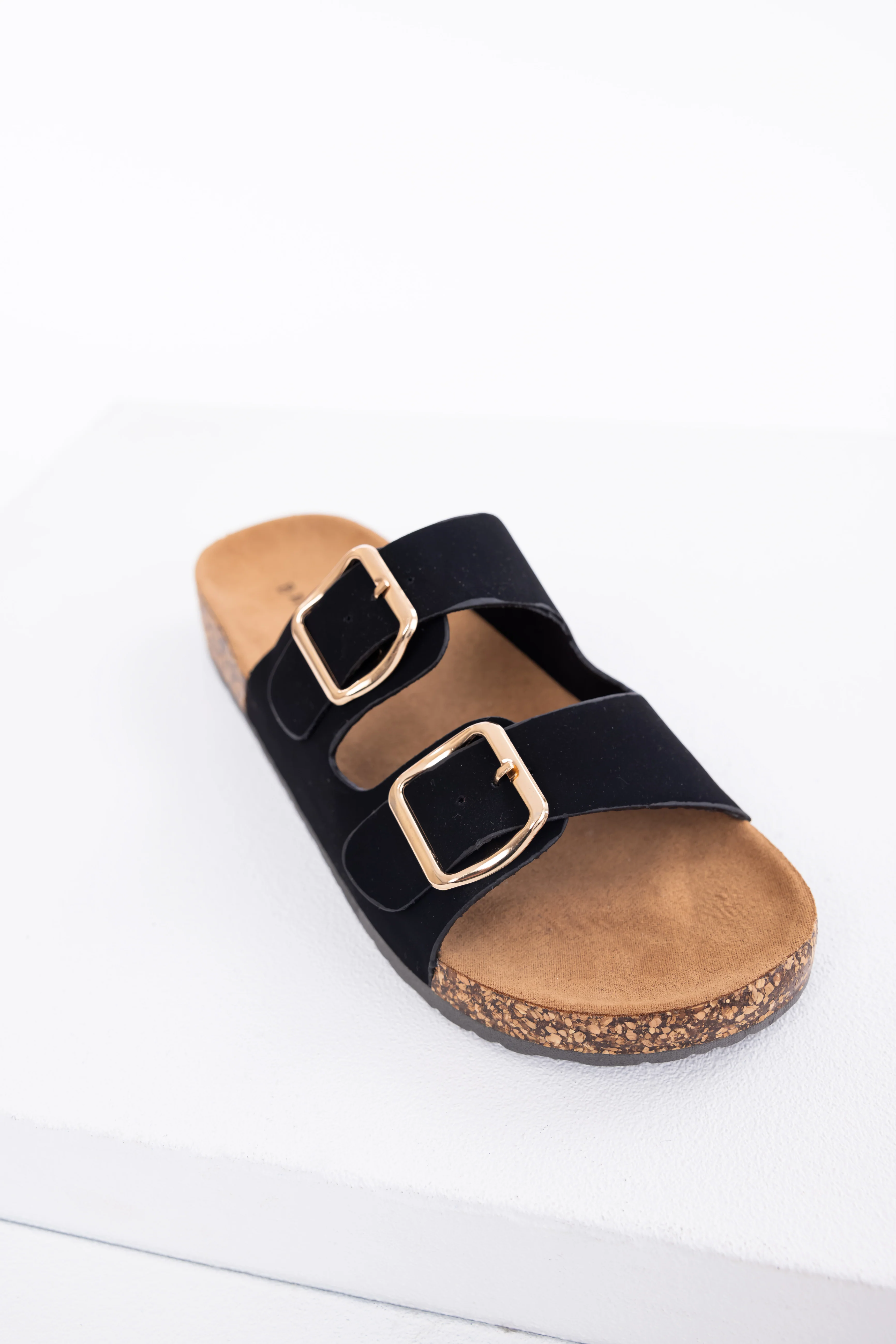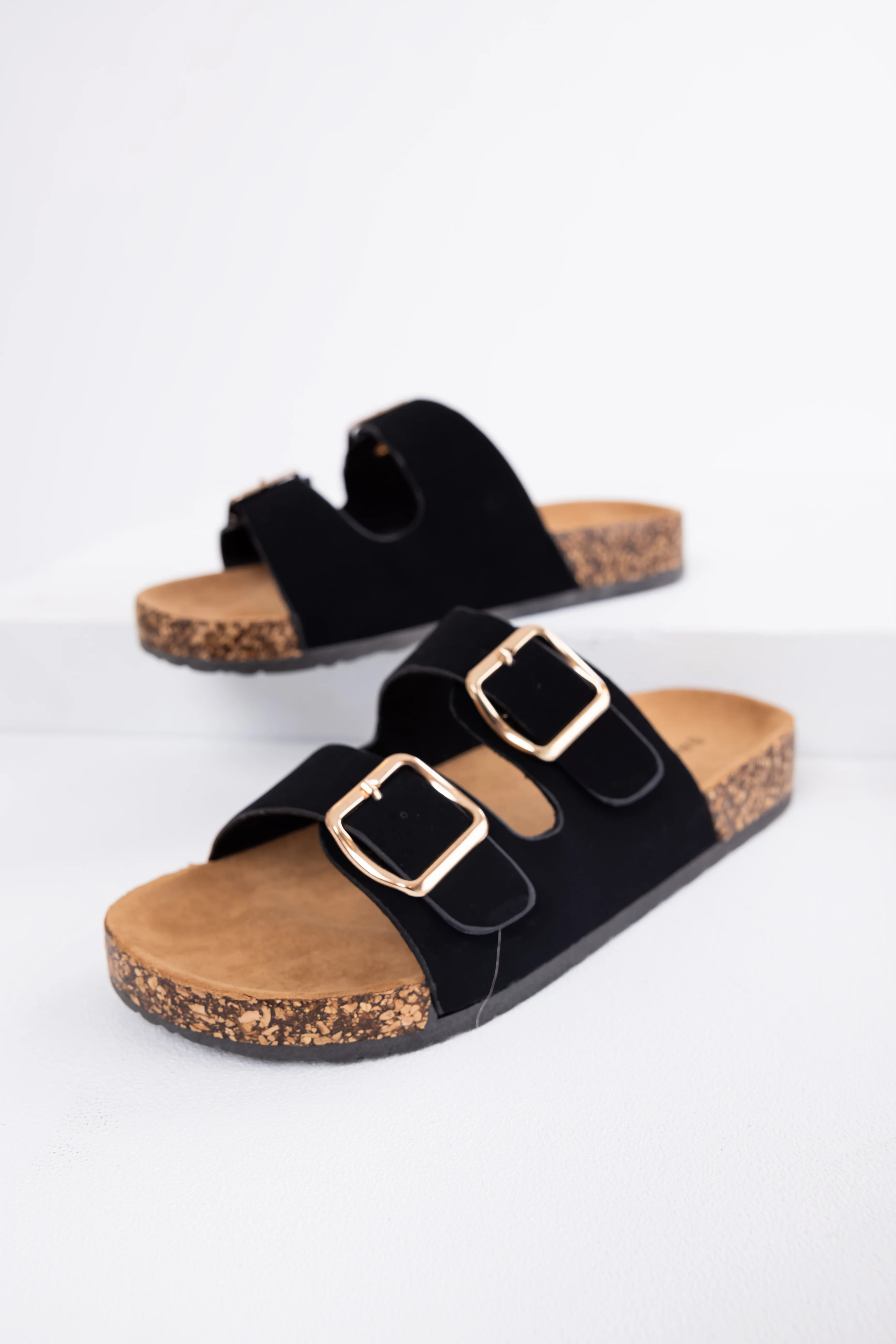 Black Double Buckle Slide On Sandals