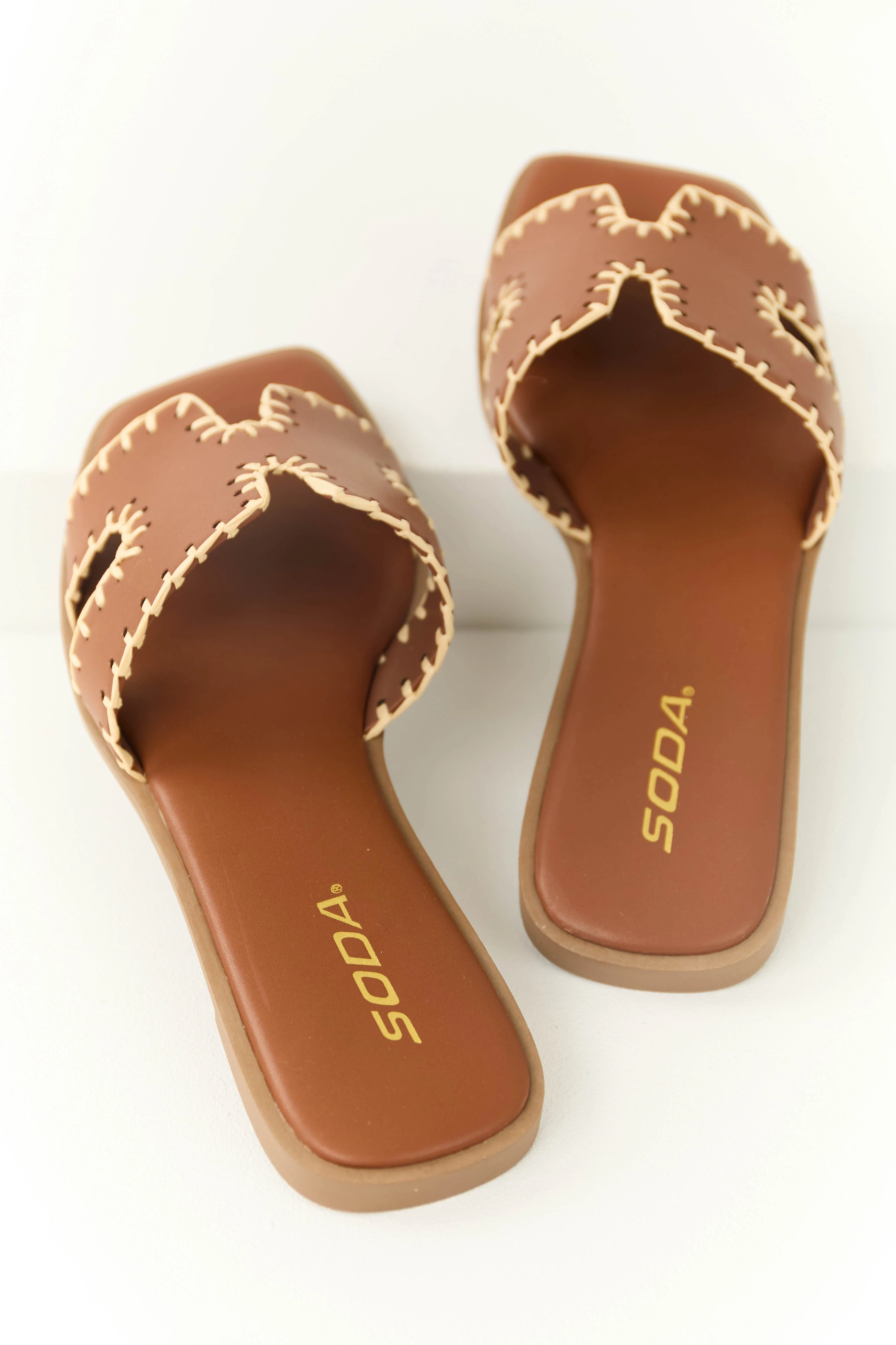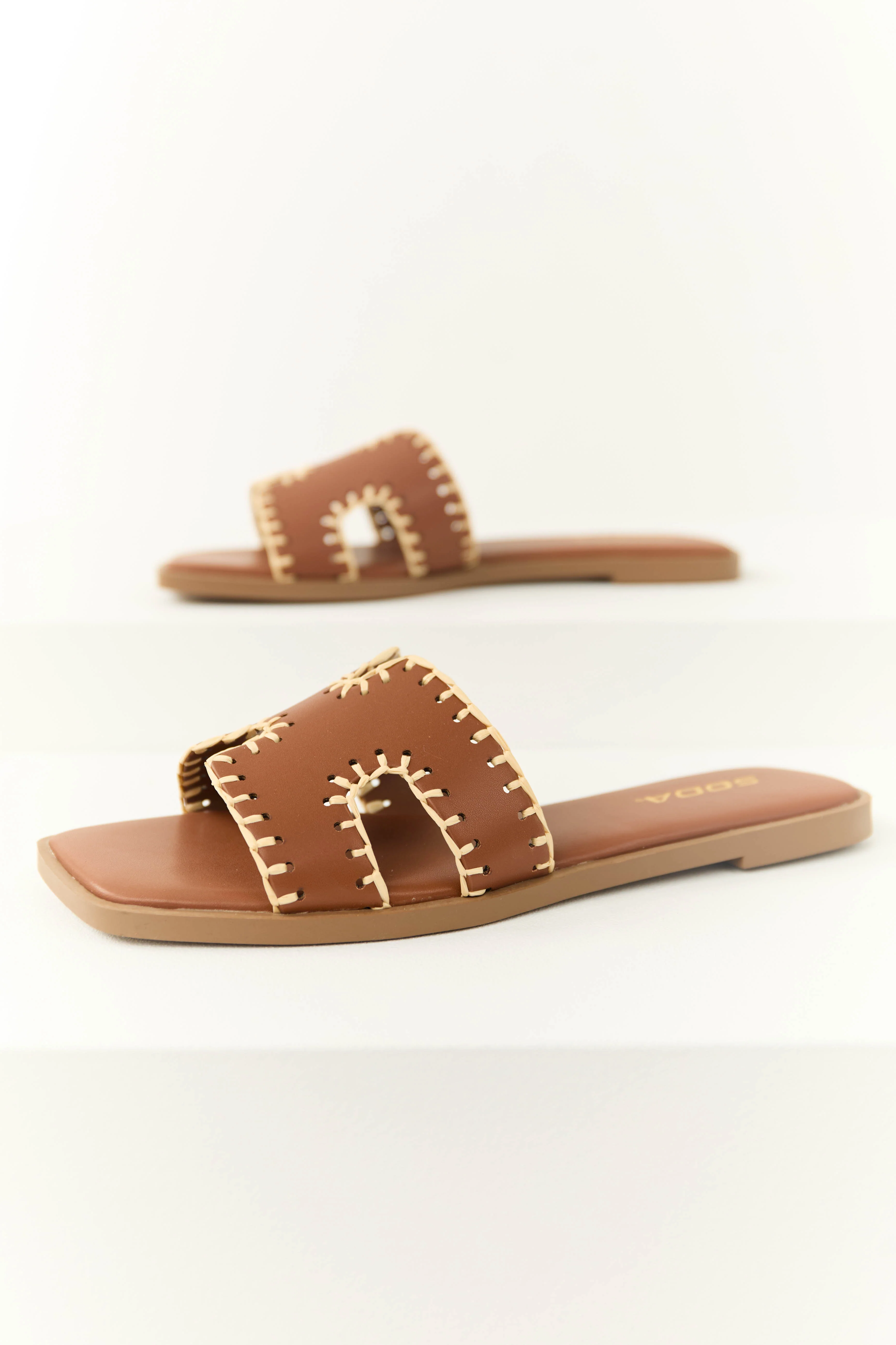 Sepia Straw Trim Cut Out Strap Slide Sandals