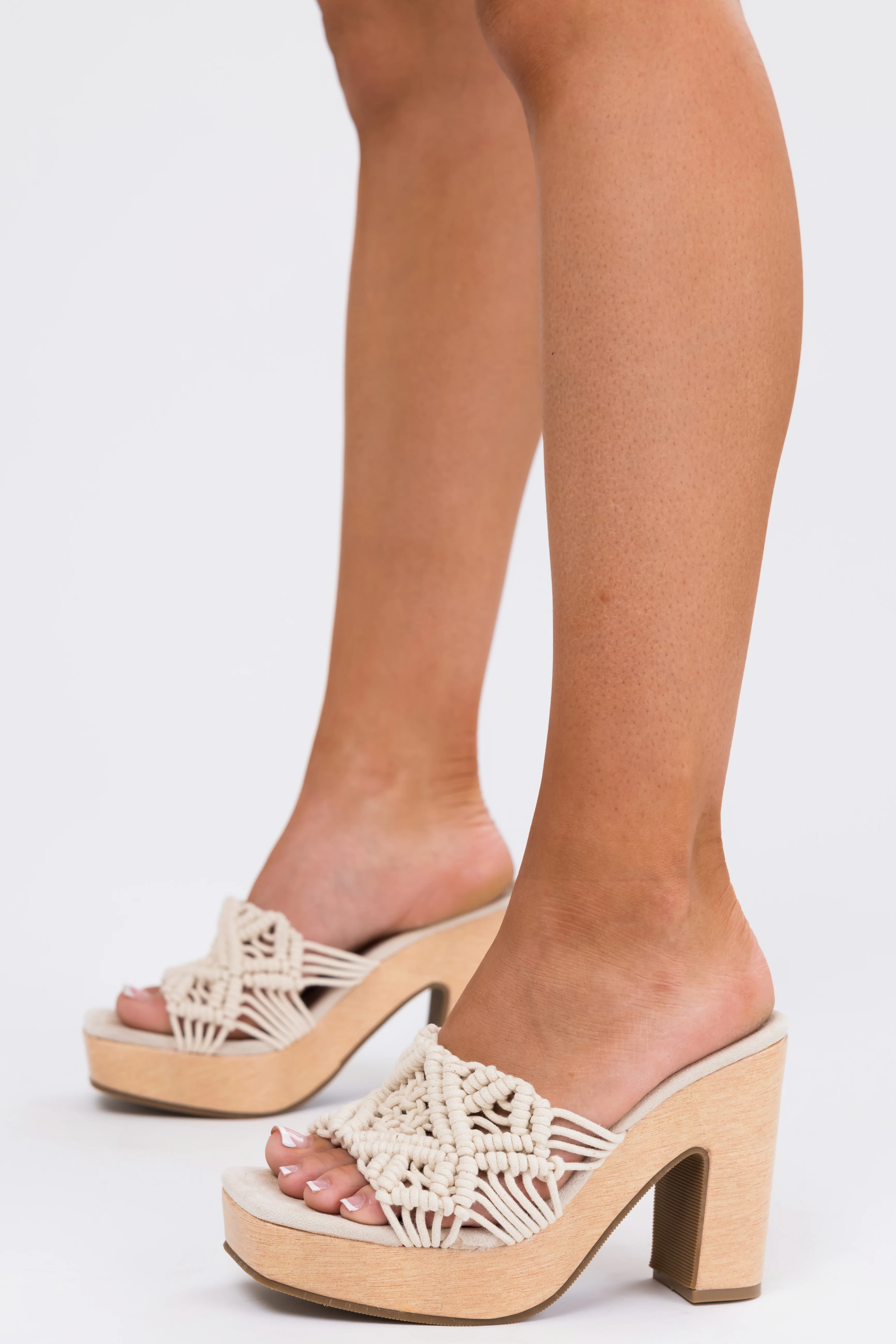 Ivory Crochet Strap Faux Wood Heels