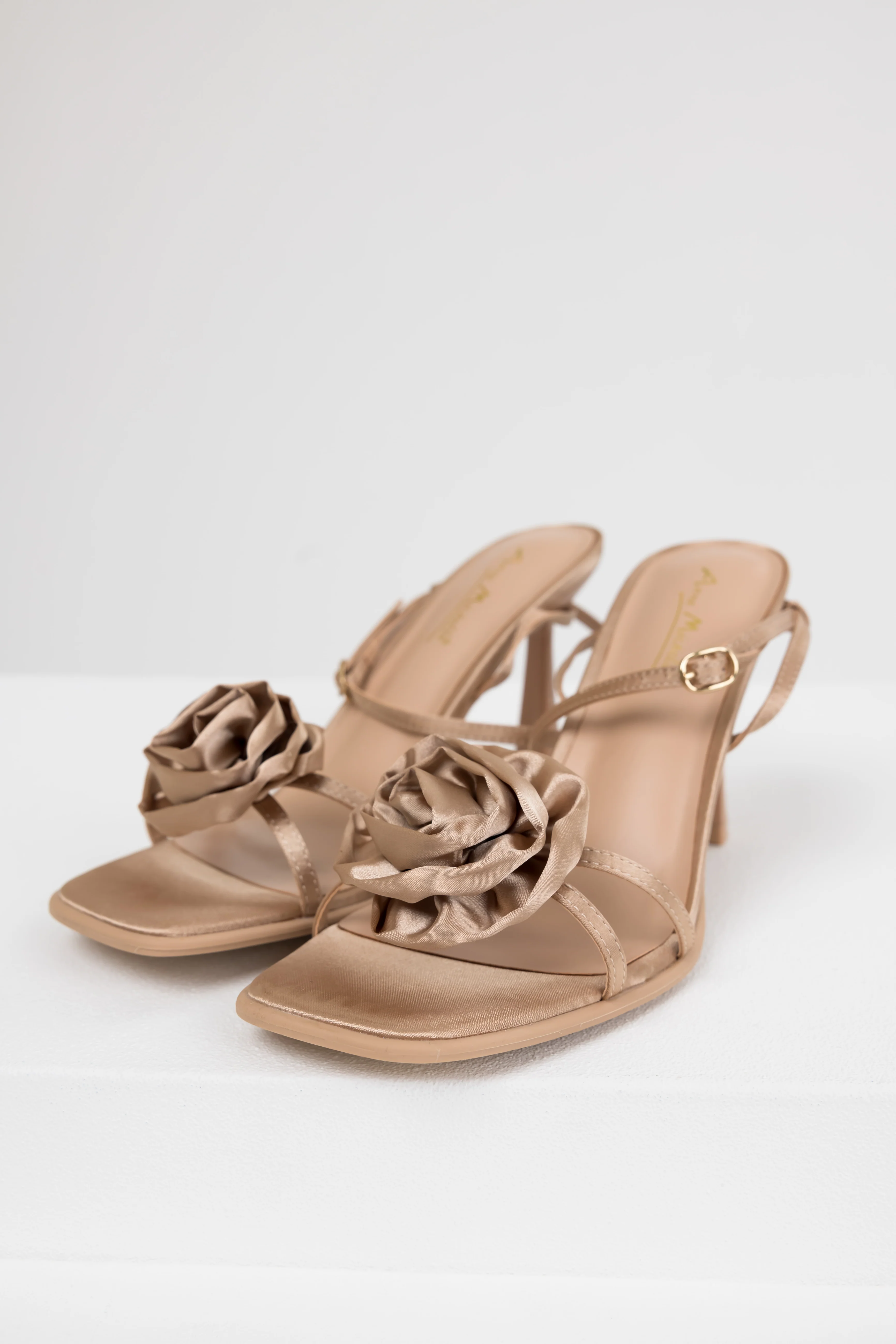 Camel Satin Flower Strap Dress Heels