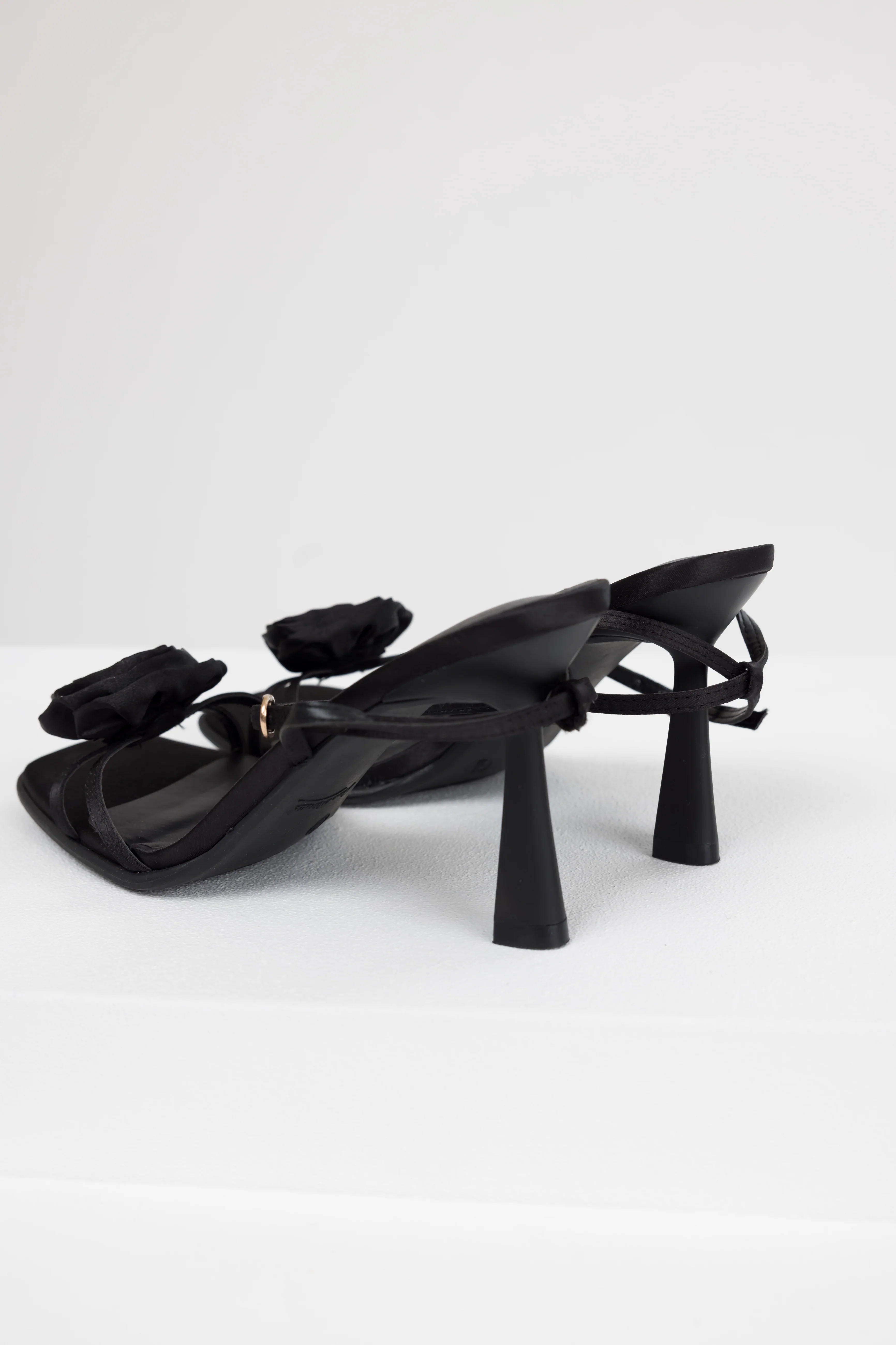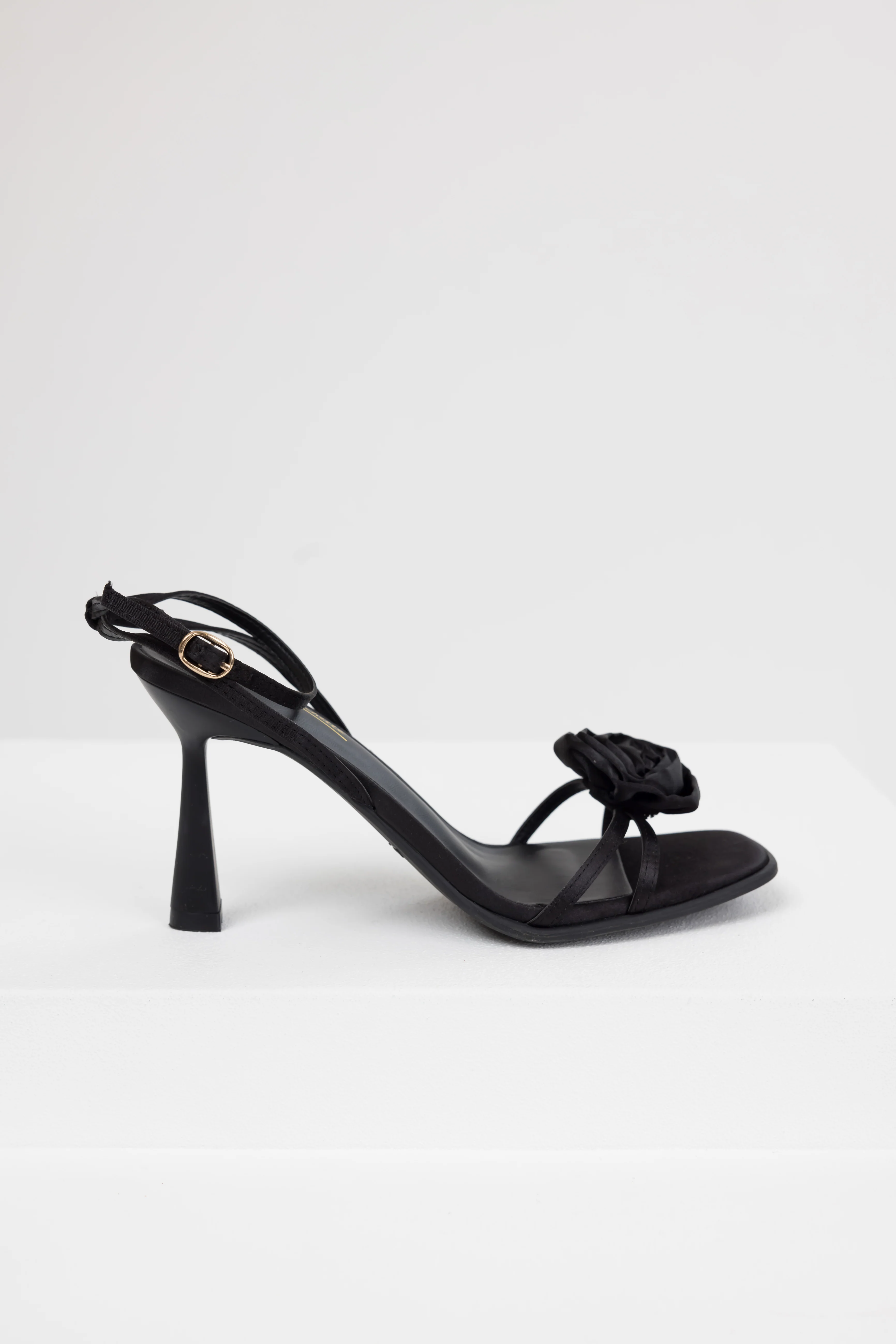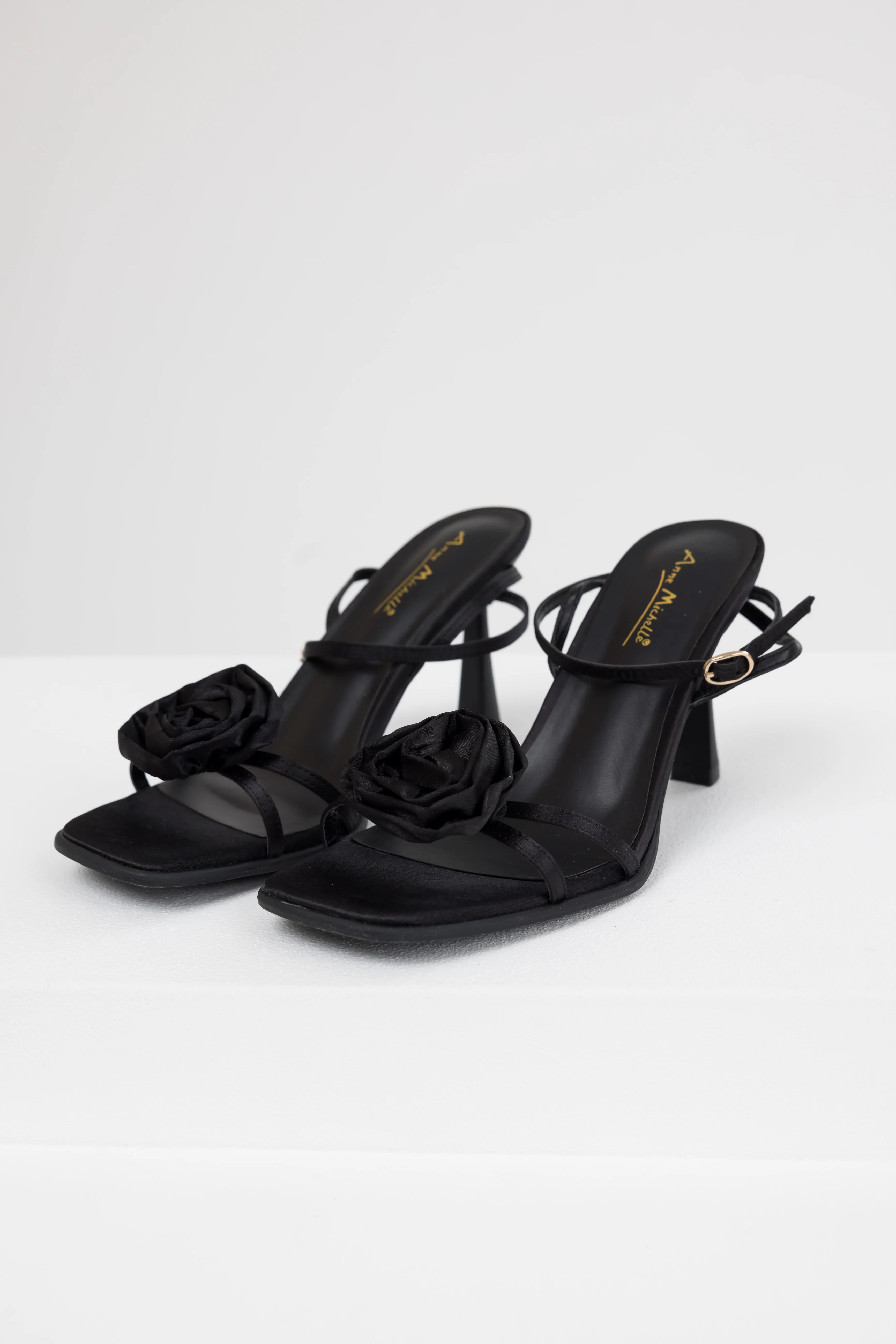 Black Satin Flower Strap Dress Heels