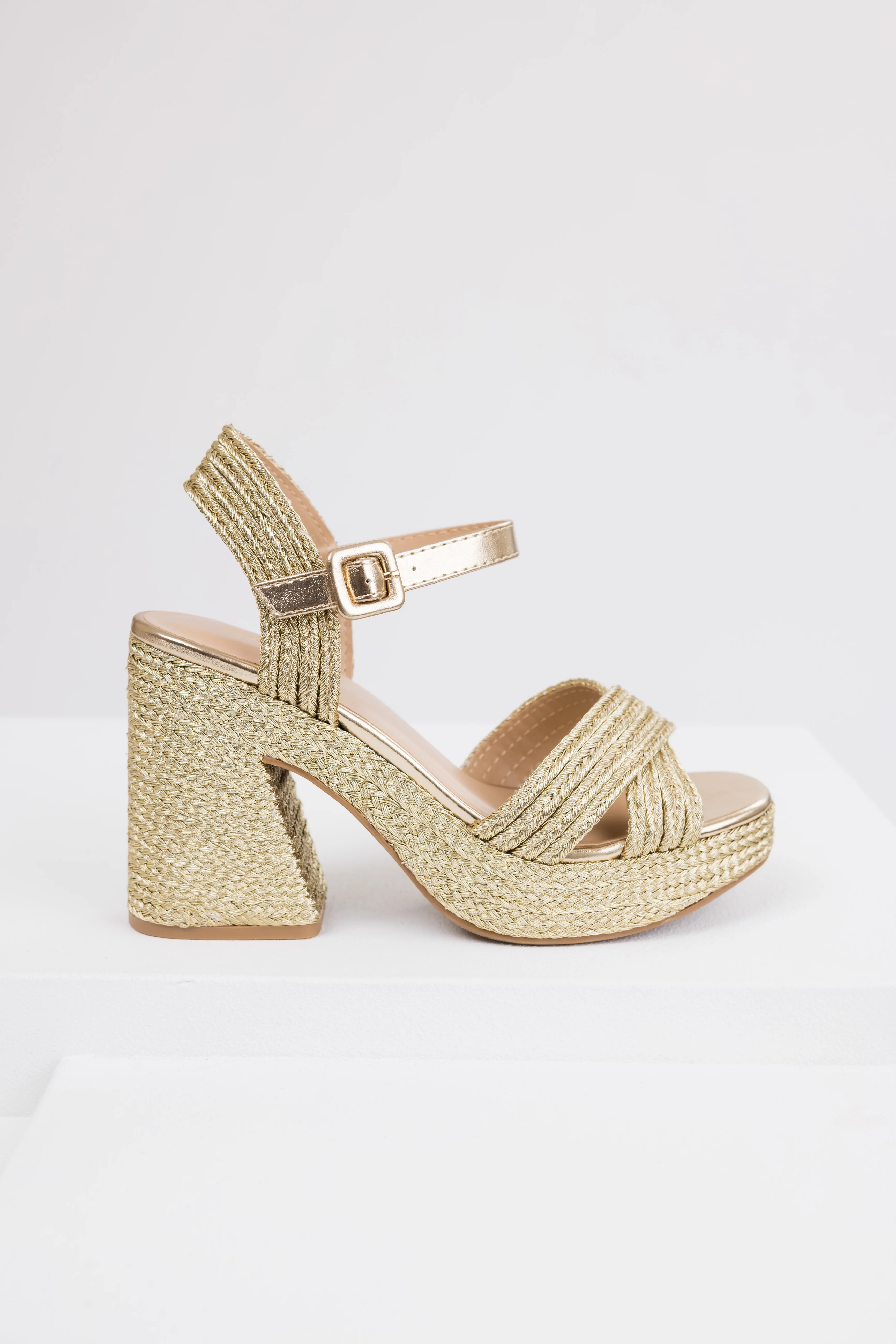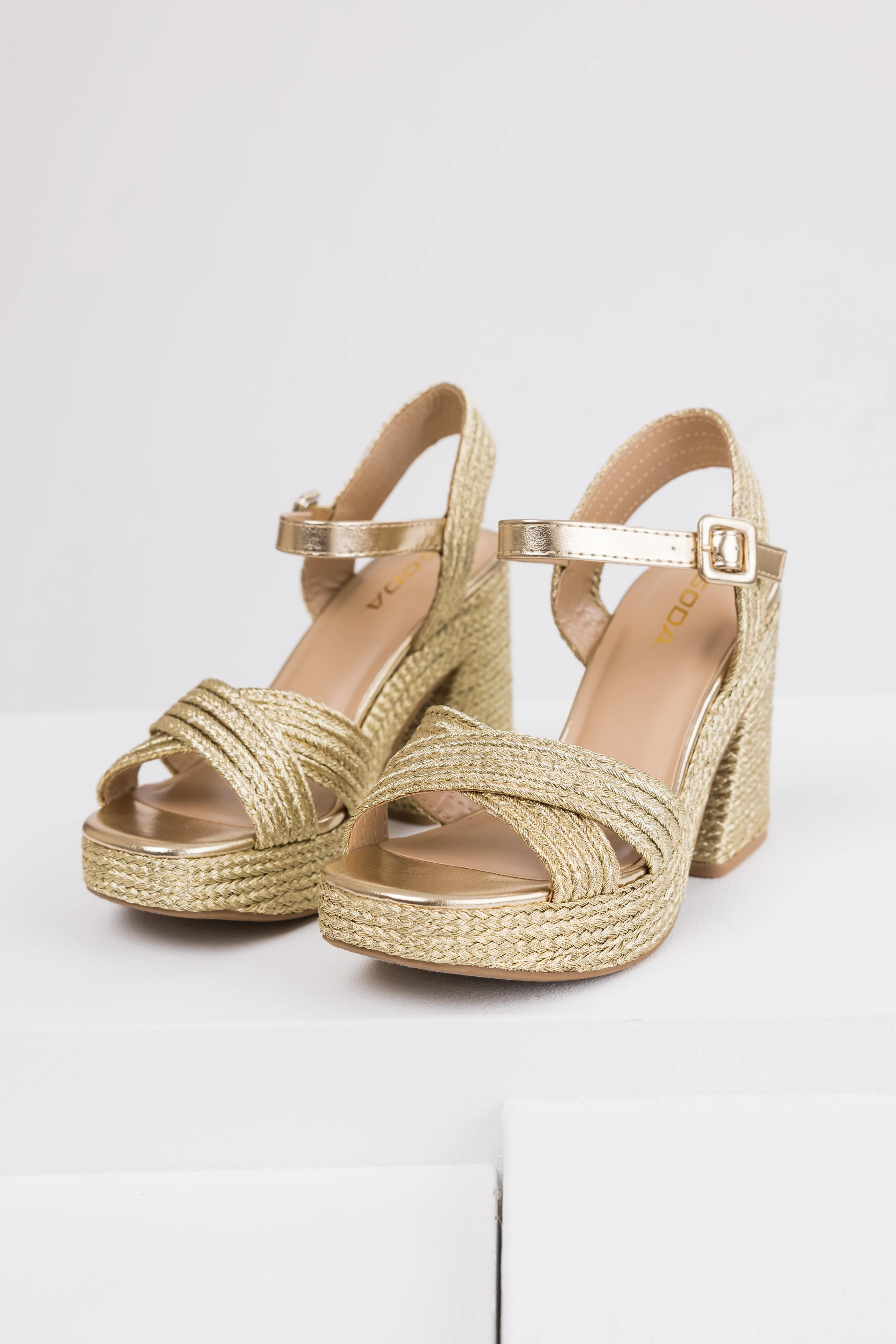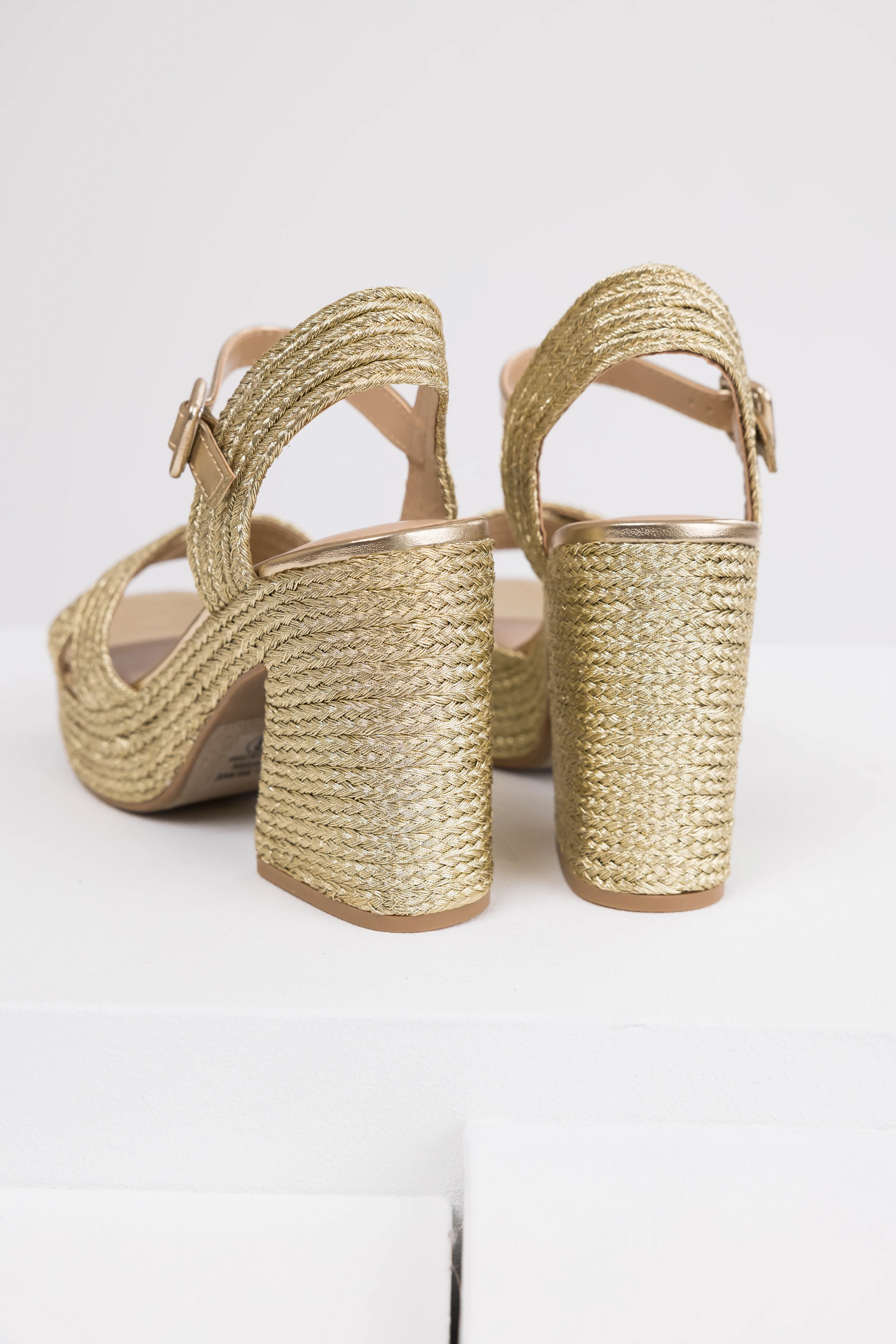 Gold Raffia Woven Open Toed Platform Heels