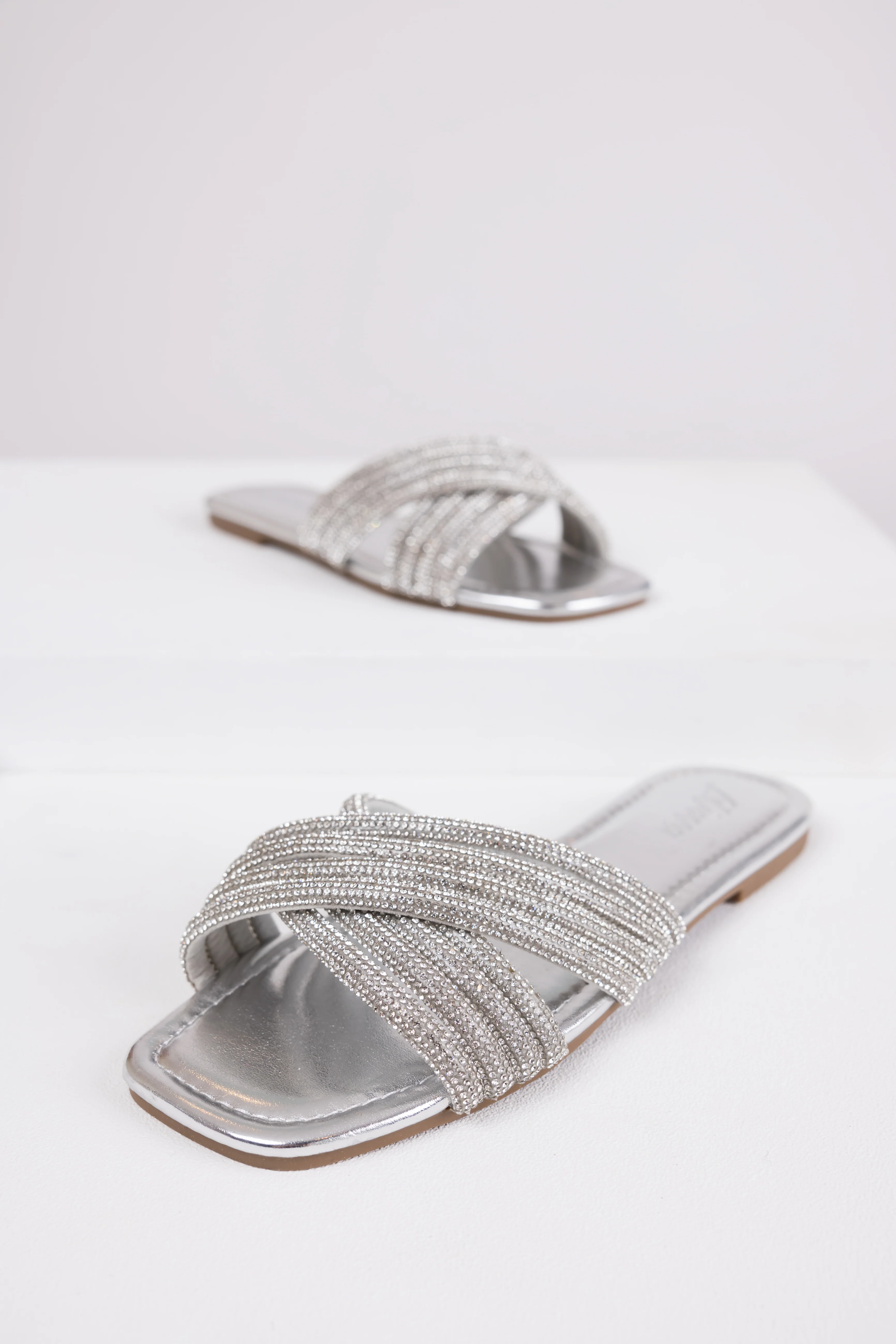 Silver Rhinestone Cross Strap Slide Sandals