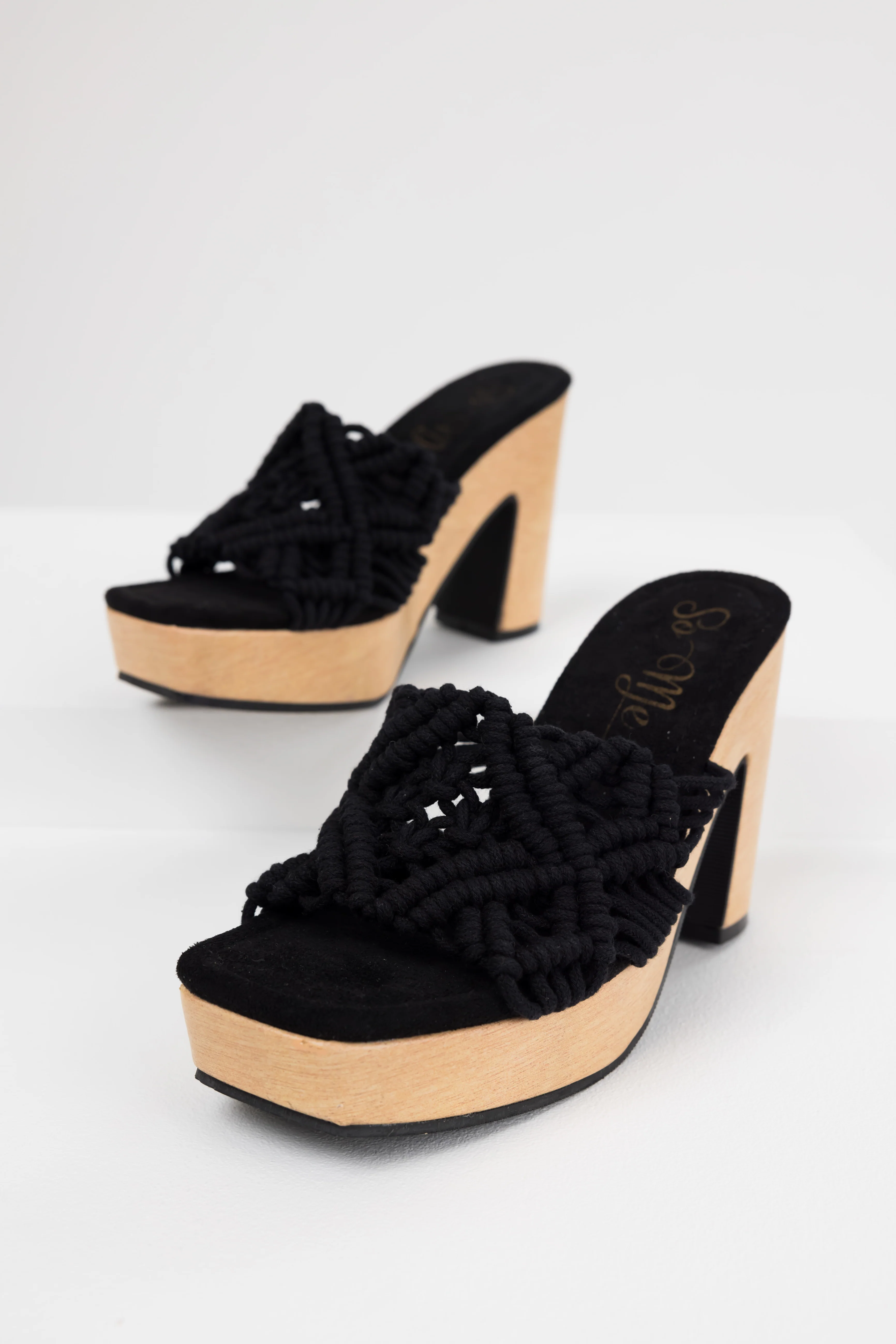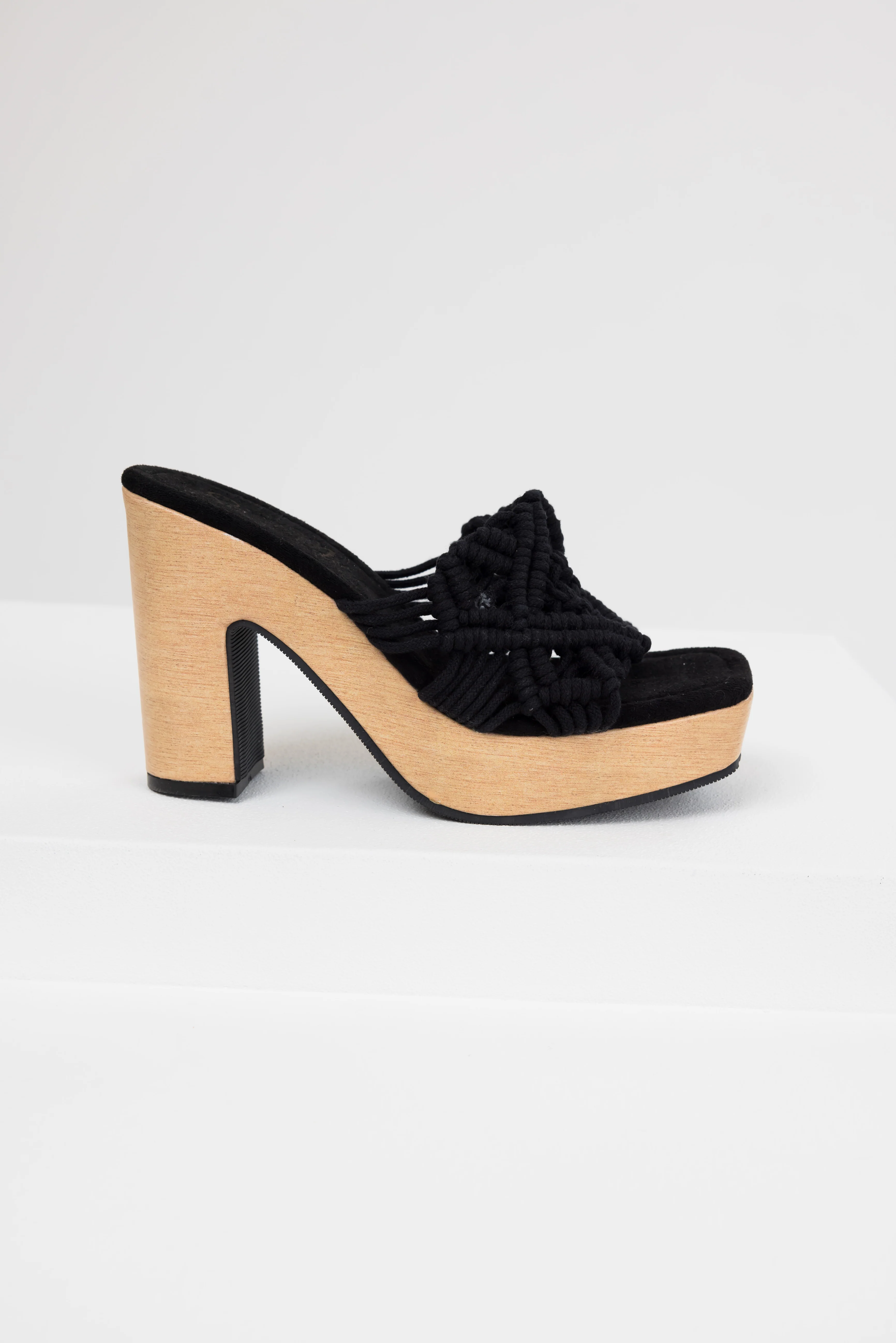 Black Crochet Strap Faux Wood Heels