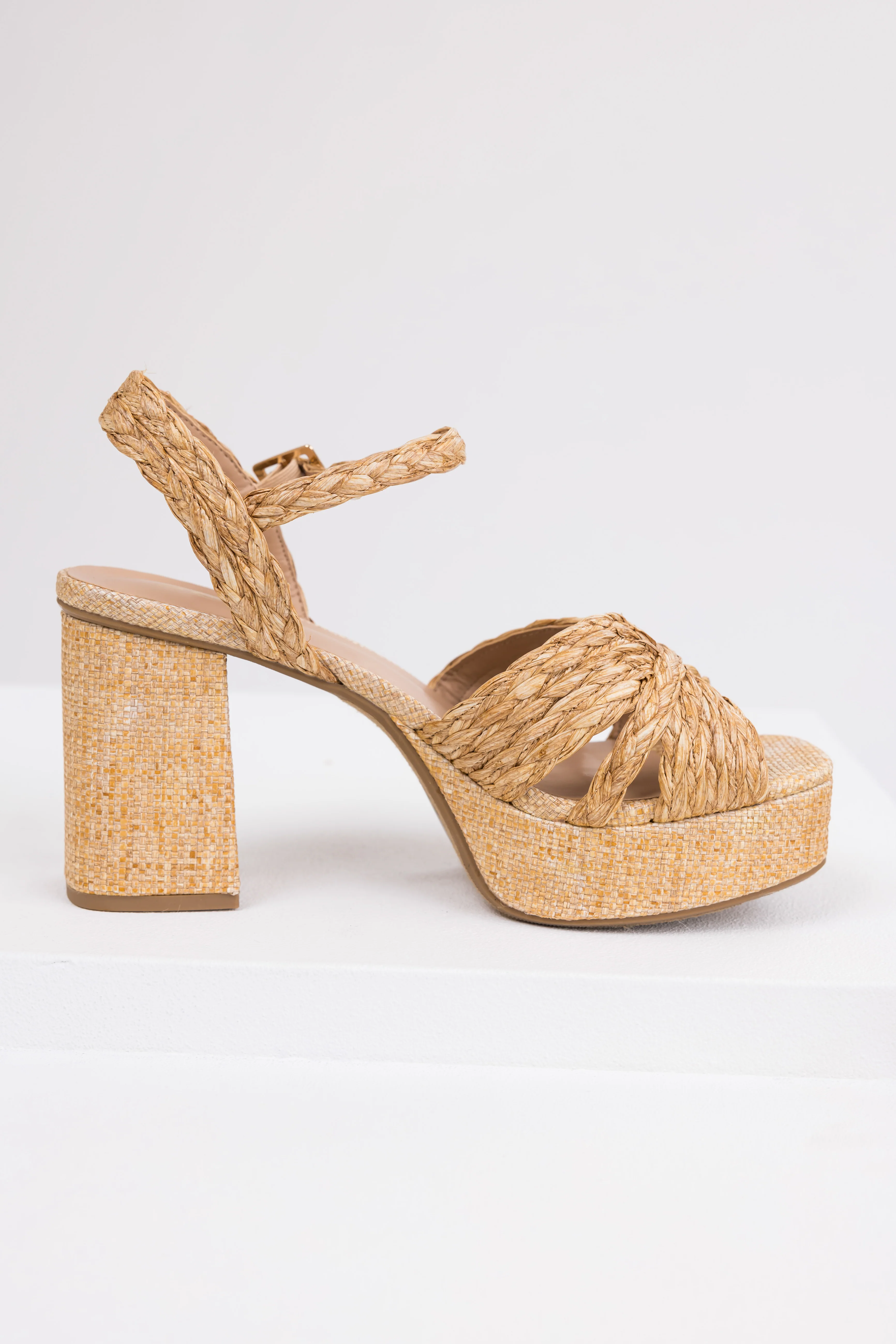 Beige Raffia Open Toe Block Heels