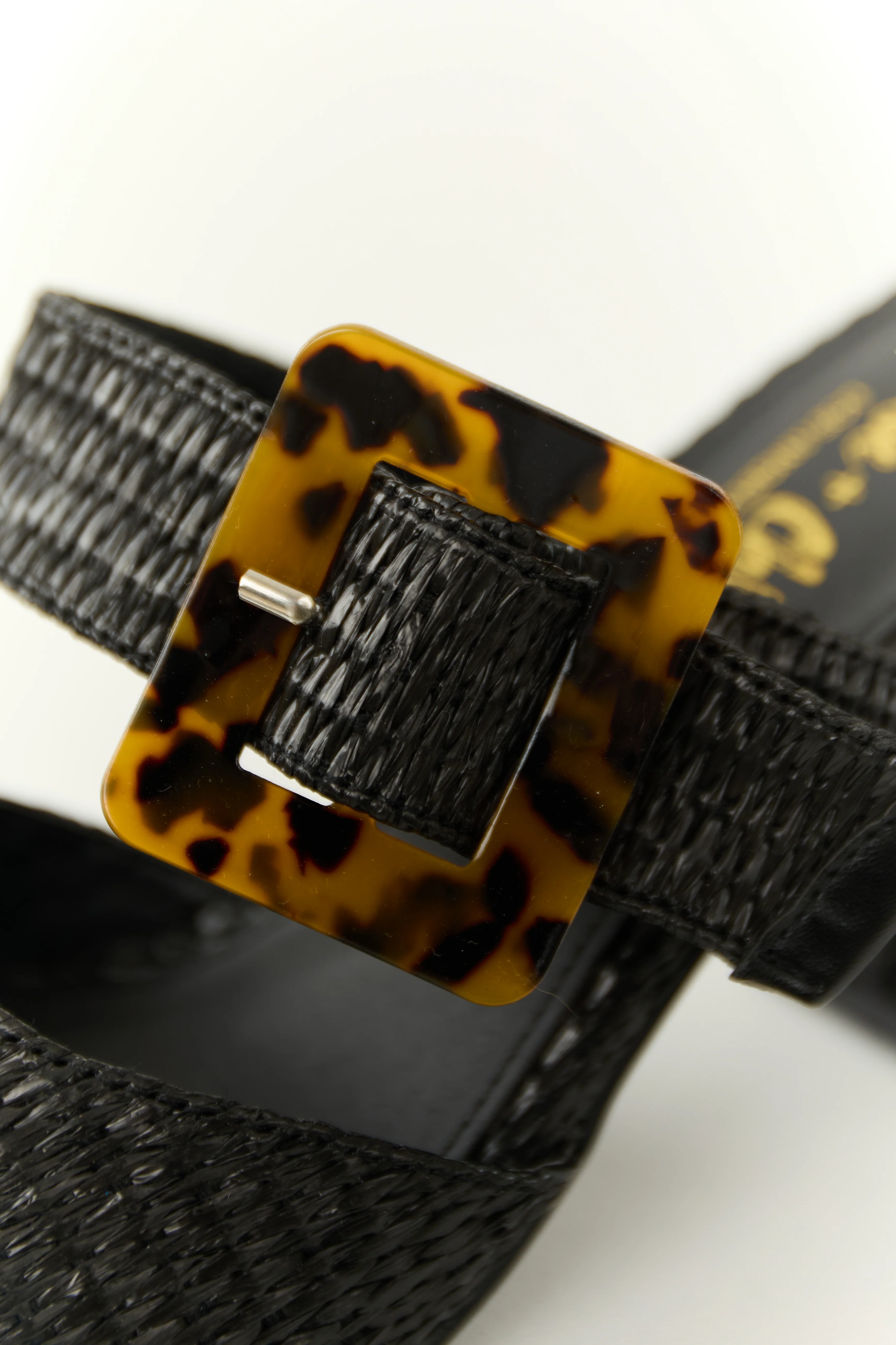 Black Open Toe Wedges with Gold Buckle Detail