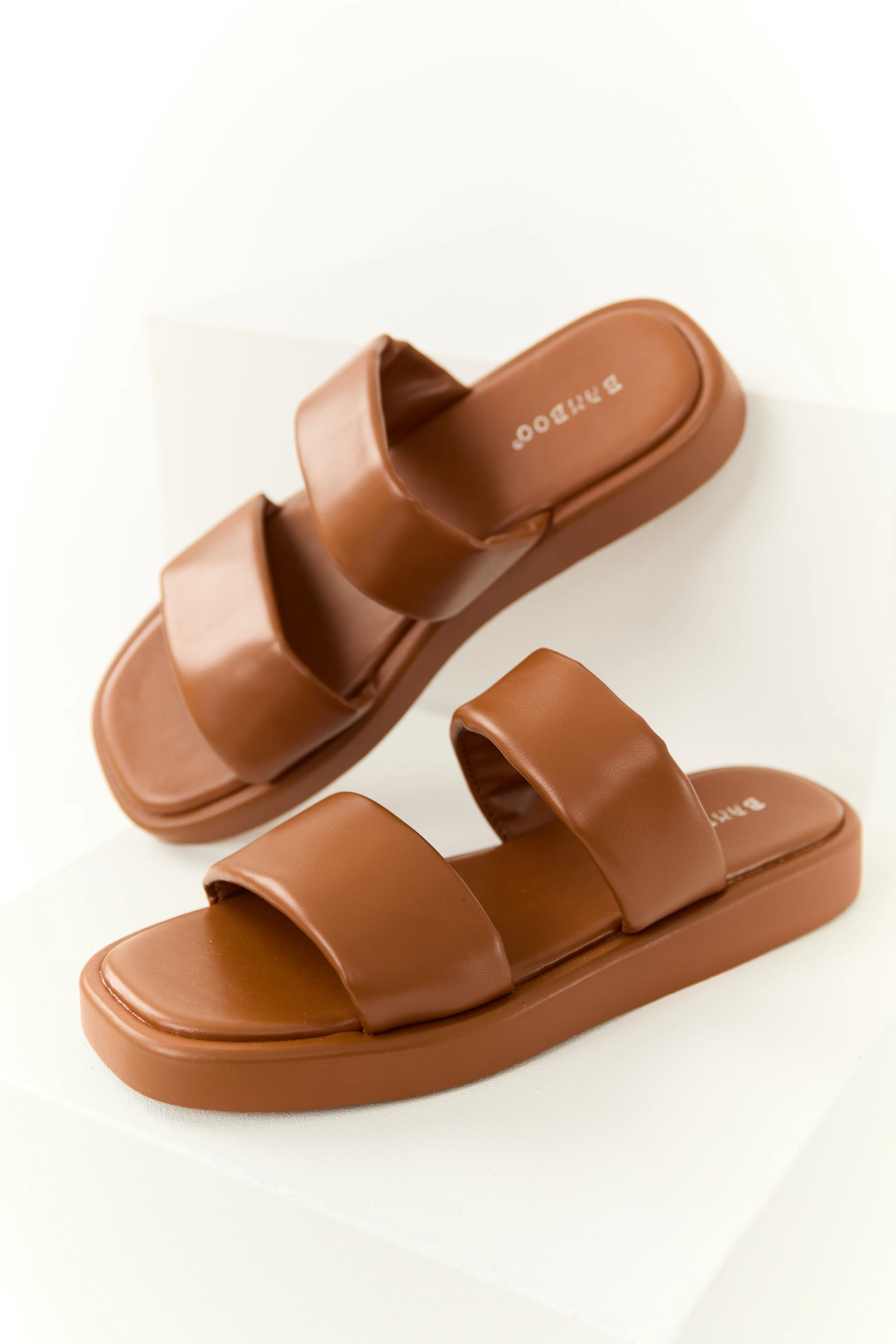 Cognac Thread Trim Buckle Cork Slide Sandals