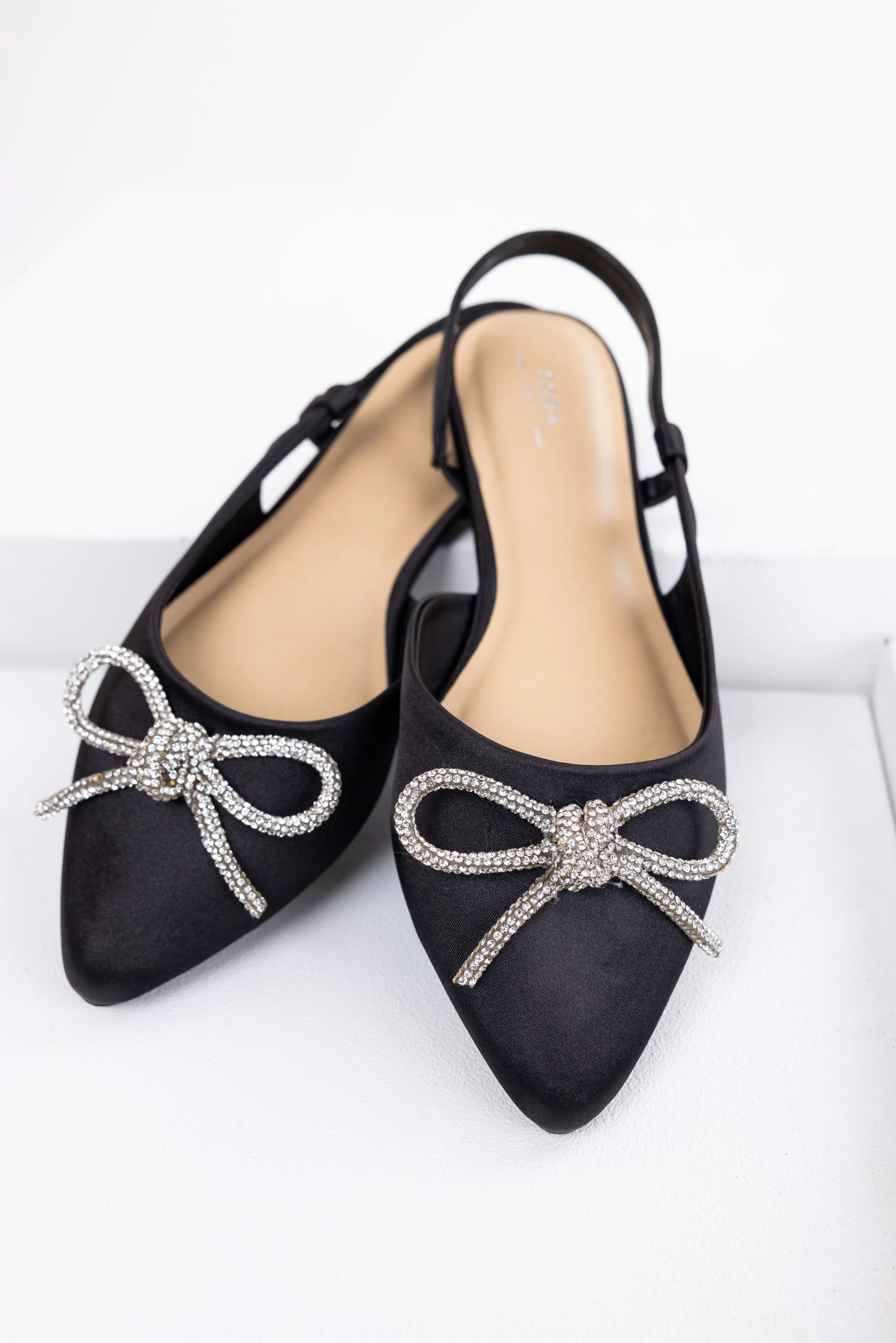 Black Pointed Toe Rhinestone Bow Flat Shoes