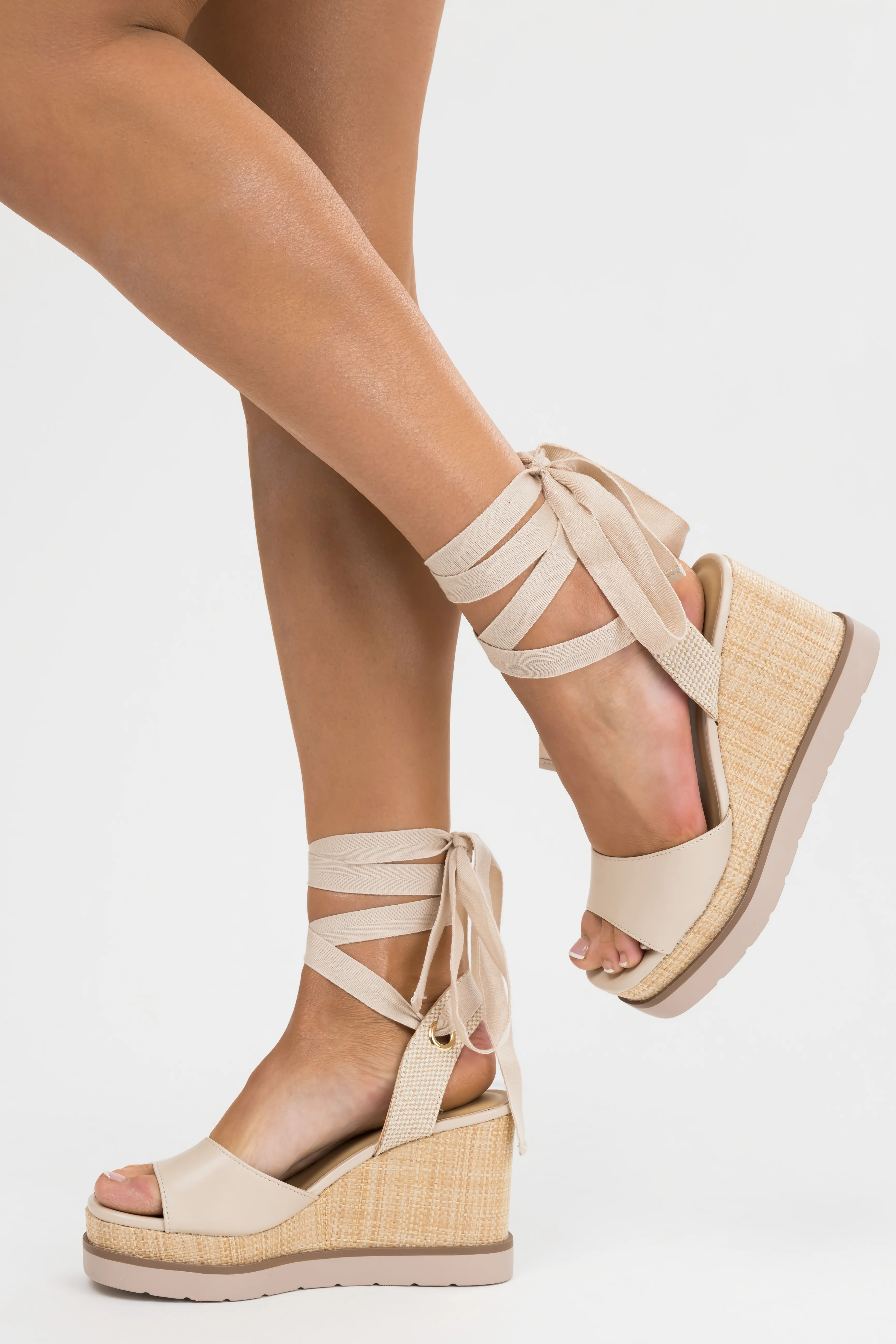 Almond Wrapped Ankle Raffia Platform Wedges