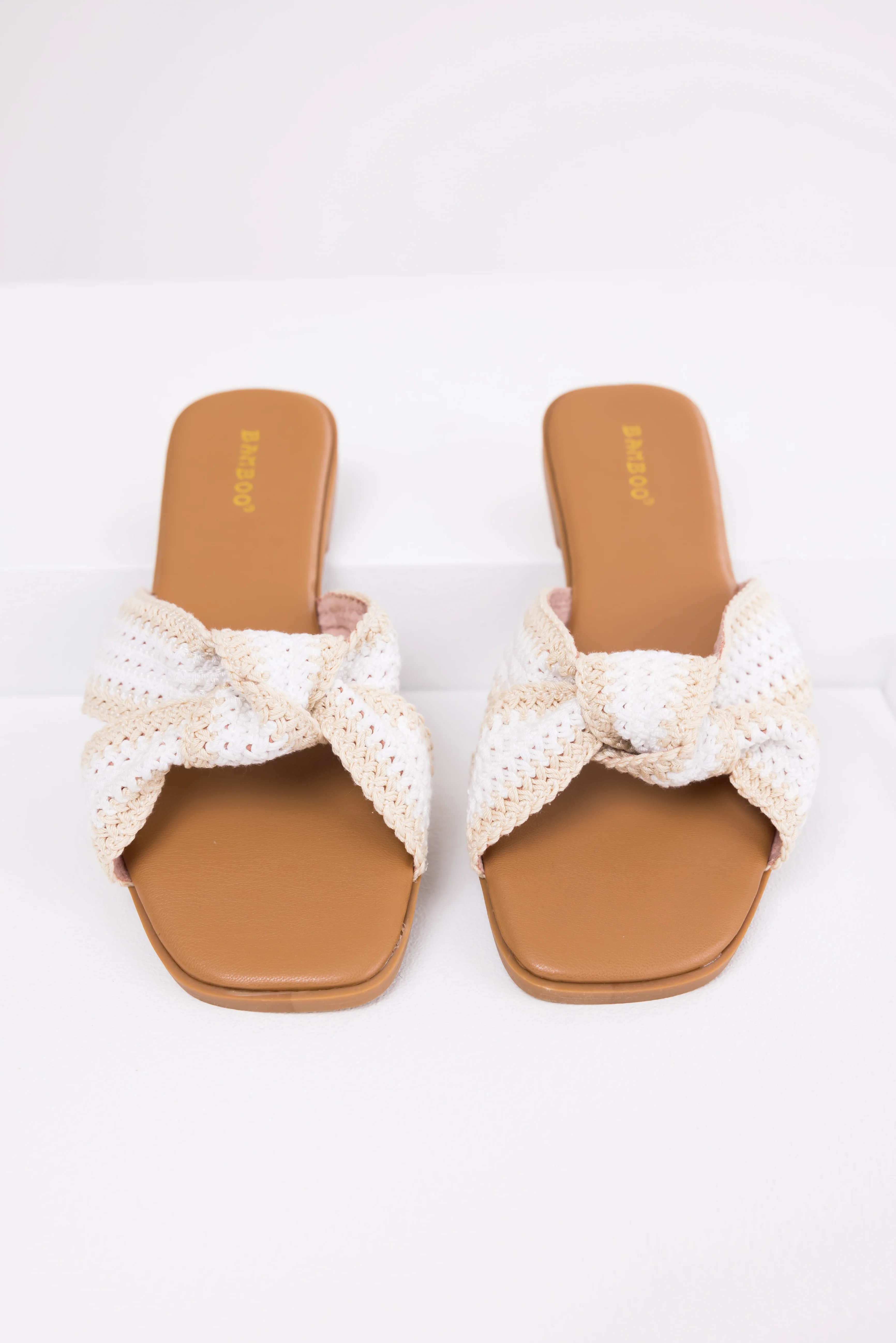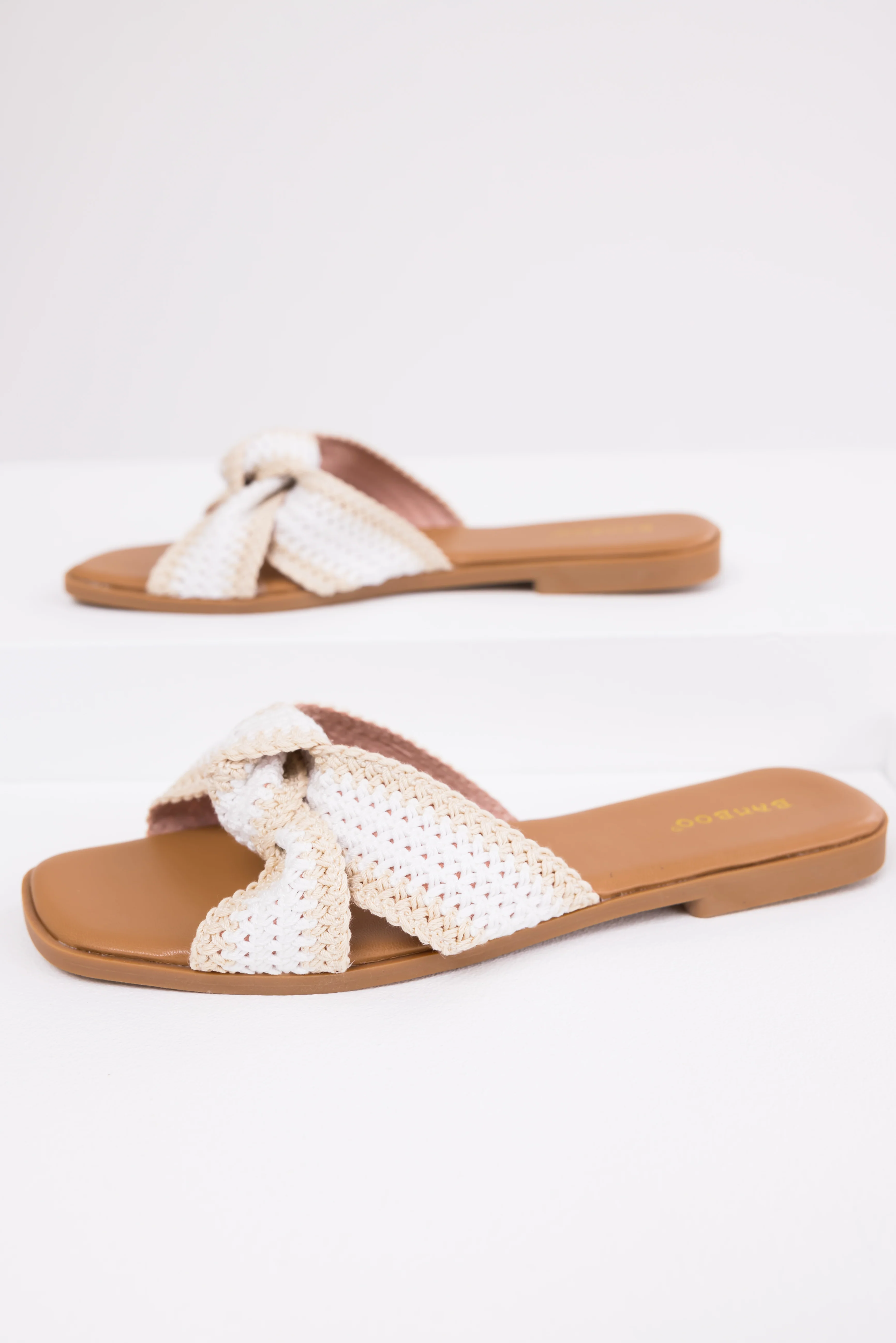 Cream Knit Strap Open Toe Flat Sandals