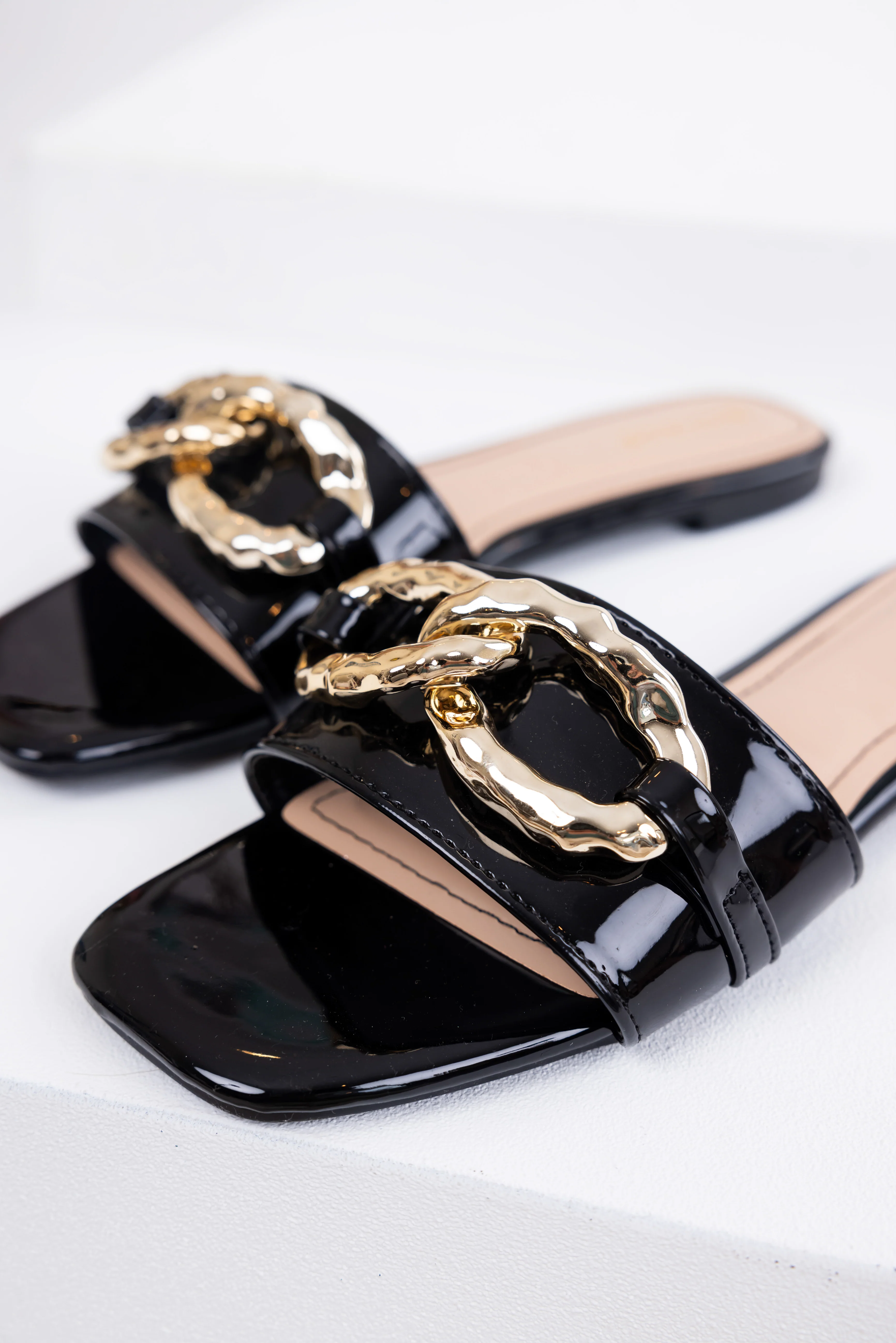 Black Patent Leather Link Chain Flat Sandals