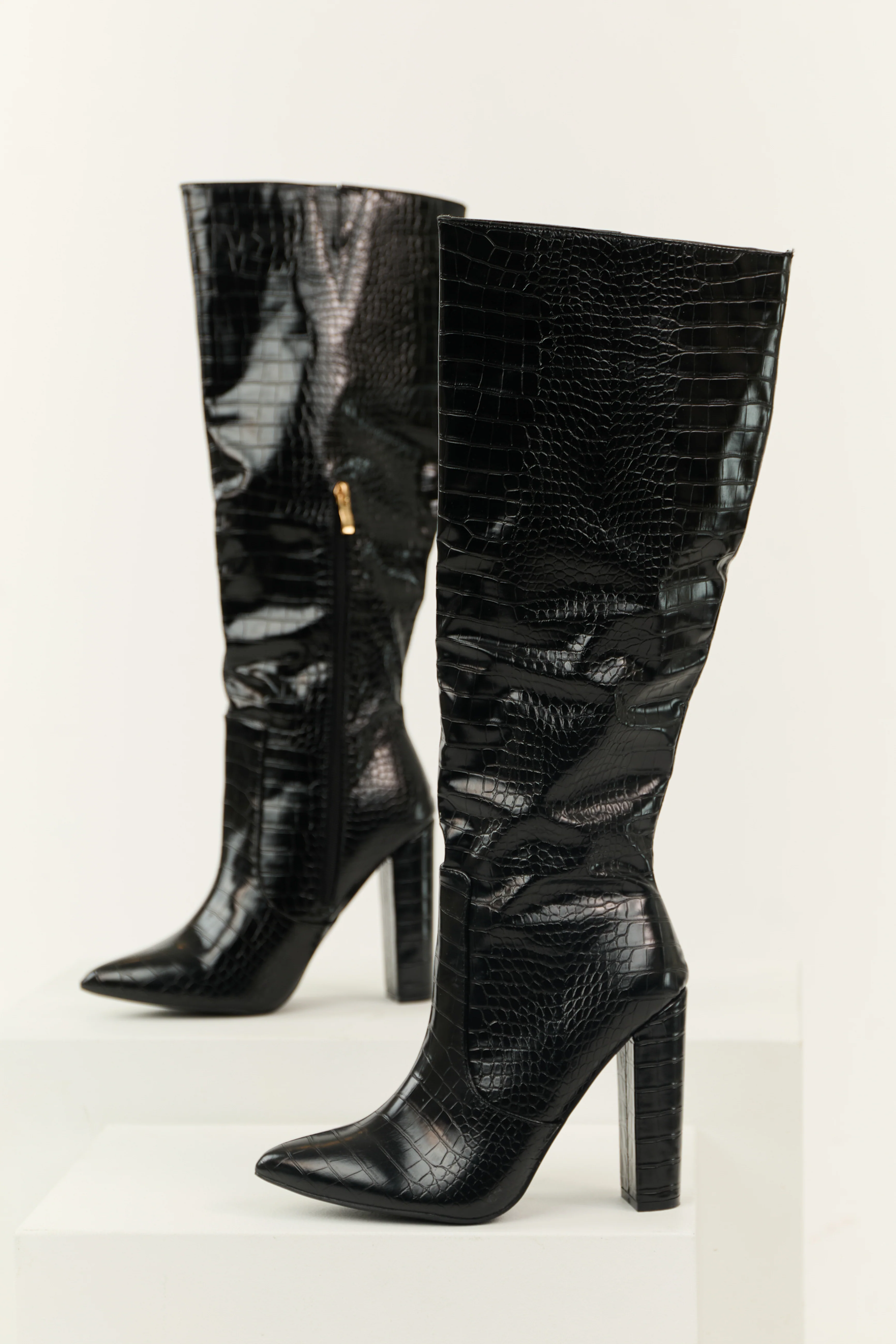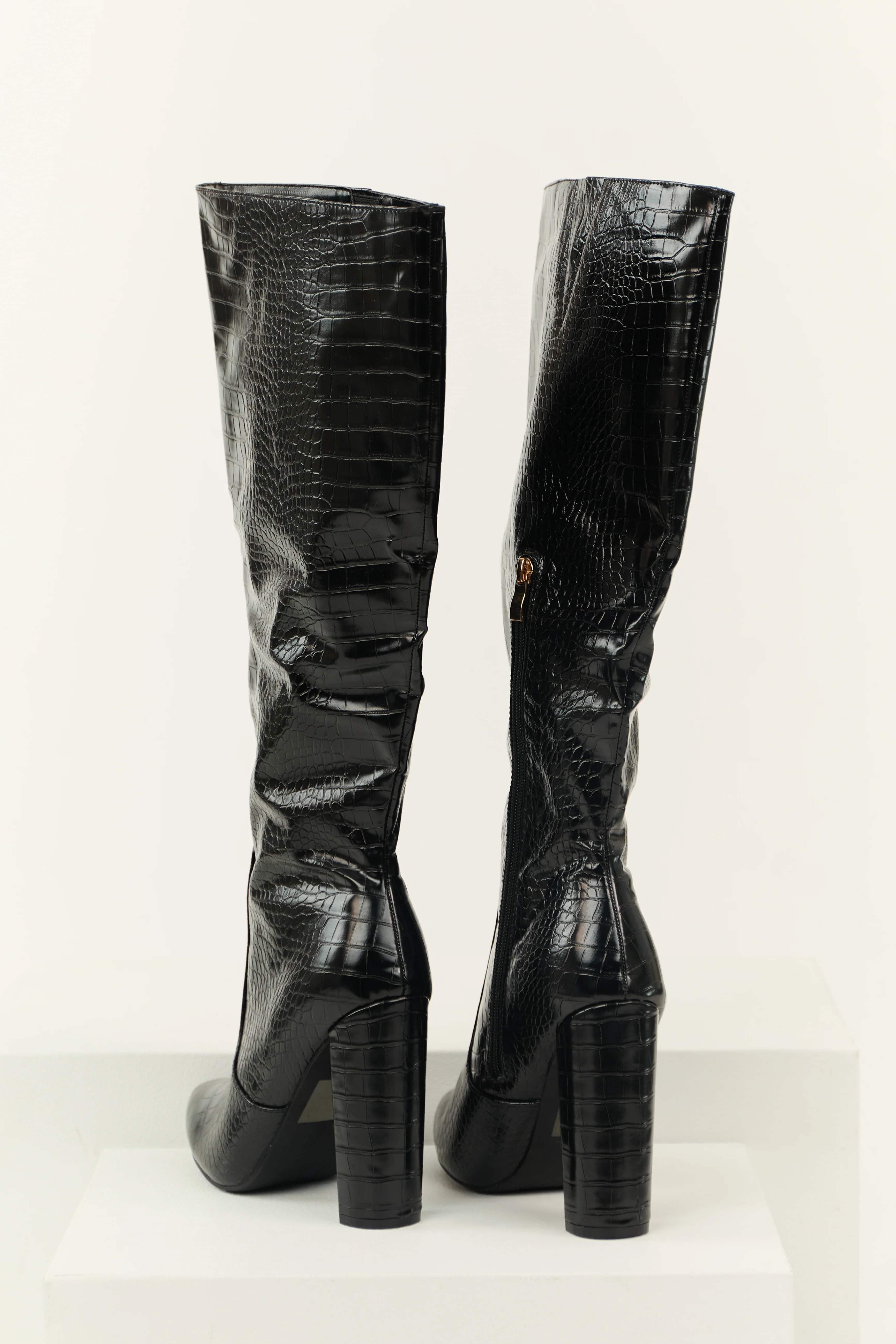 Black Faux Leather Crocodile Heeled Boots