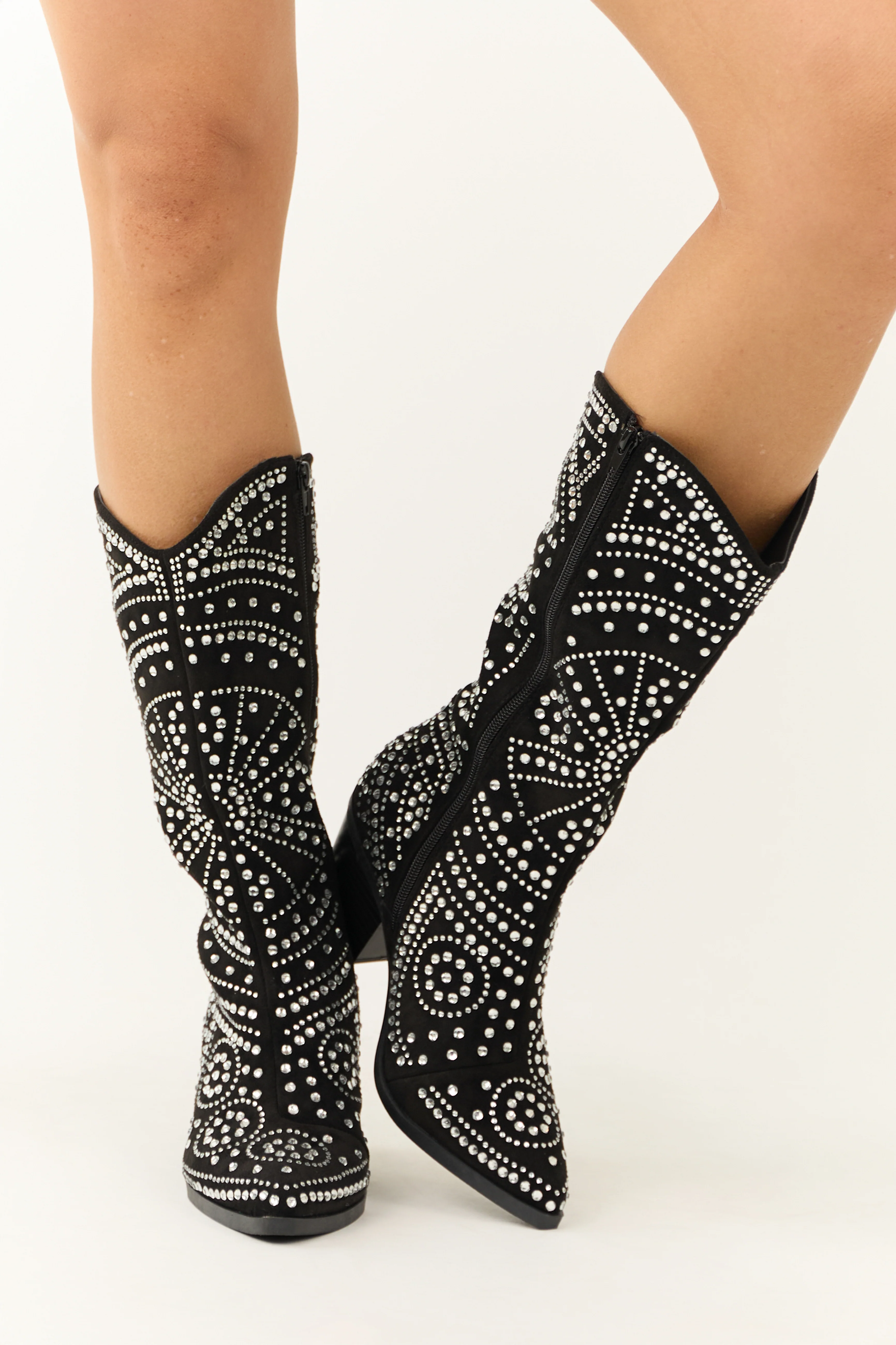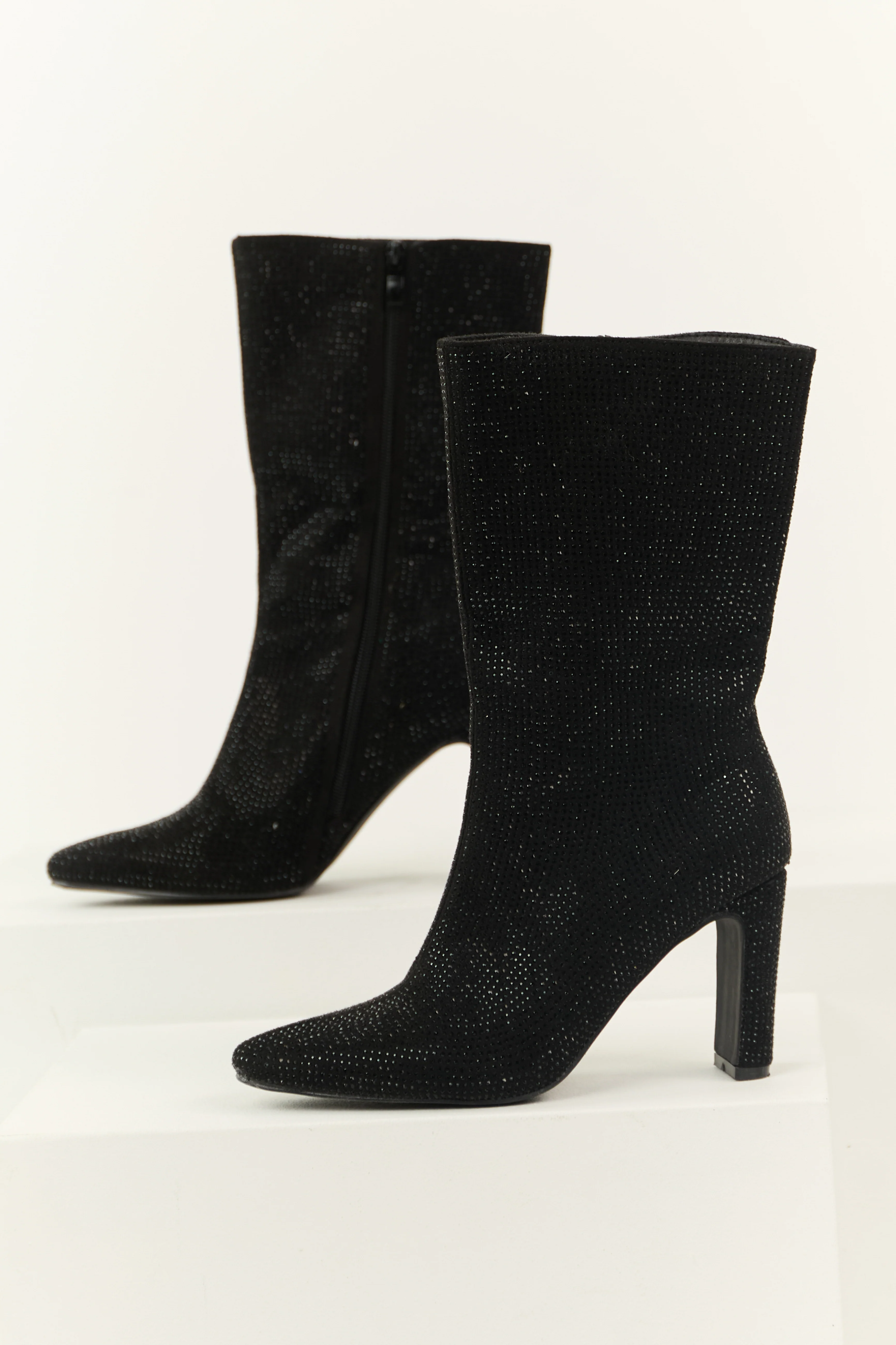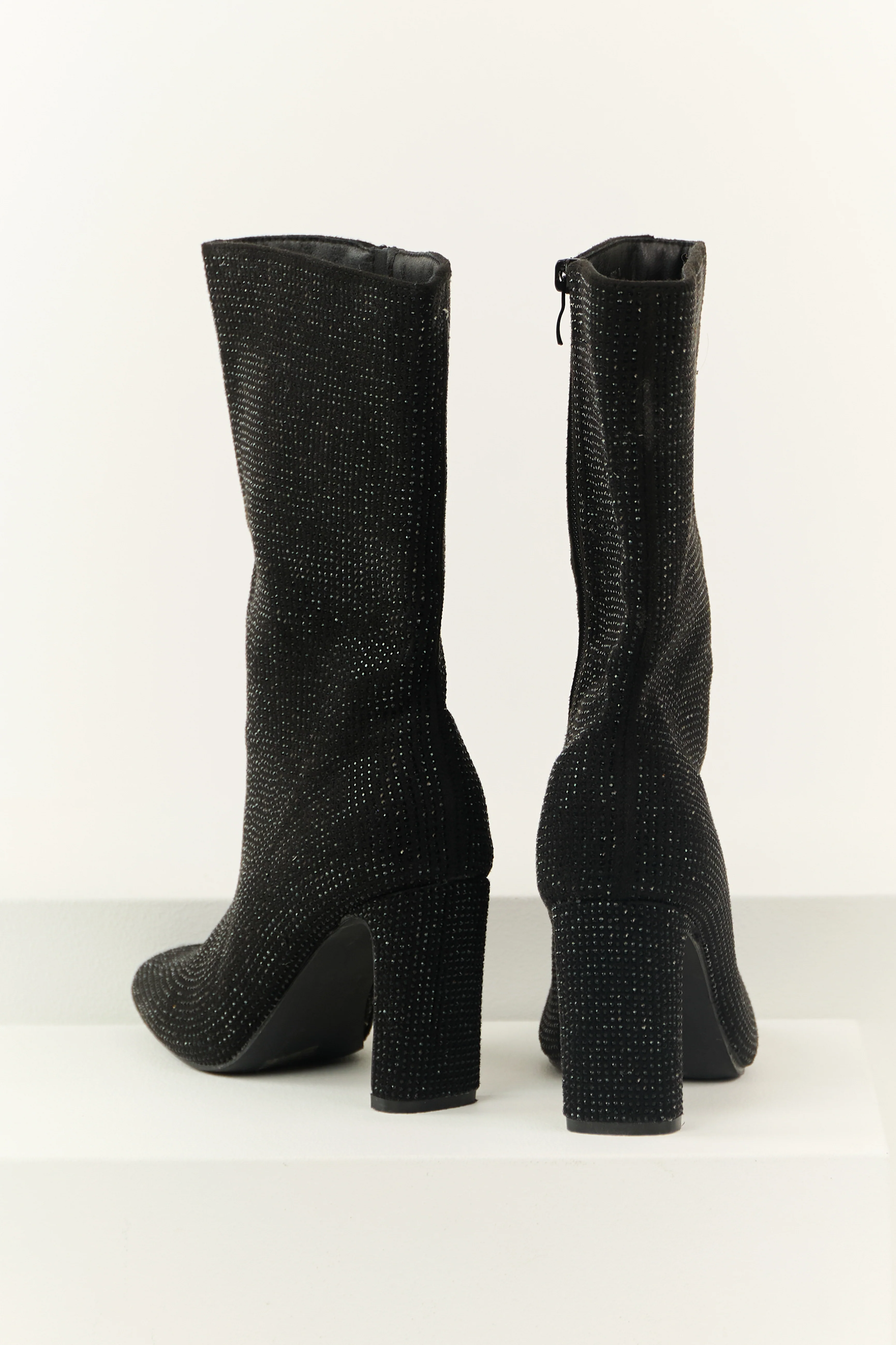 Black Rhinestone Zip Up Heeled Boots